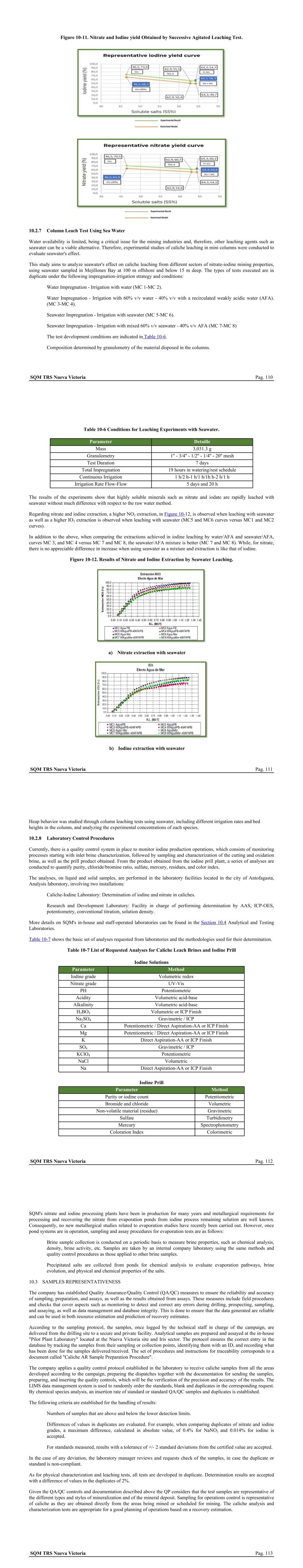 Figure 10-11. Nitrate and Iodine yield Obtained by Successive Agitated Leaching Test. 10.2.7 Column Leach Test Using Sea Water Water availability is limited, being a critical issue for the mining industries and, therefore, other leaching agents such as seawater can be a viable alternative. Therefore, experimental studies of caliche leaching in mini columns were conducted to evaluate seawater's effect. This study aims to analyze seawater's effect on caliche leaching from different sectors of nitrate-iodine mining properties, using seawater sampled in Mejillones Bay at 100 m offshore and below 15 m deep. The types of tests executed are in duplicate under the following impregnation-irrigation strategy and conditions: Water Impregnation - Irrigation with water (MC 1-MC 2). Water Impregnation - Irrigation with 60% v/v water - 40% v/v with a recirculated weakly acidic water (AFA). (MC 3-MC 4). Seawater Impregnation - Irrigation with seawater (MC 5-MC 6). Seawater Impregnation - Irrigation with mixed 60% v/v seawater - 40% v/v AFA (MC 7-MC 8) The test development conditions are indicated in Table 10-6. Composition determined by granulometry of the material disposed in the columns. SQM TRS Nueva Victoria Pag. 110 Table 10-6 Conditions for Leaching Experiments with Seawater. Parameter Detaille Mass 3,031.3 g Granulometry 1'' - 3/4'' - 1/2'' - 1/4'' - 20'' mesh Test Duration 7 days Total Impregnation 19 hours in watering/rest schedule Continuous Irrigation 1 h/2 h-1 h/1 h/1h h-2 h/1 h Irrigation Rate Flow-Flow 5 days and 20 h The results of the experiments show that highly soluble minerals such as nitrate and iodate are rapidly leached with seawater without much difference with respect to the raw water method. Regarding nitrate and iodine extraction, a higher NO3 extraction, in Figure 10-12, is observed when leaching with seawater as well as a higher IO3 extraction is observed when leaching with seawater (MC5 and MC6 curves versus MC1 and MC2 curves). In addition to the above, when comparing the extractions achieved in iodine leaching by water/AFA and seawater/AFA, curves MC 3, and MC 4 versus MC 7 and MC 8, the seawater/AFA mixture is better (MC 7 and MC 8). While, for nitrate, there is no appreciable difference in increase when using seawater as a mixture and extraction is like that of iodine. Figure 10-12. Results of Nitrate and Iodine Extraction by Seawater Leaching. a) Nitrate extraction with seawater b) Iodine extraction with seawater SQM TRS Nueva Victoria Pag. 111 Heap behavior was studied through column leaching tests using seawater, including different irrigation rates and bed heights in the column, and analyzing the experimental concentrations of each species. 10.2.8 Laboratory Control Procedures Currently, there is a quality control system in place to monitor iodine production operations, which consists of monitoring processes starting with inlet brine characterization, followed by sampling and characterization of the cutting and oxidation brine, as well as the prill product obtained. From the product obtained from the iodine prill plant, a series of analyses are conducted to quantify purity, chloride/bromine ratio, sulfate, mercury, residues, and color index. The analyses, on liquid and solid samples, are performed in the laboratory facilities located in the city of Antofagasta, Analysis laboratory, involving two installations: Caliche-Iodine Laboratory: Determination of iodine and nitrate in caliches. Research and Development Laboratory: Facility in charge of performing determination by AAS, ICP-OES, potentiometry, conventional titration, solution density. More details on SQM's in-house and staff-operated laboratories can be found in the Section 10.4 Analytical and Testing Laboratories. Table 10-7 shows the basic set of analyses requested from laboratories and the methodologies used for their determination. Table 10-7 List of Requested Analyses for Caliche Leach Brines and Iodine Prill Iodine Solutions Parameter Method Iodine grade Volumetric redox Nitrate grade UV-Vis PH Potentiometric Acidity Volumetric acid-base Alkalinity Volumetric acid-base H3BO3 Volumetric or ICP Finish Na2SO4 Gravimetric / ICP Ca Potentiometric / Direct Aspiration-AA or ICP Finish Mg Potentiometric / Direct Aspiration-AA or ICP Finish K Direct Aspiration-AA or ICP Finish SO4 Gravimetric / ICP KClO4 Potentiometric NaCl Volumetric Na Direct Aspiration-AA or ICP Finish Iodine Prill Parameter Method Purity or iodine count Potentiometric Bromide and chloride Volumetric Non-volatile material (residue) Gravimetric Sulfate Turbidimetry Mercury Spectrophotometry Coloration Index Colorimetric SQM TRS Nueva Victoria Pag. 112 SQM's nitrate and iodine processing plants have been in production for many years and metallurgical requirements for processing and recovering the nitrate from evaporation ponds from iodine process remaining solution are well known. Consequently, no new metallurgical studies related to evaporation studies have recently been carried out. However, once pond systems are in operation, sampling and assay procedures for evaporation tests are as follows: Brine sample collection is conducted on a periodic basis to measure brine properties, such as chemical analysis, density, brine activity, etc. Samples are taken by an internal company laboratory using the same methods and quality control procedures as those applied to other brine samples. Precipitated salts are collected from ponds for chemical analysis to evaluate evaporation pathways, brine evolution, and physical and chemical properties of the salts. 10.3 SAMPLES REPRESENTATIVENESS The company has established Quality Assurance/Quality Control (QA/QC) measures to ensure the reliability and accuracy of sampling, preparation, and assays, as well as the results obtained from assays. These measures include field procedures and checks that cover aspects such as monitoring to detect and correct any errors during drilling, prospecting, sampling, and assaying, a