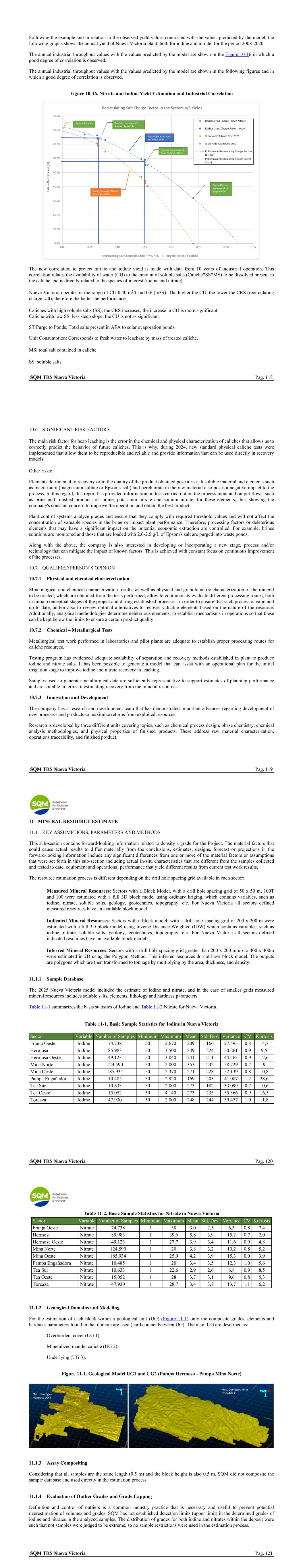 Following the example and in relation to the observed yield values contrasted with the values predicted by the model, the following graphs shows the annual yield of Nueva Victoria plant, both for iodine and nitrate, for the period 2008-2020. The annual industrial throughput values with the values predicted by the model are shown in the Figure 10-16 in which a good degree of correlation is observed. The annual industrial throughput values with the values predicted by the model are shown in the following figures and in which a good degree of correlation is observed. Figure 10-16. Nitrate and Iodine Yield Estimation and Industrial Correlation The new correlation to project nitrate and iodine yield is made with data from 10 years of industrial operation. This correlation relates the availability of water (CU) to the amount of soluble salts (Caliche*SS*MS) to be dissolved present in the caliche and is directly related to the species of interest (iodine and nitrate). Nueva Victoria operates in the range of CU 0.40 m3/t and 0.6 (m3/t). The higher the CU, the lower the CRS (recirculating charge salt), therefore the better the performance. Caliches with high soluble salts (SS), the CRS increases, the increase in CU is more significant. Caliche with low SS, less steep slope, the CU is not as significant. ST Purge to Ponds: Total salts present in AFA to solar evaporation ponds. Unit Consumption: Corresponds to fresh water to leachate by mass of treated caliche. MS: total salt contained in caliche SS: soluble salts SQM TRS Nueva Victoria Pag. 118 10.6 SIGNIFICANT RISK FACTORS The main risk factor for heap leaching is the error in the chemical and physical characterization of caliches that allows us to correctly predict the behavior of future caliches. This is why, during 2024, new standard physical caliche tests were implemented that allow them to be reproducible and reliable and provide information that can be used directly in recovery models. Other risks: Elements detrimental to recovery or to the quality of the product obtained pose a risk. Insoluble material and elements such as magnesium (magnesium sulfate or Epsom's salt) and perchlorate in the raw material also poses a negative impact to the process. In this regard, this report has provided information on tests carried out on the process input and output flows, such as brine and finished products of iodine, potassium nitrate and sodium nitrate, for these elements, thus showing the company's constant concern to improve the operation and obtain the best product. Plant control systems analyze grades and ensure that they comply with required threshold values and will not affect the concentration of valuable species in the brine or impact plant performance. Therefore, processing factors or deleterious elements that may have a significant impact on the potential economic extraction are controlled. For example, brines solutions are monitored and those that are loaded with 2.0-2.5 g/L of Epsom's salt are purged into waste ponds. Along with the above, the company is also interested in developing or incorporating a new stage, process and/or technology that can mitigate the impact of known factors. This is achieved with constant focus on continuous improvement of the processes. 10.7 QUALIFIED PERSON´S OPINION 10.7.1 Physical and chemical characterization Mineralogical and chemical characterization results, as well as physical and granulometric characterization of the mineral to be treated, which are obtained from the tests performed, allow to continuously evaluate different processing routes, both in initial conceptual stages of the project and during established processes, in order to ensure that such process is valid and up to date, and/or also to review optimal alternatives to recover valuable elements based on the nature of the resource. Additionally, analytical methodologies determine deleterious elements, to establish mechanisms in operations so that these can be kept below the limits to ensure a certain product quality. 10.7.2 Chemical – Metallurgical Tests Metallurgical test work performed in laboratories and pilot plants are adequate to establish proper processing routes for caliche resources. Testing program has evidenced adequate scalability of separation and recovery methods established in plant to produce iodine and nitrate salts. It has been possible to generate a model that can assist with an operational plan for the initial irrigation stage to improve iodine and nitrate recovery in leaching. Samples used to generate metallurgical data are sufficiently representative to support estimates of planning performance and are suitable in terms of estimating recovery from the mineral resources. 10.7.3 Innovation and Development The company has a research and development team that has demonstrated important advances regarding development of new processes and products to maximize returns from exploited resources. Research is developed by three different units covering topics, such as chemical process design, phase chemistry, chemical analysis methodologies, and physical properties of finished products. These address raw material characterization, operations traceability, and finished product. SQM TRS Nueva Victoria Pag. 119 11 MINERAL RESOURCE ESTIMATE 11.1 KEY ASSUMPTIONS, PARAMETERS AND METHODS This sub-section contains forward-looking information related to density a grade for the Project. The material factors that could cause actual results to differ materially from the conclusions, estimates, designs, forecast or projections in the forward-looking information include any significant differences from one or more of the material factors or assumptions that were set forth in this sub-section including actual in-situ characteristics that are different from the samples collected and tested to date, equipment and operational performance that yield different results from current test work results. The resource estimation process is different depen