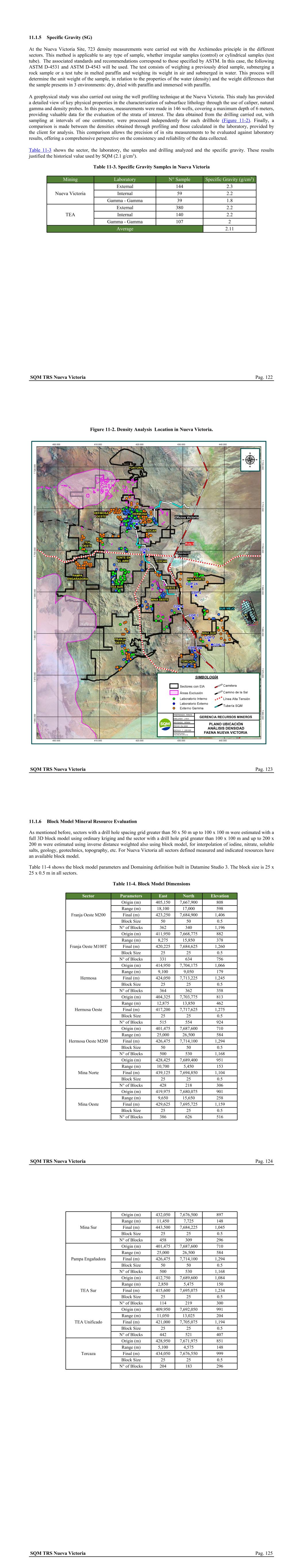 11.1.5 Specific Gravity (SG) At the Nueva Victoria Site, 723 density measurements were carried out with the Archimedes principle in the different sectors. This method is applicable to any type of sample, whether irregular samples (control) or cylindrical samples (test tube). The associated standards and recommendations correspond to those specified by ASTM. In this case, the following ASTM D-4531 and ASTM D-4543 will be used. The test consists of weighing a previously dried sample, submerging a rock sample or a test tube in melted paraffin and weighing its weight in air and submerged in water. This process will determine the unit weight of the sample, in relation to the properties of the water (density) and the weight differences that the sample presents in 3 environments: dry, dried with paraffin and immersed with paraffin. A geophysical study was also carried out using the well profiling technique at the Nueva Victoria. This study has provided a detailed view of key physical properties in the characterization of subsurface lithology through the use of caliper, natural gamma and density probes. In this process, measurements were made in 146 wells, covering a maximum depth of 6 meters, providing valuable data for the evaluation of the strata of interest. The data obtained from the drilling carried out, with sampling at intervals of one centimeter, were processed independently for each drillhole (Figure 11-2). Finally, a comparison is made between the densities obtained through profiling and those calculated in the laboratory, provided by the client for analysis. This comparison allows the precision of in situ measurements to be evaluated against laboratory results, offering a comprehensive perspective on the consistency and reliability of the data collected. Table 11-3 shows the sector, the laboratory, the samples and drilling analyzed and the specific gravity. These results justified the historical value used by SQM (2.1 g/cm3). Table 11-3. Specific Gravity Samples in Nueva Victoria Mining Laboratory N° Sample Specific Gravity (g/cm3) Nueva Victoria External 144 2.3 Internal 59 2.2 Gamma - Gamma 39 1.8 TEA External 380 2.2 Internal 140 2.2 Gamma - Gamma 107 2 Average 2.11 SQM TRS Nueva Victoria Pag. 122 Figure 11-2. Density Analysis Location in Nueva Victoria. SQM TRS Nueva Victoria Pag. 123 11.1.6 Block Model Mineral Resource Evaluation As mentioned before, sectors with a drill hole spacing grid greater than 50 x 50 m up to 100 x 100 m were estimated with a full 3D block model using ordinary kriging and the sector with a drill hole grid greater than 100 x 100 m and up to 200 x 200 m were estimated using inverse distance weighted also using block model, for interpolation of iodine, nitrate, soluble salts, geology, geotechnics, topography, etc. For Nueva Victoria all sectors defined measured and indicated resources have an available block model. Table 11-4 shows the block model parameters and Domaining definition built in Datamine Studio 3. The block size is 25 x 25 x 0.5 m in all sectors. Table 11-4. Block Model Dimensions Sector Parameters East North Elevation Franja Oeste M200 Origin (m) 405,150 7,667,900 808 Range (m) 18,100 17,000 598 Final (m) 423,250 7,684,900 1,406 Block Size 50 50 0.5 N° of Blocks 362 340 1,196 Franja Oeste M100T Origin (m) 411,950 7,668,775 882 Range (m) 8,275 15,850 378 Final (m) 420,225 7,684,625 1,260 Block Size 25 25 0.5 N° of Blocks 331 634 756 Hermosa Origin (m) 414,950 7,704,175 1,066 Range (m) 9,100 9,050 179 Final (m) 424,050 7,713,225 1,245 Block Size 25 25 0.5 N° of Blocks 364 362 358 Hermosa Oeste Origin (m) 404,325 7,703,775 813 Range (m) 12,875 13,850 462 Final (m) 417,200 7,717,625 1,275 Block Size 25 25 0.5 N° of Blocks 515 554 924 Hermosa Oeste M200 Origin (m) 401,475 7,687,600 710 Range (m) 25,000 26,500 584 Final (m) 426,475 7,714,100 1,294 Block Size 50 50 0.5 N° of Blocks 500 530 1,168 Mina Norte Origin (m) 428,425 7,689,400 951 Range (m) 10,700 5,450 153 Final (m) 439,125 7,694,850 1,104 Block Size 25 25 0.5 N° of Blocks 428 218 306 Mina Oeste Origin (m) 419,975 7,680,075 901 Range (m) 9,650 15,650 258 Final (m) 429,625 7,695,725 1,159 Block Size 25 25 0.5 N° of Blocks 386 626 516 SQM TRS Nueva Victoria Pag. 124 Mina Sur Origin (m) 432,050 7,676,500 897 Range (m) 11,450 7,725 148 Final (m) 443,500 7,684,225 1,045 Block Size 25 25 0.5 N° of Blocks 458 309 296 Pampa Engañadora Origin (m) 401,475 7,687,600 710 Range (m) 25,000 26,500 584 Final (m) 426,475 7,714,100 1,294 Block Size 50 50 0.5 N° of Blocks 500 530 1,168 TEA Sur Origin (m) 412,750 7,689,600 1,084 Range (m) 2,850 5,475 150 Final (m) 415,600 7,695,075 1,234 Block Size 25 25 0.5 N° of Blocks 114 219 300 TEA Unificado Origin (m) 409,950 7,692,050 991 Range (m) 11,050 13,025 204 Final (m) 421,000 7,705,075 1,194 Block Size 25 25 0.5 N° of Blocks 442 521 407 Torcaza Origin (m) 428,950 7,671,975 851 Range (m) 5,100 4,575 148 Final (m) 434,050 7,676,550 999 Block Size 25 25 0.5 N° of Blocks 204 183 296 SQM TRS Nueva Victoria Pag. 125