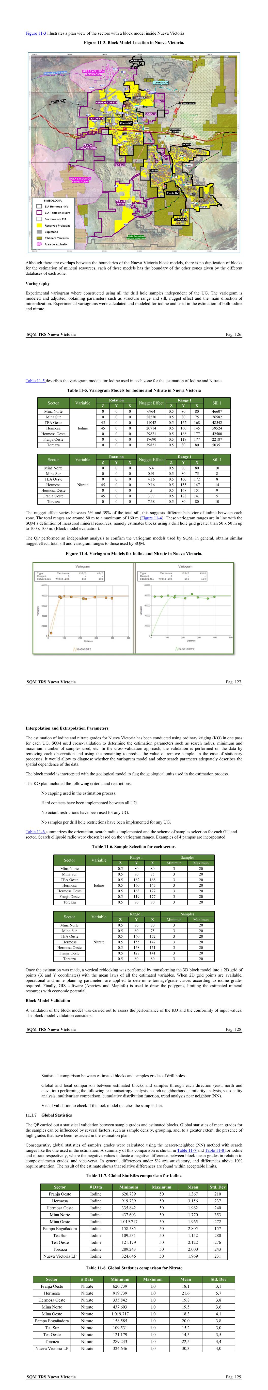 Figure 11-3 illustrates a plan view of the sectors with a block model inside Nueva Victoria Figure 11-3. Block Model Location in Nueva Victoria. Although there are overlaps between the boundaries of the Nueva Victoria block models, there is no duplication of blocks for the estimation of mineral resources, each of these models has the boundary of the other zones given by the different databases of each zone. Variography Experimental variogram where constructed using all the drill hole samples independent of the UG. The variogram is modeled and adjusted, obtaining parameters such as structure range and sill, nugget effect and the main direction of mineralization. Experimental variograms were calculated and modeled for iodine and used in the estimation of both iodine and nitrate. SQM TRS Nueva Victoria Pag. 126 Table 11-5 describes the variogram models for Iodine used in each zone for the estimation of Iodine and Nitrate. Table 11-5. Variogram Models for Iodine and Nitrate in Nueva Victoria Sector Variable Rotation Nugget Effect Range 1 Sill 1 Z Y X Z Y X Mina Norte Iodine 0 0 0 6964 0.5 80 80 46607 Mina Sur 0 0 0 28270 0.5 80 75 76582 TEA Oeste 45 0 0 11042 0.5 162 168 48542 Hermosa 45 0 0 20714 0.5 160 145 59524 Hermosa Oeste 0 0 0 29821 0.5 168 177 42500 Franja Oeste 0 0 0 17690 0.5 119 177 22187 Torcaza 0 0 0 39821 0.5 80 80 50351 Sector Variable Rotation Nugget Effect Range 1 Sill 1 Z Y X Z Y X Mina Norte Nitrate 0 0 0 6.4 0.5 80 80 10 Mina Sur 0 0 0 0.91 0.5 80 75 8 TEA Oeste 0 0 0 4.16 0.5 160 172 8 Hermosa 45 0 0 9.16 0.5 155 147 14 Hermosa Oeste 0 0 0 5 0.5 168 151 9 Franja Oeste 45 0 0 3.77 0.5 128 141 5 Torcaza 0 0 0 7.38 0.5 80 80 10 The nugget effect varies between 6% and 39% of the total sill, this suggests different behavior of iodine between each zone. The total ranges are around 80 m to a maximum of 160 m (Figure 11-4). These variogram ranges are in line with the SQM´s definition of measured mineral resources, namely estimates blocks using a drill hole grid greater than 50 x 50 m up to 100 x 100 m. (Block model evaluation). The QP performed an independent analysis to confirm the variogram models used by SQM, in general, obtains similar nugget effect, total sill and variogram ranges to those used by SQM. Figure 11-4. Variogram Models for Iodine and Nitrate in Nueva Victoria. SQM TRS Nueva Victoria Pag. 127 Interpolation and Extrapolation Parameters The estimation of iodine and nitrate grades for Nueva Victoria has been conducted using ordinary kriging (KO) in one pass for each UG. SQM used cross-validation to determine the estimation parameters such as search radius, minimum and maximum number of samples used, etc. In the cross-validation approach, the validation is performed on the data by removing each observation and using the remaining to predict the value of remove sample. In the case of stationary processes, it would allow to diagnose whether the variogram model and other search parameter adequately describes the spatial dependence of the data. The block model is intercepted with the geological model to flag the geological units used in the estimation process. The KO plan included the following criteria and restrictions: No capping used in the estimation process. Hard contacts have been implemented between all UG. No octant restrictions have been used for any UG. No samples per drill hole restrictions have been implemented for any UG. Table 11-6 summarizes the orientation, search radius implemented and the scheme of samples selection for each GU and sector. Search ellipsoid radio were chosen based on the variogram ranges. Examples of 4 pampas are incorporated Table 11-6. Sample Selection for each sector. Sector Variable Range 1 Samples Z Y X Minimun Maximun Mina Norte Iodine 0.5 80 80 3 20 Mina Sur 0.5 80 75 3 20 TEA Oeste 0.5 162 168 3 20 Hermosa 0.5 160 145 3 20 Hermosa Oeste 0.5 168 177 3 20 Franja Oeste 0.5 119 177 3 20 Torcaza 0.5 80 80 3 20 Sector Variable Range 1 Samples Z Y X Minimun Maximun Mina Norte Nitrate 0.5 80 80 3 20 Mina Sur 0.5 80 75 3 20 TEA Oeste 0.5 160 172 3 20 Hermosa 0.5 155 147 3 20 Hermosa Oeste 0.5 168 151 3 20 Franja Oeste 0.5 128 141 3 20 Torcaza 0.5 80 80 3 20 Once the estimation was made, a vertical reblocking was performed by transforming the 3D block model into a 2D grid of points (X and Y coordinates) with the mean laws of all the estimated variables. When 2D grid points are available, operational and mine planning parameters are applied to determine tonnage/grade curves according to iodine grades required. Finally, GIS software (Arcview and Mapinfo) is used to draw the polygons, limiting the estimated mineral resources with economic potential. Block Model Validation A validation of the block model was carried out to assess the performance of the KO and the conformity of input values. The block model validation considers: SQM TRS Nueva Victoria Pag. 128 Statistical comparison between estimated blocks and samples grades of drill holes. Global and local comparison between estimated blocks and samples through each direction (east, north and elevation) performing the following test: anisotropy analysis, search neighborhood, similarity analysis, seasonality analysis, multivariate comparison, cumulative distribution function, trend analysis near neighbor (NN). Visual validation to check if the lock model matches the sample data. 11.1.7 Global Statistics The QP carried out a statistical validation between sample grades and estimated blocks. Global statistics of mean grades for the samples can be influenced by several factors, such as sample density, grouping, and, to a greater extent, the presence of high grades that have been restricted in the estimation plan. Consequently, global statistics of samples grades were calculated using the nearest-neighbor (NN) method with search ranges like the one used in the estimation. A summary of this comparison is shown in Table 11-7 and Table 11-8 for iodine and nitrate respectively, where the negative v