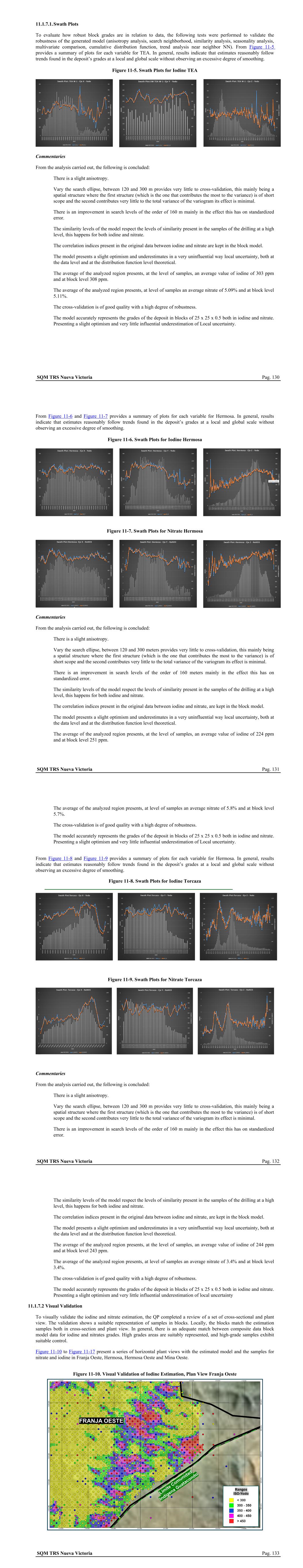 11.1.7.1.Swath Plots To evaluate how robust block grades are in relation to data, the following tests were performed to validate the robustness of the generated model (anisotropy analysis, search neighborhood, similarity analysis, seasonality analysis, multivariate comparison, cumulative distribution function, trend analysis near neighbor NN). From Figure 11-5 provides a summary of plots for each variable for TEA. In general, results indicate that estimates reasonably follow trends found in the deposit’s grades at a local and global scale without observing an excessive degree of smoothing. Figure 11-5. Swath Plots for Iodine TEA Commentaries From the analysis carried out, the following is concluded: There is a slight anisotropy. Vary the search ellipse, between 120 and 300 m provides very little to cross-validation, this mainly being a spatial structure where the first structure (which is the one that contributes the most to the variance) is of short scope and the second contributes very little to the total variance of the variogram its effect is minimal. There is an improvement in search levels of the order of 160 m mainly in the effect this has on standardized error. The similarity levels of the model respect the levels of similarity present in the samples of the drilling at a high level, this happens for both iodine and nitrate. The correlation indices present in the original data between iodine and nitrate are kept in the block model. The model presents a slight optimism and underestimates in a very uninfluential way local uncertainty, both at the data level and at the distribution function level theoretical. The average of the analyzed region presents, at the level of samples, an average value of iodine of 303 ppm and at block level 308 ppm. The average of the analyzed region presents, at level of samples an average nitrate of 5.09% and at block level 5.11%. The cross-validation is of good quality with a high degree of robustness. The model accurately represents the grades of the deposit in blocks of 25 x 25 x 0.5 both in iodine and nitrate. Presenting a slight optimism and very little influential underestimation of Local uncertainty. SQM TRS Nueva Victoria Pag. 130 From Figure 11-6 and Figure 11-7 provides a summary of plots for each variable for Hermosa. In general, results indicate that estimates reasonably follow trends found in the deposit’s grades at a local and global scale without observing an excessive degree of smoothing. Figure 11-6. Swath Plots for Iodine Hermosa Figure 11-7. Swath Plots for Nitrate Hermosa Commentaries From the analysis carried out, the following is concluded: There is a slight anisotropy. Vary the search ellipse, between 120 and 300 meters provides very little to cross-validation, this mainly being a spatial structure where the first structure (which is the one that contributes the most to the variance) is of short scope and the second contributes very little to the total variance of the variogram its effect is minimal. There is an improvement in search levels of the order of 160 meters mainly in the effect this has on standardized error. The similarity levels of the model respect the levels of similarity present in the samples of the drilling at a high level, this happens for both iodine and nitrate. The correlation indices present in the original data between iodine and nitrate, are kept in the block model. The model presents a slight optimism and underestimates in a very uninfluential way local uncertainty, both at the data level and at the distribution function level theoretical. The average of the analyzed region presents, at the level of samples, an average value of iodine of 224 ppm and at block level 251 ppm. SQM TRS Nueva Victoria Pag. 131 The average of the analyzed region presents, at level of samples an average nitrate of 5.8% and at block level 5.7%. The cross-validation is of good quality with a high degree of robustness. The model accurately represents the grades of the deposit in blocks of 25 x 25 x 0.5 both in iodine and nitrate. Presenting a slight optimism and very little influential underestimation of Local uncertainty. From Figure 11-8 and Figure 11-9 provides a summary of plots for each variable for Hermosa. In general, results indicate that estimates reasonably follow trends found in the deposit’s grades at a local and global scale without observing an excessive degree of smoothing. Figure 11-8. Swath Plots for Iodine Torcaza Figure 11-9. Swath Plots for Nitrate Torcaza Commentaries From the analysis carried out, the following is concluded: There is a slight anisotropy. Vary the search ellipse, between 120 and 300 m provides very little to cross-validation, this mainly being a spatial structure where the first structure (which is the one that contributes the most to the variance) is of short scope and the second contributes very little to the total variance of the variogram its effect is minimal. There is an improvement in search levels of the order of 160 m mainly in the effect this has on standardized error. SQM TRS Nueva Victoria Pag. 132 The similarity levels of the model respect the levels of similarity present in the samples of the drilling at a high level, this happens for both iodine and nitrate. The correlation indices present in the original data between iodine and nitrate, are kept in the block model. The model presents a slight optimism and underestimates in a very uninfluential way local uncertainty, both at the data level and at the distribution function level theoretical. The average of the analyzed region presents, at the level of samples, an average value of iodine of 244 ppm and at block level 243 ppm. The average of the analyzed region presents, at level of samples an average nitrate of 3.4% and at block level 3.4%. The cross-validation is of good quality with a high degree of robustness. The model accurately represents the grades of the deposit in blocks of 25 x 25 x 0.5 both in iodine and nitrate. Prese