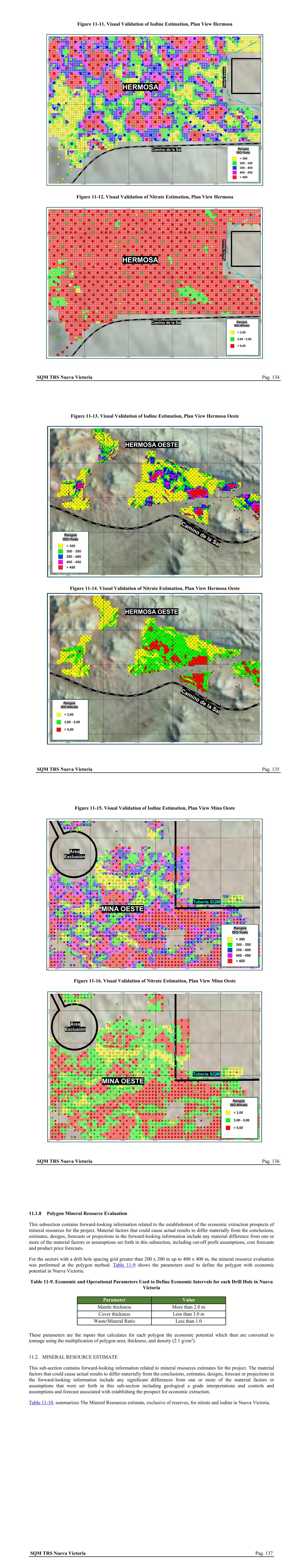 Figure 11-11. Visual Validation of Iodine Estimation, Plan View Hermosa Figure 11-12. Visual Validation of Nitrate Estimation, Plan View Hermosa SQM TRS Nueva Victoria Pag. 134 Figure 11-13. Visual Validation of Iodine Estimation, Plan View Hermosa Oeste Figure 11-14. Visual Validation of Nitrate Estimation, Plan View Hermosa Oeste SQM TRS Nueva Victoria Pag. 135 Figure 11-15. Visual Validation of Iodine Estimation, Plan View Mina Oeste Figure 11-16. Visual Validation of Nitrate Estimation, Plan View Mina Oeste SQM TRS Nueva Victoria Pag. 136 11.1.8 Polygon Mineral Resource Evaluation This subsection contains forward-looking information related to the establishment of the economic extraction prospects of mineral resources for the project. Material factors that could cause actual results to differ materially from the conclusions, estimates, designs, forecasts or projections in the forward-looking information include any material difference from one or more of the material factors or assumptions set forth in this subsection, including cut-off profit assumptions, cost forecasts and product price forecasts. For the sectors with a drill hole spacing grid greater than 200 x 200 m up to 400 x 400 m, the mineral resource evaluation was performed at the polygon method. Table 11-9 shows the parameters used to define the polygon with economic potential in Nueva Victoria. Table 11-9. Economic and Operational Parameters Used to Define Economic Intervals for each Drill Hole in Nueva Victoria Parameter Value Mantle thickness More than 2.0 m Cover thickness Less than 3.0 m Waste/Mineral Ratio Less than 1.0 These parameters are the inputs that calculates for each polygon the economic potential which then are converted to tonnage using the multiplication of polygon area, thickness, and density (2.1 g/cm3). 11.2. MINERAL RESOURCE ESTIMATE This sub-section contains forward-looking information related to mineral resources estimates for the project. The material factors that could cause actual results to differ materially from the conclusions, estimates, designs, forecast or projections in the forward-looking information include any significant differences from one or more of the material factors or assumptions that were set forth in this sub-section including geological a grade interpretations and controls and assumptions and forecast associated with establishing the prospect for economic extraction. Table 11-10. summarizes The Mineral Resources estimate, exclusive of reserves, for nitrate and iodine in Nueva Victoria. SQM TRS Nueva Victoria Pag. 137