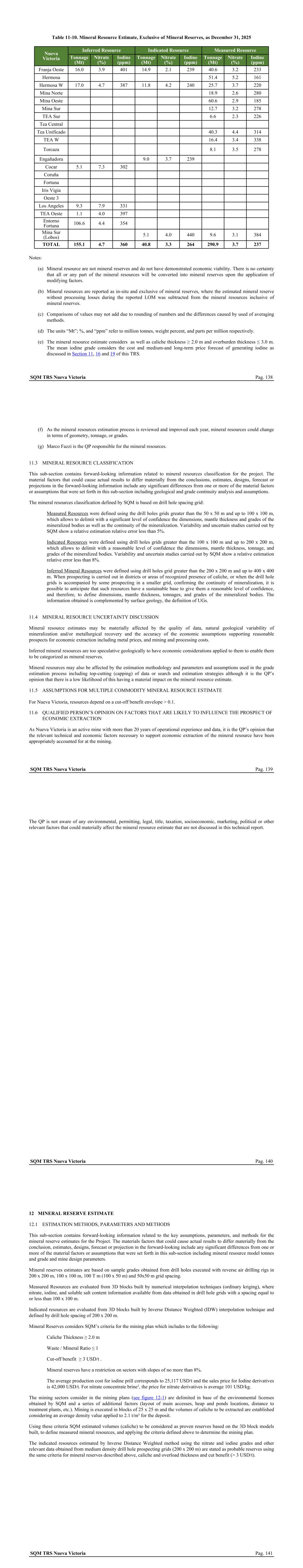 Table 11-10. Mineral Resource Estimate, Exclusive of Mineral Reserves, as December 31, 2025 Nueva Victoria Inferred Resource Indicated Resource Measured Resource Tonnage (Mt) Nitrate (%) Iodine (ppm) Tonnage (Mt) Nitrate (%) Iodine (ppm) Tonnage (Mt) Nitrate (%) Iodine (ppm) Franja Oeste 16.0 3.9 401 14.9 2.1 239 40.6 3.2 233 Hermosa 51.4 5.2 161 Hermosa W 17.0 4.7 387 11.8 4.2 240 25.7 3.7 220 Mina Norte 18.9 2.6 280 Mina Oeste 60.6 2.9 185 Mina Sur 12.7 3.2 278 TEA Sur 6.6 2.3 226 Tea Central Tea Unificado 40.3 4.4 314 TEA W 16.4 3.4 338 Torcaza 8.1 3.5 278 Engañadora 9.0 3.7 239 Cocar 5.1 7.3 302 Coruña Fortuna Iris Vigia Oeste 3 Los Angeles 9.3 7.9 331 TEA Oeste 1.1 4.0 397 Entorno Fortuna 106.6 4.4 354 Mina Sur (Lobos) 5.1 4.0 440 9.6 3.1 384 TOTAL 155.1 4.7 360 40.8 3.3 264 290.9 3.7 237 Notes: (a) Mineral resource are not mineral reserves and do not have demonstrated economic viability. There is no certainty that all or any part of the mineral resources will be converted into mineral reserves upon the application of modifying factors. (b) Mineral resources are reported as in-situ and exclusive of mineral reserves, where the estimated mineral reserve without processing losses during the reported LOM was subtracted from the mineral resources inclusive of mineral reserves. (c) Comparisons of values may not add due to rounding of numbers and the differences caused by used of averaging methods. (d) The units “Mt”; %, and “ppm” refer to million tonnes, weight percent, and parts per million respectively. (e) The mineral resource estimate considers as well as caliche thickness ≥ 2.0 m and overburden thickness ≤ 3.0 m. The mean iodine grade considers the cost and medium-and long-term price forecast of generating iodine as discussed in Section 11, 16 and 19 of this TRS. SQM TRS Nueva Victoria Pag. 138 (f) As the mineral resources estimation process is reviewed and improved each year, mineral resources could change in terms of geometry, tonnage, or grades. (g) Marco Fazzi is the QP responsible for the mineral resources. 11.3 MINERAL RESOURCE CLASSIFICATION This sub-section contains forward-looking information related to mineral resources classification for the project. The material factors that could cause actual results to differ materially from the conclusions, estimates, designs, forecast or projections in the forward-looking information include any significant differences from one or more of the material factors or assumptions that were set forth in this sub-section including geological and grade continuity analysis and assumptions. The mineral resources classification defined by SQM is based on drill hole spacing grid: Measured Resources were defined using the drill holes grids greater than the 50 x 50 m and up to 100 x 100 m, which allows to delimit with a significant level of confidence the dimensions, mantle thickness and grades of the mineralized bodies as well as the continuity of the mineralization. Variability and uncertain studies carried out by SQM show a relative estimation relative error less than 5%. Indicated Resources were defined using drill holes grids greater than the 100 x 100 m and up to 200 x 200 m, which allows to delimit with a reasonable level of confidence the dimensions, mantle thickness, tonnage, and grades of the mineralized bodies. Variability and uncertain studies carried out by SQM show a relative estimation relative error less than 8%. Inferred Mineral Resources were defined using drill holes grid greater than the 200 x 200 m and up to 400 x 400 m. When prospecting is carried out in districts or areas of recognized presence of caliche, or when the drill hole grids is accompanied by some prospecting in a smaller grid, confirming the continuity of mineralization, it is possible to anticipate that such resources have a sustainable base to give them a reasonable level of confidence, and therefore, to define dimensions, mantle thickness, tonnages, and grades of the mineralized bodies. The information obtained is complemented by surface geology, the definition of UGs. 11.4 MINERAL RESOURCE UNCERTAINTY DISCUSSION Mineral resource estimates may be materially affected by the quality of data, natural geological variability of mineralization and/or metallurgical recovery and the accuracy of the economic assumptions supporting reasonable prospects for economic extraction including metal prices, and mining and processing costs. Inferred mineral resources are too speculative geologically to have economic considerations applied to them to enable them to be categorized as mineral reserves. Mineral resources may also be affected by the estimation methodology and parameters and assumptions used in the grade estimation process including top-cutting (capping) of data or search and estimation strategies although it is the QP’s opinion that there is a low likelihood of this having a material impact on the mineral resource estimate. 11.5 ASSUMPTIONS FOR MULTIPLE COMMODITY MINERAL RESOURCE ESTIMATE For Nueva Victoria, resources depend on a cut-off benefit envelope > 0.1. 11.6 QUALIFIED PERSON’S OPINION ON FACTORS THAT ARE LIKELY TO INFLUENCE THE PROSPECT OF ECONOMIC EXTRACTION As Nueva Victoria is an active mine with more than 20 years of operational experience and data, it is the QP’s opinion that the relevant technical and economic factors necessary to support economic extraction of the mineral resource have been appropriately accounted for at the mining. SQM TRS Nueva Victoria Pag. 139 The QP is not aware of any environmental, permitting, legal, title, taxation, socioeconomic, marketing, political or other relevant factors that could materially affect the mineral resource estimate that are not discussed in this technical report. SQM TRS Nueva Victoria Pag. 140 12 MINERAL RESERVE ESTIMATE 12.1 ESTIMATION METHODS, PARAMETERS AND METHODS This sub-section contains forward-looking information related to the key assumptions, parameters, and methods for the minera
