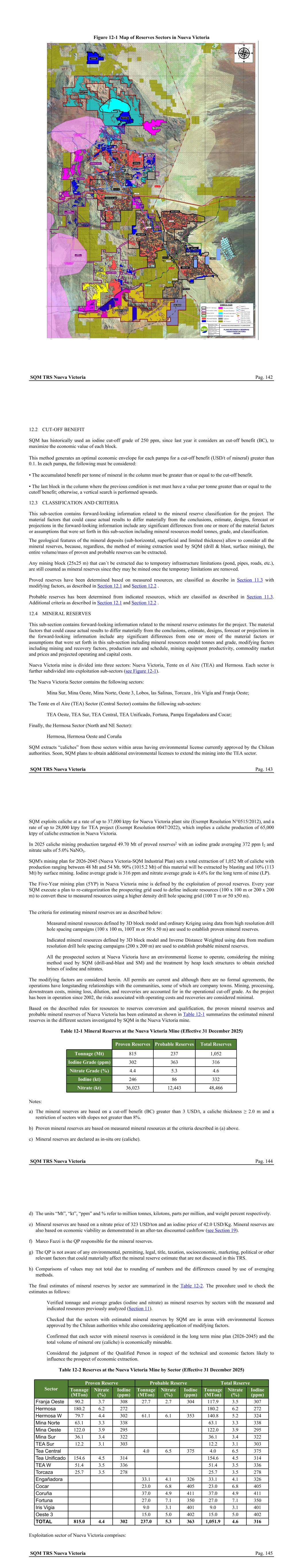 Figure 12-1 Map of Reserves Sectors in Nueva Victoria SQM TRS Nueva Victoria Pag. 142 12.2 CUT-OFF BENEFIT SQM has historically used an iodine cut-off grade of 250 ppm, since last year it considers an cut-off benefit (BC), to maximize the economic value of each block. This method generates an optimal economic envelope for each pampa for a cut-off benefit (USD/t of mineral) greater than 0.1. In each pampa, the following must be considered: • The accumulated benefit per tonne of mineral in the column must be greater than or equal to the cut-off benefit. • The last block in the column where the previous condition is met must have a value per tonne greater than or equal to the cutoff benefit; otherwise, a vertical search is performed upwards. 12.3 CLASSIFICATION AND CRITERIA This sub-section contains forward-looking information related to the mineral reserve classification for the project. The material factors that could cause actual results to differ materially from the conclusions, estimate, designs, forecast or projections in the forward-looking information include any significant differences from one or more of the material factors or assumptions that were set forth in this sub-section including mineral resources model tonnes, grade, and classification. The geological features of the mineral deposits (sub-horizontal, superficial and limited thickness) allow to consider all the mineral reserves, because, regardless, the method of mining extraction used by SQM (drill & blast, surface mining), the entire volume/mass of proven and probable reserves can be extracted. Any mining block (25x25 m) that can´t be extracted due to temporary infrastructure limitations (pond, pipes, roads, etc.), are still counted as mineral reserves since they may be mined once the temporary limitations are removed. Proved reserves have been determined based on measured resources, are classified as describe in Section 11.3 with modifying factors, as described in Section 12.1 and Section 12.2 . Probable reserves has been determined from indicated resources, which are classified as described in Section 11.3. Additional criteria as described in Section 12.1 and Section 12.2 . 12.4 MINERAL RESERVES This sub-section contains forward-looking information related to the mineral reserve estimates for the project. The material factors that could cause actual results to differ materially from the conclusions, estimate, designs, forecast or projections in the forward-looking information include any significant differences from one or more of the material factors or assumptions that were set forth in this sub-section including mineral resources model tonnes and grade, modifying factors including mining and recovery factors, production rate and schedule, mining equipment productivity, commodity market and prices and projected operating and capital costs. Nueva Victoria mine is divided into three sectors: Nueva Victoria, Tente en el Aire (TEA) and Hermosa. Each sector is further subdivided into exploitation sub-sectors (see Figure 12-1). The Nueva Victoria Sector contains the following sectors: Mina Sur, Mina Oeste, Mina Norte, Oeste 3, Lobos, las Salinas, Torcaza , Iris Vigía and Franja Oeste; The Tente en el Aire (TEA) Sector (Central Sector) contains the following sub-sectors: TEA Oeste, TEA Sur, TEA Central, TEA Unificado, Fortuna, Pampa Engañadora and Cocar; Finally, the Hermosa Sector (North and NE Sector): Hermosa, Hermosa Oeste and Coruña SQM extracts “caliches” from these sectors within areas having environmental license currently approved by the Chilean authorities. Soon, SQM plans to obtain additional environmental licenses to extend the mining into the TEA sector. SQM TRS Nueva Victoria Pag. 143 SQM exploits caliche at a rate of up to 37,000 ktpy for Nueva Victoria plant site (Exempt Resolution N°0515/2012), and a rate of up to 28,000 ktpy for TEA project (Exempt Resolution 0047/2022), which implies a caliche production of 65,000 ktpy of caliche extraction in Nueva Victoria. In 2025 caliche mining production targeted 49.70 Mt of proved reserves2 with an iodine grade averaging 372 ppm I2 and nitrate salts of 5.0% NaNO3. SQM's mining plan for 2026-2045 (Nueva Victoria-SQM Industrial Plan) sets a total extraction of 1,052 Mt of caliche with production ranging between 48 Mt and 54 Mt. 90% (1015.2 Mt) of this material will be extracted by blasting and 10% (113 Mt) by surface mining. Iodine average grade is 316 ppm and nitrate average grade is 4.6% for the long term of mine (LP). The Five-Year mining plan (5YP) in Nueva Victoria mine is defined by the exploitation of proved reserves. Every year SQM execute a plan to re-categorization the prospecting grid used to define indicate resources (100 x 100 m or 200 x 200 m) to convert these to measured resources using a higher density drill hole spacing grid (100 T m or 50 x50 m). The criteria for estimating mineral reserves are as described below: Measured mineral resources defined by 3D block model and ordinary Kriging using data from high resolution drill hole spacing campaigns (100 x 100 m, 100T m or 50 x 50 m) are used to establish proven mineral reserves. Indicated mineral resources defined by 3D block model and Inverse Distance Weighted using data from medium resolution drill hole spacing campaigns (200 x 200 m) are used to establish probable mineral reserves. All the prospected sectors at Nueva Victoria have an environmental license to operate, considering the mining method used by SQM (drill-and-blast and SM) and the treatment by heap leach structures to obtain enriched brines of iodine and nitrates. The modifying factors are considered herein. All permits are current and although there are no formal agreements, the operations have longstanding relationships with the communities, some of which are company towns. Mining, processing, downstream costs, mining loss, dilution, and recoveries are accounted for in the operational cut-off grade. As the project has been 