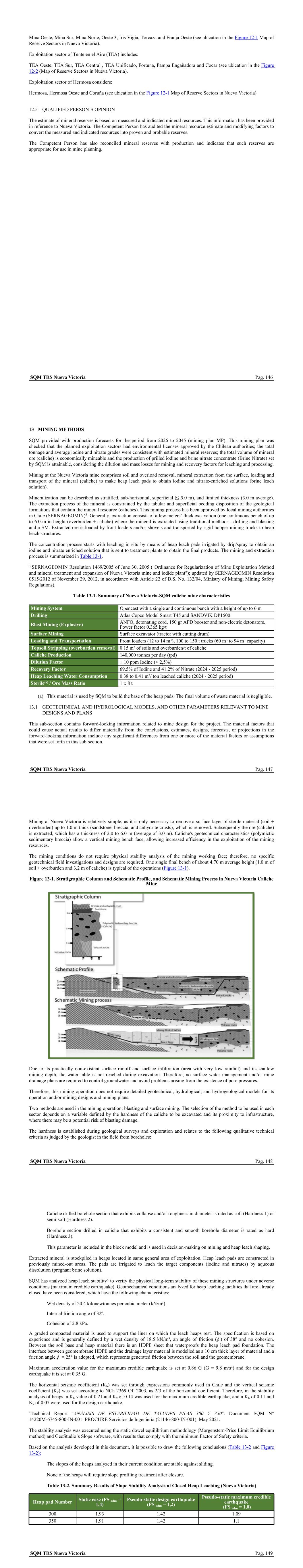 Mina Oeste, Mina Sur, Mina Norte, Oeste 3, Iris Vigía, Torcaza and Franja Oeste (see ubication in the Figure 12-1 Map of Reserve Sectors in Nueva Victoria). Exploitation sector of Tente en el Aire (TEA) includes: TEA Oeste, TEA Sur, TEA Central , TEA Unificado, Fortuna, Pampa Engañadora and Cocar (see ubication in the Figure 12-2 (Map of Reserve Sectors in Nueva Victoria). Exploitation sector of Hermosa considers: Hermosa, Hermosa Oeste and Coruña (see ubication in the Figure 12-1 Map of Reserve Sectors in Nueva Victoria). 12.5 QUALIFIED PERSON’S OPINION The estimate of mineral reserves is based on measured and indicated mineral resources. This information has been provided in reference to Nueva Victoria. The Competent Person has audited the mineral resource estimate and modifying factors to convert the measured and indicated resources into proven and probable reserves. The Competent Person has also reconciled mineral reserves with production and indicates that such reserves are appropriate for use in mine planning. SQM TRS Nueva Victoria Pag. 146 13 MINING METHODS SQM provided with production forecasts for the period from 2026 to 2045 (mining plan MP). This mining plan was checked that the planned exploitation sectors had environmental licenses approved by the Chilean authorities; the total tonnage and average iodine and nitrate grades were consistent with estimated mineral reserves; the total volume of mineral ore (caliche) is economically mineable and the production of prilled iodine and brine nitrate concentrate (Brine Nitrate) set by SQM is attainable, considering the dilution and mass losses for mining and recovery factors for leaching and processing. Mining at the Nueva Victoria mine comprises soil and overload removal, mineral extraction from the surface, loading and transport of the mineral (caliche) to make heap leach pads to obtain iodine and nitrate-enriched solutions (brine leach solution). Mineralization can be described as stratified, sub-horizontal, superficial (≤ 5.0 m), and limited thickness (3.0 m average). The extraction process of the mineral is constrained by the tabular and superficial bedding disposition of the geological formations that contain the mineral resource (caliches). This mining process has been approved by local mining authorities in Chile (SERNAGEOMIN)3. Generally, extraction consists of a few meters’ thick excavation (one continuous bench of up to 6.0 m in height (overburden + caliche) where the mineral is extracted using traditional methods - drilling and blasting and a SM. Extracted ore is loaded by front loaders and/or shovels and transported by rigid hopper mining trucks to heap leach structures. The concentration process starts with leaching in situ by means of heap leach pads irrigated by drip/spray to obtain an iodine and nitrate enriched solution that is sent to treatment plants to obtain the final products. The mining and extraction process is summarized in Table 13-1. 3 SERNAGEOMIN Resolution 1469/2005 of June 30, 2005 ("Ordinance for Regularization of Mine Exploitation Method and mineral treatment and expansion of Nueva Victoria mine and iodide plant"); updated by SERNAGEOMIN Resolution 0515/2012 of November 29, 2012, in accordance with Article 22 of D.S. No. 132/04, Ministry of Mining, Mining Safety Regulations). Table 13-1. Summary of Nueva Victoria-SQM caliche mine characteristics Mining System Opencast with a single and continuous bench with a height of up to 6 m Drilling Atlas Copco Model Smart T45 and SANDVIK DP1500 Blast Mining (Explosive) ANFO, detonating cord, 150 gr APD booster and non-electric detonators. Power factor 0.365 kg/t Surface Mining Surface excavator (tractor with cutting drum) Loading and Transportation Front loaders (12 to 14 m3), 100 to 150 t trucks (60 m3 to 94 m3 capacity) Topsoil Stripping (overburden removal) 0.15 m3 of soils and overburden/t of caliche Caliche Production 140,000 tonnes per day (tpd) Dilution Factor ± 10 ppm Iodine (< 2,5%) Recovery Factor 69.5% of Iodine and 41.2% of Nitrate (2024 - 2025 period) Heap Leaching Water Consumption 0.38 to 0.41 m3/ ton leached caliche (2024 - 2025 period) Sterile(a) / Ore Mass Ratio 1 t: 8 t (a) This material is used by SQM to build the base of the heap pads. The final volume of waste material is negligible. 13.1 GEOTECHNICAL AND HYDROLOGICAL MODELS, AND OTHER PARAMETERS RELEVANT TO MINE DESIGNS AND PLANS This sub-section contains forward-looking information related to mine design for the project. The material factors that could cause actual results to differ materially from the conclusions, estimates, designs, forecasts, or projections in the forward-looking information include any significant differences from one or more of the material factors or assumptions that were set forth in this sub-section. SQM TRS Nueva Victoria Pag. 147 Mining at Nueva Victoria is relatively simple, as it is only necessary to remove a surface layer of sterile material (soil + overburden) up to 1.0 m thick (sandstone, breccia, and anhydrite crusts), which is removed. Subsequently the ore (caliche) is extracted, which has a thickness of 2.0 to 6.0 m (average of 3.0 m). Caliche's geotechnical characteristics (polymictic sedimentary breccia) allow a vertical mining bench face, allowing increased efficiency in the exploitation of the mining resources. The mining conditions do not require physical stability analysis of the mining working face; therefore, no specific geotechnical field investigations and designs are required. One single final bench of about 4.70 m average height (1.0 m of soil + overburden and 3.2 m of caliche) is typical of the operations (Figure 13-1). Figure 13-1. Stratigraphic Column and Schematic Profile, and Schematic Mining Process in Nueva Victoria Caliche Mine Due to its practically non-existent surface runoff and surface infiltration (area with very low rainfall) and its shallow mining depth, the water table is not reached during excavation. Therefore, no 