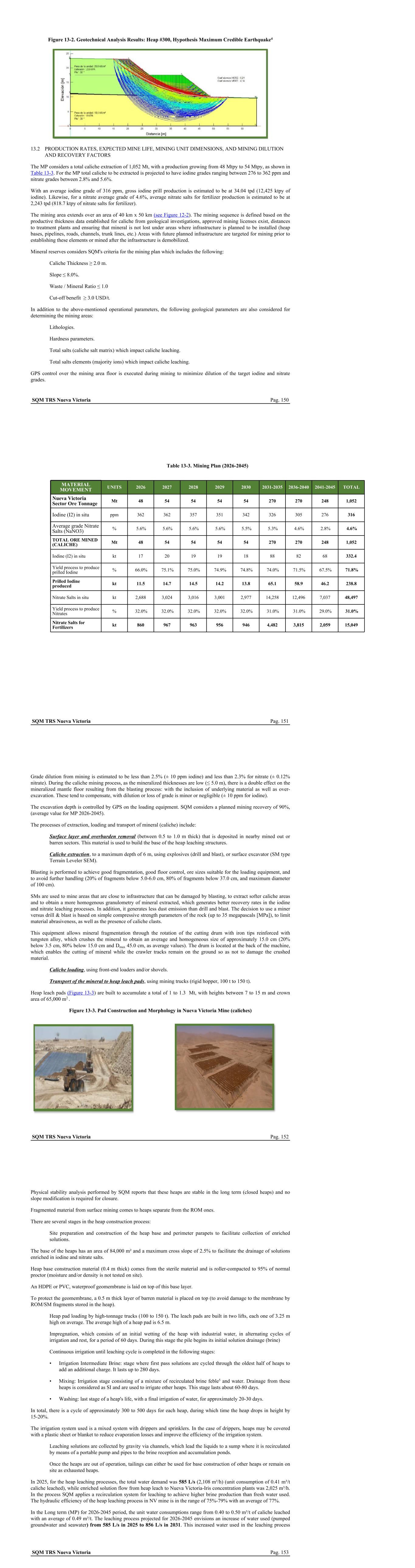 Figure 13-2. Geotechnical Analysis Results: Heap #300, Hypothesis Maximum Credible Earthquake4 13.2 PRODUCTION RATES, EXPECTED MINE LIFE, MINING UNIT DIMENSIONS, AND MINING DILUTION AND RECOVERY FACTORS The MP considers a total caliche extraction of 1,052 Mt, with a production growing from 48 Mtpy to 54 Mtpy, as shown in Table 13-3. For the MP total caliche to be extracted is projected to have iodine grades ranging between 276 to 362 ppm and nitrate grades between 2.8% and 5.6%. With an average iodine grade of 316 ppm, gross iodine prill production is estimated to be at 34.04 tpd (12,425 ktpy of iodine). Likewise, for a nitrate average grade of 4.6%, average nitrate salts for fertilizer production is estimated to be at 2,243 tpd (818.7 ktpy of nitrate salts for fertilizer). The mining area extends over an area of 40 km x 50 km (see Figure 12-2). The mining sequence is defined based on the productive thickness data established for caliche from geological investigations, approved mining licenses exist, distances to treatment plants and ensuring that mineral is not lost under areas where infrastructure is planned to be installed (heap bases, pipelines, roads, channels, trunk lines, etc.) Areas with future planned infrastructure are targeted for mining prior to establishing these elements or mined after the infrastructure is demobilized. Mineral reserves considers SQM's criteria for the mining plan which includes the following: Caliche Thickness ≥ 2.0 m. Slope ≤ 8.0%. Waste / Mineral Ratio ≤ 1.0 Cut-off benefit ≥ 3.0 USD/t. In addition to the above-mentioned operational parameters, the following geological parameters are also considered for determining the mining areas: Lithologies. Hardness parameters. Total salts (caliche salt matrix) which impact caliche leaching. Total salts elements (majority ions) which impact caliche leaching. GPS control over the mining area floor is executed during mining to minimize dilution of the target iodine and nitrate grades. SQM TRS Nueva Victoria Pag. 150 Table 13-3. Mining Plan (2026-2045) MATERIAL MOVEMENT UNITS 2026 2027 2028 2029 2030 2031-2035 2036-2040 2041-2045 TOTAL Nueva Victoria Sector Ore Tonnage Mt 48 54 54 54 54 270 270 248 1,052 Iodine (I2) in situ ppm 362 362 357 351 342 326 305 276 316 Average grade Nitrate Salts (NaNO3) % 5.6% 5.6% 5.6% 5.6% 5.5% 5.3% 4.6% 2.8% 4.6% TOTAL ORE MINED (CALICHE) Mt 48 54 54 54 54 270 270 248 1,052 Iodine (I2) in situ kt 17 20 19 19 18 88 82 68 332.4 Yield process to produce prilled Iodine % 66.0% 75.1% 75.0% 74.9% 74.8% 74.0% 71.5% 67.5% 71.8% Prilled Iodine produced kt 11.5 14.7 14.5 14.2 13.8 65.1 58.9 46.2 238.8 Nitrate Salts in situ kt 2,688 3,024 3,016 3,001 2,977 14,258 12,496 7,037 48,497 Yield process to produce Nitrates % 32.0% 32.0% 32.0% 32.0% 32.0% 31.0% 31.0% 29.0% 31.0% Nitrate Salts for Fertilizers kt 860 967 963 956 946 4,482 3,815 2,059 15,049 SQM TRS Nueva Victoria Pag. 151 Grade dilution from mining is estimated to be less than 2.5% (± 10 ppm iodine) and less than 2.3% for nitrate (± 0.12% nitrate). During the caliche mining process, as the mineralized thicknesses are low (≤ 5.0 m), there is a double effect on the mineralized mantle floor resulting from the blasting process: with the inclusion of underlying material as well as over- excavation. These tend to compensate, with dilution or loss of grade is minor or negligible (± 10 ppm for iodine). The excavation depth is controlled by GPS on the loading equipment. SQM considers a planned mining recovery of 90%, (average value for MP 2026-2045). The processes of extraction, loading and transport of mineral (caliche) include: Surface layer and overburden removal (between 0.5 to 1.0 m thick) that is deposited in nearby mined out or barren sectors. This material is used to build the base of the heap leaching structures. Caliche extraction, to a maximum depth of 6 m, using explosives (drill and blast), or surface excavator (SM type Terrain Leveler SEM). Blasting is performed to achieve good fragmentation, good floor control, ore sizes suitable for the loading equipment, and to avoid further handling (20% of fragments below 5.0-6.0 cm, 80% of fragments below 37.0 cm, and maximum diameter of 100 cm). SMs are used to mine areas that are close to infrastructure that can be damaged by blasting, to extract softer caliche areas and to obtain a more homogenous granulometry of mineral extracted, which generates better recovery rates in the iodine and nitrate leaching processes. In addition, it generates less dust emission than drill and blast. The decision to use a miner versus drill & blast is based on simple compressive strength parameters of the rock (up to 35 megapascals [MPa]), to limit material abrasiveness, as well as the presence of caliche clasts. This equipment allows mineral fragmentation through the rotation of the cutting drum with iron tips reinforced with tungsten alloy, which crushes the mineral to obtain an average and homogeneous size of approximately 15.0 cm (20% below 3.5 cm, 80% below 15.0 cm and Dmax 45.0 cm, as average values). The drum is located at the back of the machine, which enables the cutting of mineral while the crawler tracks remain on the ground so as not to damage the crushed material. Caliche loading, using front-end loaders and/or shovels. Transport of the mineral to heap leach pads, using mining trucks (rigid hopper, 100 t to 150 t). Heap leach pads (Figure 13-3) are built to accumulate a total of 1 to 1.3 Mt, with heights between 7 to 15 m and crown area of 65,000 m2 . Figure 13-3. Pad Construction and Morphology in Nueva Victoria Mine (caliches) SQM TRS Nueva Victoria Pag. 152 Physical stability analysis performed by SQM reports that these heaps are stable in the long term (closed heaps) and no slope modification is required for closure. Fragmented material from surface mining comes to heaps separate from the ROM ones. There are several stages in the heap construction process: Site preparation and construc