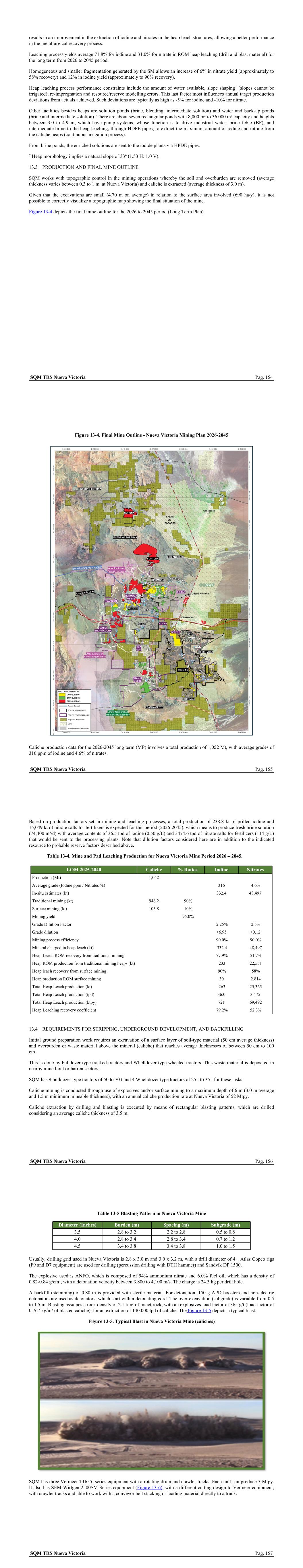 results in an improvement in the extraction of iodine and nitrates in the heap leach structures, allowing a better performance in the metallurgical recovery process. Leaching process yields average 71.8% for iodine and 31.0% for nitrate in ROM heap leaching (drill and blast material) for the long term from 2026 to 2045 period. Homogeneous and smaller fragmentation generated by the SM allows an increase of 6% in nitrate yield (approximately to 58% recovery) and 12% in iodine yield (approximately to 90% recovery). Heap leaching process performance constraints include the amount of water available, slope shaping7 (slopes cannot be irrigated), re-impregnation and resource/reserve modelling errors. This last factor most influences annual target production deviations from actuals achieved. Such deviations are typically as high as -5% for iodine and -10% for nitrate. Other facilities besides heaps are solution ponds (brine, blending, intermediate solution) and water and back-up ponds (brine and intermediate solution). There are about seven rectangular ponds with 8,000 m³ to 36,000 m³ capacity and heights between 3.0 to 4.9 m, which have pump systems, whose function is to drive industrial water, brine feble (BF), and intermediate brine to the heap leaching, through HDPE pipes, to extract the maximum amount of iodine and nitrate from the caliche heaps (continuous irrigation process). From brine ponds, the enriched solutions are sent to the iodide plants via HPDE pipes. 7 Heap morphology implies a natural slope of 33º (1.53 H: 1.0 V). 13.3 PRODUCTION AND FINAL MINE OUTLINE SQM works with topographic control in the mining operations whereby the soil and overburden are removed (average thickness varies between 0.3 to 1 m at Nueva Victoria) and caliche is extracted (average thickness of 3.0 m). Given that the excavations are small (4.70 m on average) in relation to the surface area involved (690 ha/y), it is not possible to correctly visualize a topographic map showing the final situation of the mine. Figure 13-4 depicts the final mine outline for the 2026 to 2045 period (Long Term Plan). SQM TRS Nueva Victoria Pag. 154 Figure 13-4. Final Mine Outline - Nueva Victoria Mining Plan 2026-2045 Caliche production data for the 2026-2045 long term (MP) involves a total production of 1,052 Mt, with average grades of 316 ppm of iodine and 4.6% of nitrates. SQM TRS Nueva Victoria Pag. 155 Based on production factors set in mining and leaching processes, a total production of 238.8 kt of prilled iodine and 15,049 kt of nitrate salts for fertilizers is expected for this period (2026-2045), which means to produce fresh brine solution (74,400 m³/d) with average contents of 36.5 tpd of iodine (0.50 g/L) and 3474.6 tpd of nitrate salts for fertilizers (114 g/L) that would be sent to the processing plants. Note that dilution factors considered here are in addition to the indicated resource to probable reserve factors described above. Table 13-4. Mine and Pad Leaching Production for Nueva Victoria Mine Period 2026 – 2045. LOM 2025-2040 Caliche % Ratios Iodine Nitrates Production (Mt) 1,052 Average grade (Iodine ppm / Nitrates %) 316 4.6% In-situ estimates (kt) 332.4 48,497 Traditional mining (kt) 946.2 90% Surface mining (kt) 105.8 10% Mining yield 95.0% Grade Dilution Factor 2.25% 2.5% Grade dilution ±6.95 ±0.12 Mining process efficiency 90.0% 90.0% Mineral charged in heap leach (kt) 332.4 48,497 Heap Leach ROM recovery from traditional mining 77.9% 51.7% Heap ROM production from traditional mining heaps (kt) 233 22,551 Heap leach recovery from surface mining 90% 58% Heap production ROM surface mining 30 2,814 Total Heap Leach production (kt) 263 25,365 Total Heap Leach production (tpd) 36.0 3,475 Total Heap Leach production (ktpy) 721 69,492 Heap Leaching recovery coefficient 79.2% 52.3% 13.4 REQUIREMENTS FOR STRIPPING, UNDERGROUND DEVELOPMENT, AND BACKFILLING Initial ground preparation work requires an excavation of a surface layer of soil-type material (50 cm average thickness) and overburden or waste material above the mineral (caliche) that reaches average thicknesses of between 50 cm to 100 cm. This is done by bulldozer type tracked tractors and Whelldozer type wheeled tractors. This waste material is deposited in nearby mined-out or barren sectors. SQM has 9 bulldozer type tractors of 50 to 70 t and 4 Whelldozer type tractors of 25 t to 35 t for these tasks. Caliche mining is conducted through use of explosives and/or surface mining to a maximum depth of 6 m (3.0 m average and 1.5 m minimum mineable thickness), with an annual caliche production rate at Nueva Victoria of 52 Mtpy. Caliche extraction by drilling and blasting is executed by means of rectangular blasting patterns, which are drilled considering an average caliche thickness of 3.5 m. SQM TRS Nueva Victoria Pag. 156 Table 13-5 Blasting Pattern in Nueva Victoria Mine Diameter (Inches) Burden (m) Spacing (m) Subgrade (m) 3.5 2.8 to 3.2 2.2 to 2.8 0.5 to 0.8 4.0 2.8 to 3.4 2.8 to 3.4 0.7 to 1.2 4.5 3.4 to 3.8 3.4 to 3.8 1.0 to 1.5 Usually, drilling grid used in Nueva Victoria is 2.8 x 3.0 m and 3.0 x 3.2 m, with a drill diameter of 4". Atlas Copco rigs (F9 and D7 equipment) are used for drilling (percussion drilling with DTH hammer) and Sandvik DP 1500. The explosive used is ANFO, which is composed of 94% ammonium nitrate and 6.0% fuel oil, which has a density of 0.82-0.84 g/cm3, with a detonation velocity between 3,800 to 4,100 m/s. The charge is 24.3 kg per drill hole. A backfill (stemming) of 0.80 m is provided with sterile material. For detonation, 150 g APD boosters and non-electric detonators are used as detonators, which start with a detonating cord. The over-excavation (subgrade) is variable from 0.5 to 1.5 m. Blasting assumes a rock density of 2.1 t/m³ of intact rock, with an explosives load factor of 365 g/t (load factor of 0.767 kg/m³ of blasted caliche), for an extraction of 140.000 tpd of caliche. The Figure 13-5 depicts a typical 