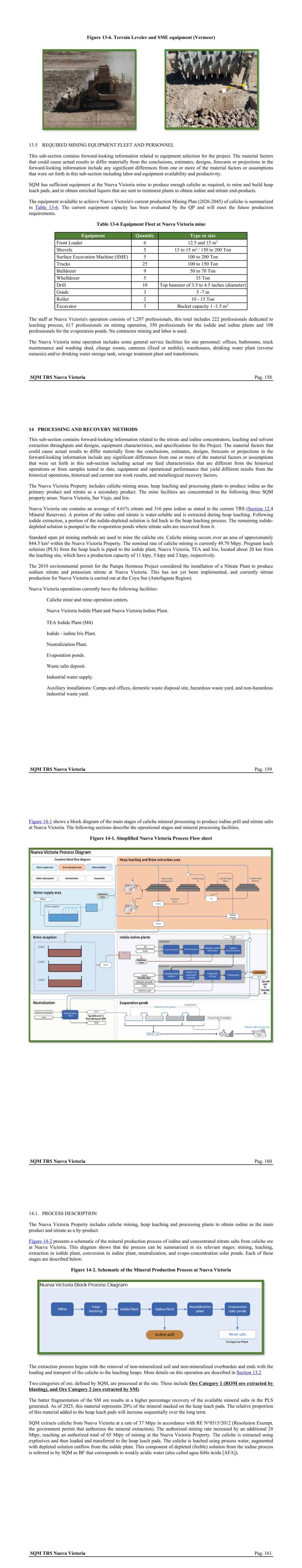Figure 13-6. Terrain Leveler and SME equipment (Vermeer) 13.5 REQUIRED MINING EQUIPMENT FLEET AND PERSONNEL This sub-section contains forward-looking information related to equipment selection for the project. The material factors that could cause actual results to differ materially from the conclusions, estimates, designs, forecasts or projections in the forward-looking information include any significant differences from one or more of the material factors or assumptions that were set forth in this sub-section including labor and equipment availability and productivity. SQM has sufficient equipment at the Nueva Victoria mine to produce enough caliche as required, to mine and build heap leach pads, and to obtain enriched liquors that are sent to treatment plants to obtain iodine and nitrate end-products. The equipment available to achieve Nueva Victoria's current production Mining Plan (2026-2045) of caliche is summarized in Table 13-6. The current equipment capacity has been evaluated by the QP and will meet the future production requirements. Table 13-6 Equipment Fleet at Nueva Victoria mine Equipment Quantity Type or size Front Loader 6 12.5 and 15 m3 Shovels 5 13 to 15 m3 / 150 to 200 Ton Surface Excavation Machine (SME) 5 100 to 200 Ton Trucks 25 100 to 150 Ton Bulldozer 9 50 to 70 Ton Whelldozer 5 35 Ton Drill 10 Top hammer of 3.5 to 4.5 inches (diameter) Grade 3 5 -7 m Roller 2 10 - 15 Ton Excavator 3 Bucket capacity 1 -1.5 m3 The staff at Nueva Victoria's operation consists of 1,297 professionals, this total includes 222 professionals dedicated to leaching process, 617 professionals on mining operation, 350 professionals for the iodide and iodine plants and 108 professionals for the evaporation ponds. No contractor mining and labor is used. The Nueva Victoria mine operation includes some general service facilities for site personnel: offices, bathrooms, truck maintenance and washing shed, change rooms, canteens (fixed or mobile), warehouses, drinking water plant (reverse osmosis) and/or drinking water storage tank, sewage treatment plant and transformers. SQM TRS Nueva Victoria Pag. 158 14 PROCESSING AND RECOVERY METHODS This sub-section contains forward-looking information related to the nitrate and iodine concentrators, leaching and solvent extraction throughputs and designs, equipment characteristics, and specifications for the Project. The material factors that could cause actual results to differ materially from the conclusions, estimates, designs, forecasts or projections in the forward-looking information include any significant differences from one or more of the material factors or assumptions that were set forth in this sub-section including actual ore feed characteristics that are different from the historical operations or from samples tested to date, equipment and operational performance that yield different results from the historical operations, historical and current test work results, and metallurgical recovery factors. The Nueva Victoria Property includes caliche mining areas, heap leaching and processing plants to produce iodine as the primary product and nitrate as a secondary product. The mine facilities are concentrated in the following three SQM property areas: Nueva Victoria, Sur Viejo, and Iris. Nueva Victoria ore contains an average of 4.61% nitrate and 316 ppm iodine as stated in the current TRS (Section 12.4 Mineral Reserves). A portion of the iodine and nitrate is water-soluble and is extracted during heap leaching. Following iodide extraction, a portion of the iodide-depleted solution is fed back to the heap leaching process. The remaining iodide- depleted solution is pumped to the evaporation ponds where nitrate salts are recovered from it. Standard open pit mining methods are used to mine the caliche ore. Caliche mining occurs over an area of approximately 844.5 km² within the Nueva Victoria Property. The nominal rate of caliche mining is currently 49.70 Mtpy. Pregnant leach solution (PLS) from the heap leach is piped to the iodide plant, Nueva Victoria, TEA and Iris, located about 20 km from the leaching site, which have a production capacity of 11 ktpy, 5 ktpy and 2 ktpy, respectively. The 2010 environmental permit for the Pampa Hermosa Project considered the installation of a Nitrate Plant to produce sodium nitrate and potassium nitrate at Nueva Victoria. This has not yet been implemented, and currently nitrate production for Nueva Victoria is carried out at the Coya Sur (Antofagasta Region). Nueva Victoria operations currently have the following facilities: Caliche mine and mine operation centers. Nueva Victoria Iodide Plant and Nueva Victoria Iodine Plant. TEA Iodide Plant (M4) Iodide - iodine Iris Plant. Neutralization Plant. Evaporation ponds. Waste salts deposit. Industrial water supply. Auxiliary installations: Camps and offices, domestic waste disposal site, hazardous waste yard, and non-hazardous industrial waste yard. SQM TRS Nueva Victoria Pag. 159 Figure 14-1 shows a block diagram of the main stages of caliche mineral processing to produce iodine prill and nitrate salts at Nueva Victoria. The following sections describe the operational stages and mineral processing facilities. Figure 14-1. Simplified Nueva Victoria Process Flow sheet SQM TRS Nueva Victoria Pag. 160 14.1. PROCESS DESCRIPTION The Nueva Victoria Property includes caliche mining, heap leaching and processing plants to obtain iodine as the main product and nitrate as a by-product. Figure 14-2 presents a schematic of the mineral production process of iodine and concentrated nitrate salts from caliche ore at Nueva Victoria. This diagram shows that the process can be summarized in six relevant stages: mining, leaching, extraction in iodide plant, conversion in iodine plant, neutralization, and evapo-concentration solar ponds. Each of these stages are described below. Figure 14-2. Schematic of the Mineral Production Process at Nueva Victoria The extraction process begins wit