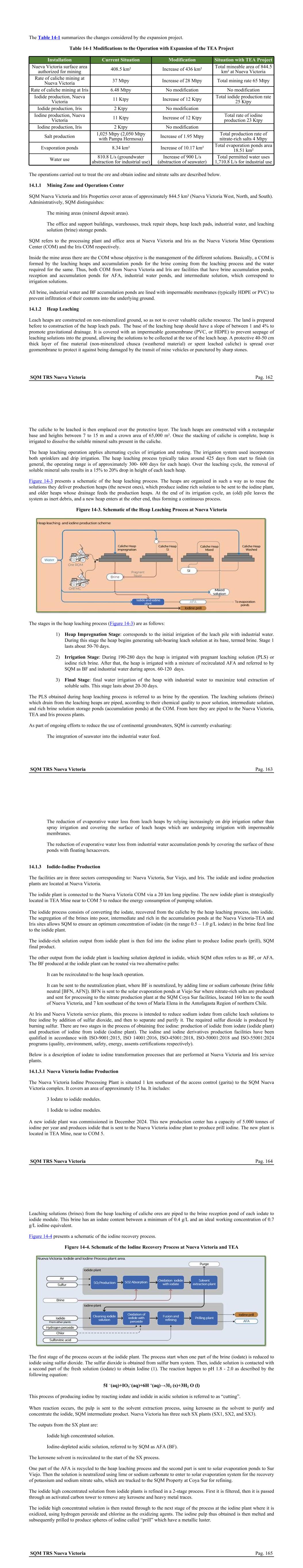The Table 14-1 summarizes the changes considered by the expansion project. Table 14-1 Modifications to the Operation with Expansion of the TEA Project Installation Current Situation Modification Situation with TEA Project Nueva Victoria surface area authorized for mining 408.5 km² Increase of 436 km² Total mineable area of 844.5 km² at Nueva Victoria Rate of caliche mining at Nueva Victoria 37 Mtpy Increase of 28 Mtpy Total mining rate 65 Mtpy Rate of caliche mining at Iris 6.48 Mtpy No modification No modification Iodide production, Nueva Victoria 11 Ktpy Increase of 12 Ktpy Total iodide production rate 25 Ktpy Iodide production, Iris 2 Ktpy No modification Iodine production, Nueva Victoria 11 Ktpy Increase of 12 Ktpy Total rate of iodine production 23 Ktpy Iodine production, Iris 2 Ktpy No modification Salt production 1,025 Mtpy (2,050 Mtpy with Pampa Hermosa) Increase of 1.95 Mtpy Total production rate of nitrate-rich salts 4 Mtpy Evaporation ponds 8.34 km² Increase of 10.17 km² Total evaporation ponds area 18.51 km² Water use 810.8 L/s (groundwater abstraction for industrial use) Increase of 900 L/s (abstraction of seawater) Total permitted water uses 1,710.8 L/s for industrial use The operations carried out to treat the ore and obtain iodine and nitrate salts are described below. 14.1.1 Mining Zone and Operations Center SQM Nueva Victoria and Iris Properties cover areas of approximately 844.5 km² (Nueva Victoria West, North, and South). Administratively, SQM distinguishes: The mining areas (mineral deposit areas). The office and support buildings, warehouses, truck repair shops, heap leach pads, industrial water, and leaching solution (brine) storage ponds. SQM refers to the processing plant and office area at Nueva Victoria and Iris as the Nueva Victoria Mine Operations Center (COM) and the Iris COM respectively. Inside the mine areas there are the COM whose objective is the management of the different solutions. Basically, a COM is formed by the leaching heaps and accumulation ponds for the brine coming from the leaching process and the water required for the same. Thus, both COM from Nueva Victoria and Iris are facilities that have brine accumulation ponds, reception and accumulation ponds for AFA, industrial water ponds, and intermediate solution, which correspond to irrigation solutions. All brine, industrial water and BF accumulation ponds are lined with impermeable membranes (typically HDPE or PVC) to prevent infiltration of their contents into the underlying ground. 14.1.2 Heap Leaching Leach heaps are constructed on non-mineralized ground, so as not to cover valuable caliche resource. The land is prepared before to construction of the heap leach pads. The base of the leaching heap should have a slope of between 1 and 4% to promote gravitational drainage. It is covered with an impermeable geomembrane (PVC, or HDPE) to prevent seepage of leaching solutions into the ground, allowing the solutions to be collected at the toe of the leach heap. A protective 40-50 cm thick layer of fine material (non-mineralized chusca (weathered material) or spent leached caliche) is spread over geomembrane to protect it against being damaged by the transit of mine vehicles or punctured by sharp stones. SQM TRS Nueva Victoria Pag. 162 The caliche to be leached is then emplaced over the protective layer. The leach heaps are constructed with a rectangular base and heights between 7 to 15 m and a crown area of 65,000 m². Once the stacking of caliche is complete, heap is irrigated to dissolve the soluble mineral salts present in the caliche. The heap leaching operation applies alternating cycles of irrigation and resting. The irrigation system used incorporates both sprinklers and drip irrigation. The heap leaching process typically takes around 425 days from start to finish (in general, the operating range is of approximately 300- 600 days for each heap). Over the leaching cycle, the removal of soluble mineral salts results in a 15% to 20% drop in height of each leach heap. Figure 14-3 presents a schematic of the heap leaching process. The heaps are organized in such a way as to reuse the solutions they deliver production heaps (the newest ones), which produce iodine rich solution to be sent to the iodine plant, and older heaps whose drainage feeds the production heaps. At the end of its irrigation cycle, an (old) pile leaves the system as inert debris, and a new heap enters at the other end, thus forming a continuous process. Figure 14-3. Schematic of the Heap Leaching Process at Nueva Victoria The stages in the heap leaching process (Figure 14-3) are as follows: 1) Heap Impregnation Stage: corresponds to the initial irrigation of the leach pile with industrial water. During this stage the heap begins generating salt-bearing leach solution at its base, termed brine. Stage 1 lasts about 50-70 days. 2) Irrigation Stage: During 190-280 days the heap is irrigated with pregnant leaching solution (PLS) or iodine rich brine. After that, the heap is irrigated with a mixture of recirculated AFA and referred to by SQM as BF and industrial water during aprox. 60-120 days. 3) Final Stage: final water irrigation of the heap with industrial water to maximize total extraction of soluble salts. This stage lasts about 20-30 days. The PLS obtained during heap leaching process is referred to as brine by the operation. The leaching solutions (brines) which drain from the leaching heaps are piped, according to their chemical quality to poor solution, intermediate solution, and rich brine solution storage ponds (accumulation ponds) at the COM. From here they are piped to the Nueva Victoria, TEA and Iris process plants. As part of ongoing efforts to reduce the use of continental groundwaters, SQM is currently evaluating: The integration of seawater into the industrial water feed. SQM TRS Nueva Victoria Pag. 163 The reduction of evaporative water loss from leach heaps by relying increasingly on drip irrigation rat