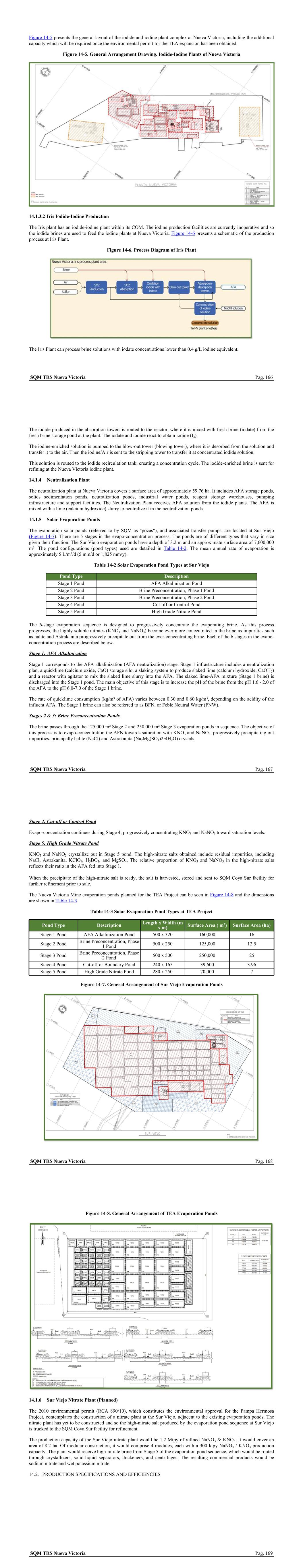 Figure 14-5 presents the general layout of the iodide and iodine plant complex at Nueva Victoria, including the additional capacity which will be required once the environmental permit for the TEA expansion has been obtained. Figure 14-5. General Arrangement Drawing. Iodide-Iodine Plants of Nueva Victoria 14.1.3.2 Iris Iodide-Iodine Production The Iris plant has an iodide-iodine plant within its COM. The iodine production facilities are currently inoperative and so the iodide brines are used to feed the iodine plants at Nueva Victoria. Figure 14-6 presents a schematic of the production process at Iris Plant. Figure 14-6. Process Diagram of Iris Plant The Iris Plant can process brine solutions with iodate concentrations lower than 0.4 g/L iodine equivalent. SQM TRS Nueva Victoria Pag. 166 The iodide produced in the absorption towers is routed to the reactor, where it is mixed with fresh brine (iodate) from the fresh brine storage pond at the plant. The iodate and iodide react to obtain iodine (I2). The iodine-enriched solution is pumped to the blow-out tower (blowing tower), where it is desorbed from the solution and transfer it to the air. Then the iodine/Air is sent to the stripping tower to transfer it at concentrated iodide solution. This solution is routed to the iodide recirculation tank, creating a concentration cycle. The iodide-enriched brine is sent for refining at the Nueva Victoria iodine plant. 14.1.4 Neutralization Plant The neutralization plant at Nueva Victoria covers a surface area of approximately 59.76 ha. It includes AFA storage ponds, solids sedimentation ponds, neutralization ponds, industrial water ponds, reagent storage warehouses, pumping infrastructure and support facilities. The Neutralization Plant receives AFA solution from the iodide plants. The AFA is mixed with a lime (calcium hydroxide) slurry to neutralize it in the neutralization ponds. 14.1.5 Solar Evaporation Ponds The evaporation solar ponds (referred to by SQM as "pozas"), and associated transfer pumps, are located at Sur Viejo (Figure 14-7). There are 5 stages in the evapo-concentration process. The ponds are of different types that vary in size given their function. The Sur Viejo evaporation ponds have a depth of 3.2 m and an approximate surface area of 7,600,000 m2. The pond configurations (pond types) used are detailed in Table 14-2. The mean annual rate of evaporation is approximately 5 L/m²/d (5 mm/d or 1,825 mm/y). Table 14-2 Solar Evaporation Pond Types at Sur Viejo Pond Type Description Stage 1 Pond AFA Alkalinization Pond Stage 2 Pond Brine Preconcentration, Phase 1 Pond Stage 3 Pond Brine Preconcentration, Phase 2 Pond Stage 4 Pond Cut-off or Control Pond Stage 5 Pond High Grade Nitrate Pond The 6-stage evaporation sequence is designed to progressively concentrate the evaporating brine. As this process progresses, the highly soluble nitrates (KNO3 and NaNO3) become ever more concentrated in the brine as impurities such as halite and Astrakanita progressively precipitate out from the ever-concentrating brine. Each of the 6 stages in the evapo- concentration process are described below. Stage 1: AFA Alkalinization Stage 1 corresponds to the AFA alkalinization (AFA neutralization) stage. Stage 1 infrastructure includes a neutralization plan, a quicklime (calcium oxide, CaO) storage silo, a slaking system to produce slaked lime (calcium hydroxide, CaOH2) and a reactor with agitator to mix the slaked lime slurry into the AFA. The slaked lime-AFA mixture (Stage 1 brine) is discharged into the Stage 1 pond. The main objective of this stage is to increase the pH of the brine from the pH 1.6 - 2.0 of the AFA to the pH 6.0-7.0 of the Stage 1 brine. The rate of quicklime consumption (kg/m³ of AFA) varies between 0.30 and 0.60 kg/m3, depending on the acidity of the influent AFA. The Stage 1 brine can also be referred to as BFN, or Feble Neutral Water (FNW). Stages 2 & 3: Brine Preconcentration Ponds The brine passes through the 125,000 m² Stage 2 and 250,000 m² Stage 3 evaporation ponds in sequence. The objective of this process is to evapo-concentration the AFN towards saturation with KNO3 and NaNO3, progressively precipitating out impurities, principally halite (NaCl) and Astrakanita (Na2Mg(SO4)2·4H2O) crystals. SQM TRS Nueva Victoria Pag. 167 Stage 4: Cut-off or Control Pond Evapo-concentration continues during Stage 4, progressively concentrating KNO3 and NaNO3 toward saturation levels. Stage 5: High Grade Nitrate Pond KNO3 and NaNO3 crystallize out in Stage 5 pond. The high-nitrate salts obtained include residual impurities, including NaCl, Astrakanita, KClO4, H3BO3, and MgSO4. The relative proportion of KNO3 and NaNO3 in the high-nitrate salts reflects their ratio in the AFA fed into Stage 1. When the precipitate of the high-nitrate salt is ready, the salt is harvested, stored and sent to SQM Coya Sur facility for further refinement prior to sale. The Nueva Victoria Mine evaporation ponds planned for the TEA Project can be seen in Figure 14-8 and the dimensions are shown in Table 14-3. Table 14-3 Solar Evaporation Pond Types at TEA Project Pond Type Description Length x Width (m x m) Surface Area ( m2) Surface Area (ha) Stage 1 Pond AFA Alkalinization Pond 500 x 320 160,000 16 Stage 2 Pond Brine Preconcentration, Phase 1 Pond 500 x 250 125,000 12.5 Stage 3 Pond Brine Preconcentration, Phase 2 Pond 500 x 500 250,000 25 Stage 4 Pond Cut-off or Boundary Pond 240 x 165 39,600 3.96 Stage 5 Pond High Grade Nitrate Pond 280 x 250 70,000 7 Figure 14-7. General Arrangement of Sur Viejo Evaporation Ponds SQM TRS Nueva Victoria Pag. 168 Figure 14-8. General Arrangement of TEA Evaporation Ponds 14.1.6 Sur Viejo Nitrate Plant (Planned) The 2010 environmental permit (RCA 890/10), which constitutes the environmental approval for the Pampa Hermosa Project, contemplates the construction of a nitrate plant at the Sur Viejo, adjacent to the existing evaporation ponds. The nitrate plant has yet to be construct