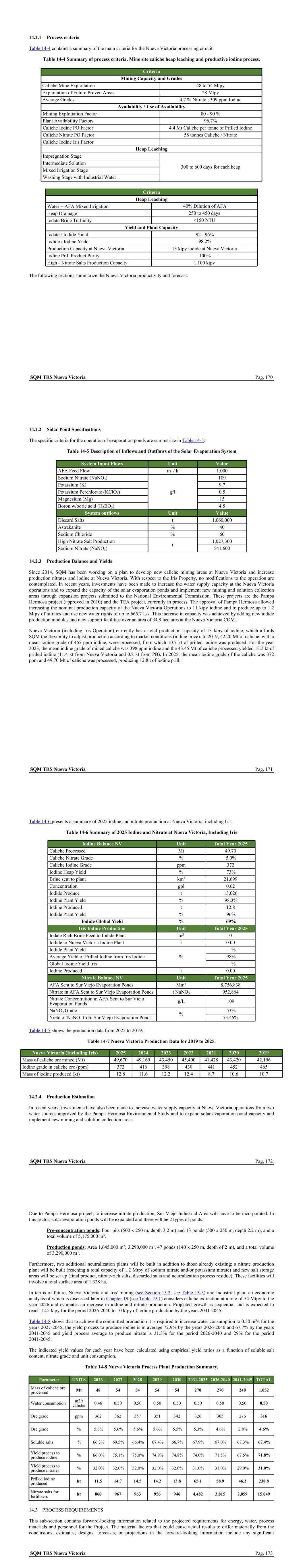 14.2.1 Process criteria Table 14-4 contains a summary of the main criteria for the Nueva Victoria processing circuit. Table 14-4 Summary of process criteria. Mine site caliche heap leaching and productive iodine process. Criteria Mining Capacity and Grades Caliche Mine Exploitation 48 to 54 Mtpy Exploitation of Future Proven Areas 28 Mtpy Average Grades 4.7 % Nitrate ; 309 ppm Iodine Availability / Use of Availability Mining Exploitation Factor 80 - 90 % Plant Availability Factors 96.7% Caliche Iodine PO Factor 4.4 Mt Caliche per tonne of Prilled Iodine Caliche Nitrate PO Factor 58 tonnes Caliche / Nitrate Caliche Iodine Iris Factor Heap Leaching Impregnation Stage 300 to 600 days for each heap Intermediate Solution Mixed Irrigation Stage Washing Stage with Industrial Water Criteria Heap Leaching Water + AFA Mixed Irrigation 40% Dilution of AFA Heap Drainage 250 to 450 days Iodate Brine Turbidity <150 NTU Yield and Plant Capacity Iodate / Iodide Yield 92 - 96% Iodide / Iodine Yield 98.2% Production Capacity at Nueva Victoria 13 ktpy iodide at Nueva Victoria Iodine Prill Product Purity 100% High - Nitrate Salts Production Capacity 1.100 ktpy The following sections summarize the Nueva Victoria productivity and forecast. SQM TRS Nueva Victoria Pag. 170 14.2.2 Solar Pond Specifications The specific criteria for the operation of evaporation ponds are summarize in Table 14-5: Table 14-5 Description of Inflows and Outflows of the Solar Evaporation System System Input Flows Unit Value AFA Feed Flow m3 / h 1,000 Sodium Nitrate (NaNO3) g/l 109 Potassium (K) 9.7 Potassium Perchlorate (KClO4) 0.5 Magnesium (Mg) 15 Boron w/boric acid (H3BO3) 4.5 System outflows Unit Value Discard Salts t 1,060,000 Astrakanite % 40 Sodium Chloride % 60 High Nitrate Salt Production t 1,027,300 Sodium Nitrate (NaNO3) 541,600 14.2.3 Production Balance and Yields Since 2014, SQM has been working on a plan to develop new caliche mining areas at Nueva Victoria and increase production nitrates and iodine at Nueva Victoria. With respect to the Iris Property, no modifications to the operation are contemplated. In recent years, investments have been made to increase the water supply capacity at the Nueva Victoria operations and to expand the capacity of the solar evaporation ponds and implement new mining and solution collection areas through expansion projects submitted to the National Environmental Commission. These projects are the Pampa Hermosa project (approved in 2010) and the TEA project, currently in process. The approval of Pampa Hermosa allowed increasing the nominal production capacity of the Nueva Victoria Operations to 11 ktpy iodine and to produce up to 1.2 Mtpy of nitrates and use new water rights of up to 665.7 L/s. This increase in capacity was achieved by adding new iodide production modules and new support facilities over an area of 34.9 hectares at the Nueva Victoria COM. Nueva Victoria (including Iris Operation) currently has a total production capacity of 13 ktpy of iodine, which affords SQM the flexibility to adjust production according to market conditions (iodine price). In 2019, 42.20 Mt of caliche, with a mean iodine grade of 465 ppm iodine, were processed, from which 10.7 kt of prilled iodine was produced. For the year 2023, the mean iodine grade of mined caliche was 398 ppm iodine and the 43.45 Mt of caliche processed yielded 12.2 kt of prilled iodine (11.4 kt from Nueva Victoria and 0.8 kt from PB). In 2025, the mean iodine grade of the caliche was 372 ppm and 49.70 Mt of caliche was processed, producing 12.8 t of iodine prill. SQM TRS Nueva Victoria Pag. 171 Table 14-6 presents a summary of 2025 iodine and nitrate production at Nueva Victoria, including Iris. Table 14-6 Summary of 2025 Iodine and Nitrate at Nueva Victoria, Including Iris Iodine Balance NV Unit Total Year 2025 Caliche Processed Mt 49.70 Caliche Nitrate Grade % 5.0% Caliche Iodine Grade ppm 372 Iodine Heap Yield % 73% Brine sent to plant km3 21,699 Concentration gpl 0.62 Iodide Produce t 13,026 Iodine Plant Yield % 98.3% Iodine Produced t 12.8 Iodide Plant Yield % 96% Iodide Global Yield % 69% Iris Iodine Production Unit Total Year 2025 Iodate Rich Brine Feed to Iodide Plant m3 0 Iodide to Nueva Victoria Iodine Plant t 0.00 Iodide Plant Yield % —% Average Yield of Prilled Iodine from Iris Iodide 98% Global Iodine Yield Iris —% Iodine Produced t 0.00 Nitrate Balance NV Unit Total Year 2025 AFA Sent to Sur Viejo Evaporation Ponds Mm3 8,756,838 Nitrate in AFA Sent to Sur Viejo Evaporation Ponds t NaNO3 952,864 Nitrate Concentration in AFA Sent to Sur Viejo Evaporation Ponds g/L 109 NaNO3 Grade % 53% Yield of NaNO3 from Sur Viejo Evaporation Ponds 53.46% Table 14-7 shows the production data from 2025 to 2019: Table 14-7 Nueva Victoria Production Data for 2019 to 2025. Nueva Victoria (Including Iris) 2025 2024 2023 2022 2021 2020 2019 Mass of caliche ore mined (Mt) 49,670 49,169 43,450 45,400 41,428 43,420 42,196 Iodine grade in caliche ore (ppm) 372 416 398 430 441 452 465 Mass of iodine produced (kt) 12.8 11.6 12.2 12.4 8.7 10.6 10.7 14.2.4. Production Estimation In recent years, investments have also been made to increase water supply capacity at Nueva Victoria operations from two water sources approved by the Pampa Hermosa Environmental Study and to expand solar evaporation pond capacity and implement new mining and solution collection areas. SQM TRS Nueva Victoria Pag. 172 Due to Pampa Hermosa project, to increase nitrate production, Sur Viejo Industrial Area will have to be incorporated. In this sector, solar evaporation ponds will be expanded and there will be 2 types of ponds: Pre-concentration ponds: Four pits (500 x 250 m, depth 3.2 m) and 13 ponds (500 x 250 m, depth 2.2 m), and a total volume of 5,175,000 m3. Production ponds: Area 1,645,000 m2; 3,290,000 m3, 47 ponds (140 x 250 m, depth of 2 m), and a total volume of 3,290,000 m3. Furthermore, two additional neutralization plants will be built in addition to those alread