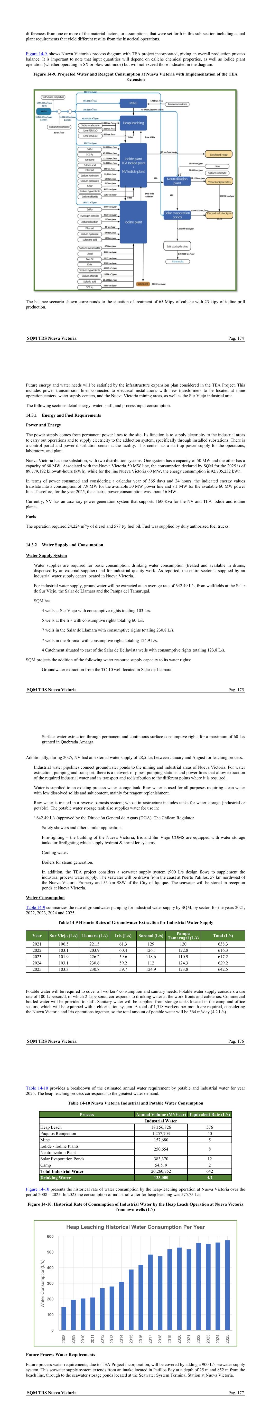 differences from one or more of the material factors, or assumptions, that were set forth in this sub-section including actual plant requirements that yield different results from the historical operations. Figure 14-9. shows Nueva Victoria's process diagram with TEA project incorporated, giving an overall production process balance. It is important to note that input quantities will depend on caliche chemical properties, as well as iodide plant operation (whether operating in SX or blow-out mode) but will not exceed those indicated in the diagram. Figure 14-9. Projected Water and Reagent Consumption at Nueva Victoria with Implementation of the TEA Extension The balance scenario shown corresponds to the situation of treatment of 65 Mtpy of caliche with 23 ktpy of iodine prill production. SQM TRS Nueva Victoria Pag. 174 Future energy and water needs will be satisfied by the infrastructure expansion plan considered in the TEA Project. This includes power transmission lines connected to electrical installations with new transformers to be located at mine operation centers, water supply centers, and the Nueva Victoria mining areas, as well as the Sur Viejo industrial area. The following sections detail energy, water, staff, and process input consumption. 14.3.1 Energy and Fuel Requirements Power and Energy The power supply comes from permanent power lines to the site. Its function is to supply electricity to the industrial areas to carry out operations and to supply electricity to the adduction system, specifically through installed substations. There is a control portal and power distribution center at the facility. This center has a start-up power supply for the operations, laboratory, and plant. Nueva Victoria has one substation, with two distribution systems. One system has a capacity of 50 MW and the other has a capacity of 60 MW. Associated with the Nueva Victoria 50 MW line, the consumption declared by SQM for the 2025 is of 89,779,192 kilowatt-hours (kWh), while for the line Nueva Victoria 60 MW, the energy consumption is 92,705,232 kWh. In terms of power consumed and considering a calendar year of 365 days and 24 hours, the indicated energy values translate into a consumption of 7.9 MW for the available 50 MW power line and 8.1 MW for the available 60 MW power line. Therefore, for the year 2025, the electric power consumption was about 16 MW. Currently, NV has an auxiliary power generation system that supports 1600Kva for the NV and TEA iodide and iodine plants. Fuels The operation required 24,224 m3/y of diesel and 578 t/y fuel oil. Fuel was supplied by duly authorized fuel trucks. 14.3.2 Water Supply and Consumption Water Supply System Water supplies are required for basic consumption, drinking water consumption (treated and available in drums, dispensed by an external supplier) and for industrial quality work. As reported, the entire sector is supplied by an industrial water supply center located in Nueva Victoria. For industrial water supply, groundwater will be extracted at an average rate of 642.49 L/s, from wellfields at the Salar de Sur Viejo, the Salar de Llamara and the Pampa del Tamarugal. SQM has: 4 wells at Sur Viejo with consumptive rights totaling 103 L/s. 5 wells at the Iris with consumptive rights totaling 60 L/s. 7 wells in the Salar de Llamara with consumptive rights totaling 230.8 L/s. 7 wells in the Soronal with consumptive rights totaling 124.9 L/s. 4 Catchment situated to east of the Salar de Bellavista wells with consumptive rights totaling 123.8 L/s. SQM projects the addition of the following water resource supply capacity to its water rights: Groundwater extraction from the TC-10 well located in Salar de Llamara. SQM TRS Nueva Victoria Pag. 175 Surface water extraction through permanent and continuous surface consumptive rights for a maximum of 60 L/s granted in Quebrada Amarga. Additionally, during 2025, NV had an external water supply of 28,5 L/s between January and August for leaching process. Industrial water pipelines connect groundwater ponds to the mining and industrial areas of Nueva Victoria. For water extraction, pumping and transport, there is a network of pipes, pumping stations and power lines that allow extraction of the required industrial water and its transport and redistribution to the different points where it is required. Water is supplied to an existing process water storage tank. Raw water is used for all purposes requiring clean water with low dissolved solids and salt content, mainly for reagent replenishment. Raw water is treated in a reverse osmosis system; whose infrastructure includes tanks for water storage (industrial or potable). The potable water storage tank also supplies water for use in: 8 642.49 L/s (approved by the Dirección General de Aguas (DGA), The Chilean Regulator Safety showers and other similar applications: Fire-fighting – the building of the Nueva Victoria, Iris and Sur Viejo COMS are equipped with water storage tanks for firefighting which supply hydrant & sprinkler systems. Cooling water. Boilers for steam generation. In addition, the TEA project considers a seawater supply system (900 L/s design flow) to supplement the industrial process water supply. The seawater will be drawn from the coast at Puerto Patillos, 58 km northwest of the Nueva Victoria Property and 55 km SSW of the City of Iquique. The seawater will be stored in reception ponds at Nueva Victoria. Water Consumption Table 14-9 summarizes the rate of groundwater pumping for industrial water supply by SQM, by sector, for the years 2021, 2022, 2023, 2024 and 2025. Table 14-9 Historic Rates of Groundwater Extraction for Industrial Water Supply Year Sur Viejo (L/s) Llamara (L/s) Iris (L/s) Soronal (L/s) Pampa Tamarugal (L/s) Total (L/s) 2021 106.5 221.5 61.3 129 120 638.3 2022 103.1 203.9 60.4 126.1 122.8 616.3 2023 101.9 226.2 59.6 118.6 110.9 617.2 2024 103.1 230.6 59.2 112 124.3 629.2 2025 103.3 230.8 59.7 124.9 123.8 642.5 Potable water will be