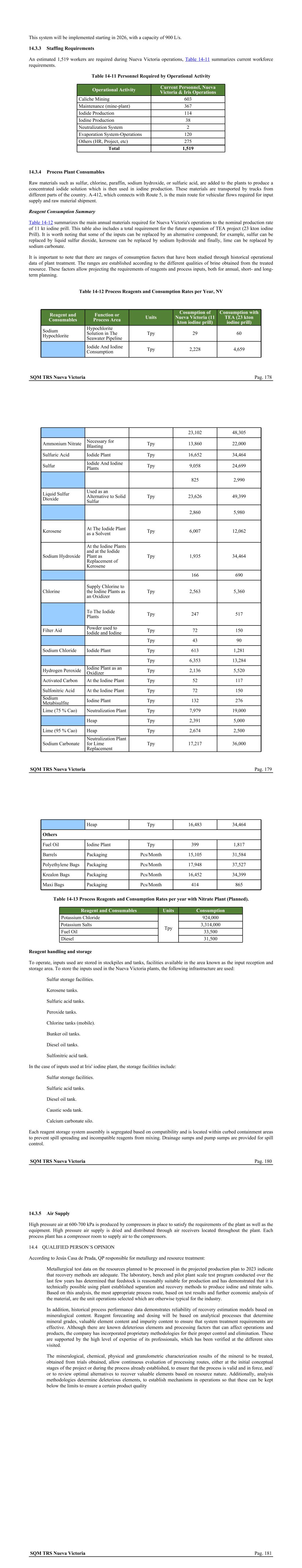 This system will be implemented starting in 2026, with a capacity of 900 L/s. 14.3.3 Staffing Requirements An estimated 1,519 workers are required during Nueva Victoria operations, Table 14-11 summarizes current workforce requirements. Table 14-11 Personnel Required by Operational Activity Operational Activity Current Personnel, Nueva Victoria & Iris Operations Caliche Mining 603 Maintenance (mine-plant) 367 Iodide Production 114 Iodine Production 38 Neutralization System 2 Evaporation System-Operations 120 Others (HR, Project, etc) 275 Total 1,519 14.3.4 Process Plant Consumables Raw materials such as sulfur, chlorine, paraffin, sodium hydroxide, or sulfuric acid, are added to the plants to produce a concentrated iodide solution which is then used in iodine production. These materials are transported by trucks from different parts of the country. A-412, which connects with Route 5, is the main route for vehicular flows required for input supply and raw material shipment. Reagent Consumption Summary Table 14-12 summarizes the main annual materials required for Nueva Victoria's operations to the nominal production rate of 11 kt iodine prill. This table also includes a total requirement for the future expansion of TEA project (23 kton iodine Prill). It is worth noting that some of the inputs can be replaced by an alternative compound; for example, sulfur can be replaced by liquid sulfur dioxide, kerosene can be replaced by sodium hydroxide and finally, lime can be replaced by sodium carbonate. It is important to note that there are ranges of consumption factors that have been studied through historical operational data of plant treatment. The ranges are established according to the different qualities of brine obtained from the treated resource. These factors allow projecting the requirements of reagents and process inputs, both for annual, short- and long- term planning. Table 14-12 Process Reagents and Consumption Rates per Year, NV Reagent and Consumables Function or Process Area Units Cosumption of Nueva Victoria (11 kton iodine prill) Consumption with TEA (23 kton iodine prill) Sodium Hypochlorite Addition Of Sodium Hypochlorite Solution in The Seawater Pipeline Suction. Tpy 29 60 Iodide And Iodine Consumption Tpy 2,228 4,659 SQM TRS Nueva Victoria Pag. 178 23,102 48,305 Ammonium Nitrate Necessary for Blasting Tpy 13,860 22,000 Sulfuric Acid Iodide Plant Tpy 16,652 34,464 Sulfur Iodide And Iodine Plants Tpy 9,058 24,699 825 2,990 Liquid Sulfur Dioxide Used as an Alternative to Solid Sulfur Tpy 23,626 49,399 2,860 5,980 Kerosene At The Iodide Plant as a Solvent Tpy 6,007 12,062 Sodium Hydroxide At the Iodine Plants and at the Iodide Plant as Replacement of Kerosene Tpy 1,935 34,464 166 690 Chlorine Supply Chlorine to the Iodine Plants as an Oxidizer Tpy 2,563 5,360 To The Iodide Plants Tpy 247 517 Filter Aid Alpha Cellulose Powder used to Iodide and Iodine Tpy 72 150 Tpy 43 90 Sodium Chloride Iodide Plant Tpy 613 1,281 Tpy 6,353 13,284 Hydrogen Peroxide Iodine Plant as an Oxidizer Tpy 2,136 5,520 Activated Carbon At the Iodine Plant Tpy 52 117 Sulfonitric Acid At the Iodine Plant Tpy 72 150 Sodium Metabisulfite Iodine Plant Tpy 132 276 Lime (75 % Cao) Neutralization Plant Tpy 7,979 19,000 Heap Tpy 2,391 5,000 Lime (95 % Cao) Heap Tpy 2,674 2,500 Sodium Carbonate Neutralization Plant for Lime Replacement Tpy 17,217 36,000 SQM TRS Nueva Victoria Pag. 179 Heap Tpy 16,483 34,464 Others Fuel Oil Iodine Plant Tpy 399 1,817 Barrels Packaging Pcs/Month 15,105 31,584 Polyethylene Bags Packaging Pcs/Month 17,948 37,527 Krealon Bags Packaging Pcs/Month 16,452 34,399 Maxi Bags Packaging Pcs/Month 414 865 Table 14-13 Process Reagents and Consumption Rates per year with Nitrate Plant (Planned). Reagent and Consumables Units Consumption Potassium Chloride Tpy 924,000 Potassium Salts 3,314,000 Fuel Oil 33,500 Diesel 31,500 Reagent handling and storage To operate, inputs used are stored in stockpiles and tanks, facilities available in the area known as the input reception and storage area. To store the inputs used in the Nueva Victoria plants, the following infrastructure are used: Sulfur storage facilities. Kerosene tanks. Sulfuric acid tanks. Peroxide tanks. Chlorine tanks (mobile). Bunker oil tanks. Diesel oil tanks. Sulfonitric acid tank. In the case of inputs used at Iris' iodine plant, the storage facilities include: Sulfur storage facilities. Sulfuric acid tanks. Diesel oil tank. Caustic soda tank. Calcium carbonate silo. Each reagent storage system assembly is segregated based on compatibility and is located within curbed containment areas to prevent spill spreading and incompatible reagents from mixing. Drainage sumps and pump sumps are provided for spill control. SQM TRS Nueva Victoria Pag. 180 14.3.5 Air Supply High pressure air at 600-700 kPa is produced by compressors in place to satisfy the requirements of the plant as well as the equipment. High pressure air supply is dried and distributed through air receivers located throughout the plant. Each process plant has a compressor room to supply air to the compressors. 14.4 QUALIFIED PERSON´S OPINION According to Jesús Casa de Prada, QP responsible for metallurgy and resource treatment: Metallurgical test data on the resources planned to be processed in the projected production plan to 2023 indicate that recovery methods are adequate. The laboratory, bench and pilot plant scale test program conducted over the last few years has determined that feedstock is reasonably suitable for production and has demonstrated that it is technically possible using plant established separation and recovery methods to produce iodine and nitrate salts. Based on this analysis, the most appropriate process route, based on test results and further economic analysis of the material, are the unit operations selected which are otherwise typical for the industry. In addition, historical process performance data demonstrates reliability of recovery estimation models 