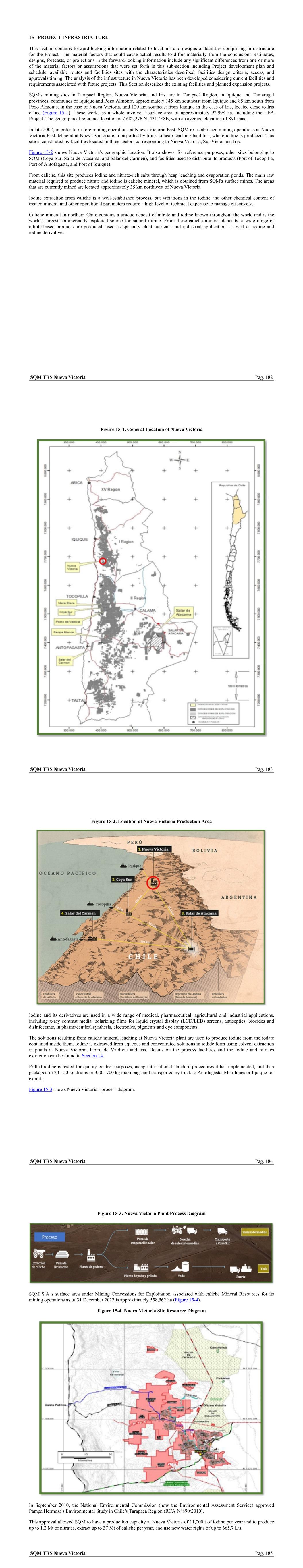 15 PROJECT INFRASTRUCTURE This section contains forward-looking information related to locations and designs of facilities comprising infrastructure for the Project. The material factors that could cause actual results to differ materially from the conclusions, estimates, designs, forecasts, or projections in the forward-looking information include any significant differences from one or more of the material factors or assumptions that were set forth in this sub-section including Project development plan and schedule, available routes and facilities sites with the characteristics described, facilities design criteria, access, and approvals timing. The analysis of the infrastructure in Nueva Victoria has been developed considering current facilities and requirements associated with future projects. This Section describes the existing facilities and planned expansion projects. SQM's mining sites in Tarapacá Region, Nueva Victoria, and Iris, are in Tarapacá Region, in Iquique and Tamarugal provinces, communes of Iquique and Pozo Almonte, approximately 145 km southeast from Iquique and 85 km south from Pozo Almonte, in the case of Nueva Victoria, and 120 km southeast from Iquique in the case of Iris, located close to Iris office (Figure 15-1). These works as a whole involve a surface area of approximately 92.998 ha, including the TEA Project. The geographical reference location is 7,682,276 N, 431,488E, with an average elevation of 891 masl. In late 2002, in order to restore mining operations at Nueva Victoria East, SQM re-established mining operations at Nueva Victoria East. Mineral at Nueva Victoria is transported by truck to heap leaching facilities, where iodine is produced. This site is constituted by facilities located in three sectors corresponding to Nueva Victoria, Sur Viejo, and Iris. Figure 15-2 shows Nueva Victoria's geographic location. It also shows, for reference purposes, other sites belonging to SQM (Coya Sur, Salar de Atacama, and Salar del Carmen), and facilities used to distribute its products (Port of Tocopilla, Port of Antofagasta, and Port of Iquique). From caliche, this site produces iodine and nitrate-rich salts through heap leaching and evaporation ponds. The main raw material required to produce nitrate and iodine is caliche mineral, which is obtained from SQM's surface mines. The areas that are currently mined are located approximately 35 km northwest of Nueva Victoria. Iodine extraction from caliche is a well-established process, but variations in the iodine and other chemical content of treated mineral and other operational parameters require a high level of technical expertise to manage effectively. Caliche mineral in northern Chile contains a unique deposit of nitrate and iodine known throughout the world and is the world's largest commercially exploited source for natural nitrate. From these caliche mineral deposits, a wide range of nitrate-based products are produced, used as specialty plant nutrients and industrial applications as well as iodine and iodine derivatives. SQM TRS Nueva Victoria Pag. 182 Figure 15-1. General Location of Nueva Victoria SQM TRS Nueva Victoria Pag. 183 Figure 15-2. Location of Nueva Victoria Production Area Iodine and its derivatives are used in a wide range of medical, pharmaceutical, agricultural and industrial applications, including x-ray contrast media, polarizing films for liquid crystal display (LCD/LED) screens, antiseptics, biocides and disinfectants, in pharmaceutical synthesis, electronics, pigments and dye components. The solutions resulting from caliche mineral leaching at Nueva Victoria plant are used to produce iodine from the iodate contained inside them. Iodine is extracted from aqueous and concentrated solutions in iodide form using solvent extraction in plants at Nueva Victoria, Pedro de Valdivia and Iris. Details on the process facilities and the iodine and nitrates extraction can be found in Section 14. Prilled iodine is tested for quality control purposes, using international standard procedures it has implemented, and then packaged in 20 - 50 kg drums or 350 - 700 kg maxi bags and transported by truck to Antofagasta, Mejillones or Iquique for export. Figure 15-3 shows Nueva Victoria's process diagram. SQM TRS Nueva Victoria Pag. 184 Figure 15-3. Nueva Victoria Plant Process Diagram SQM S.A.'s surface area under Mining Concessions for Exploitation associated with caliche Mineral Resources for its mining operations as of 31 December 2022 is approximately 558,562 ha (Figure 15-4). Figure 15-4. Nueva Victoria Site Resource Diagram In September 2010, the National Environmental Commission (now the Environmental Assessment Service) approved Pampa Hermosa's Environmental Study in Chile's Tarapacá Region (RCA N°890/2010). This approval allowed SQM to have a production capacity at Nueva Victoria of 11,000 t of iodine per year and to produce up to 1.2 Mt of nitrates, extract up to 37 Mt of caliche per year, and use new water rights of up to 665.7 L/s. SQM TRS Nueva Victoria Pag. 185