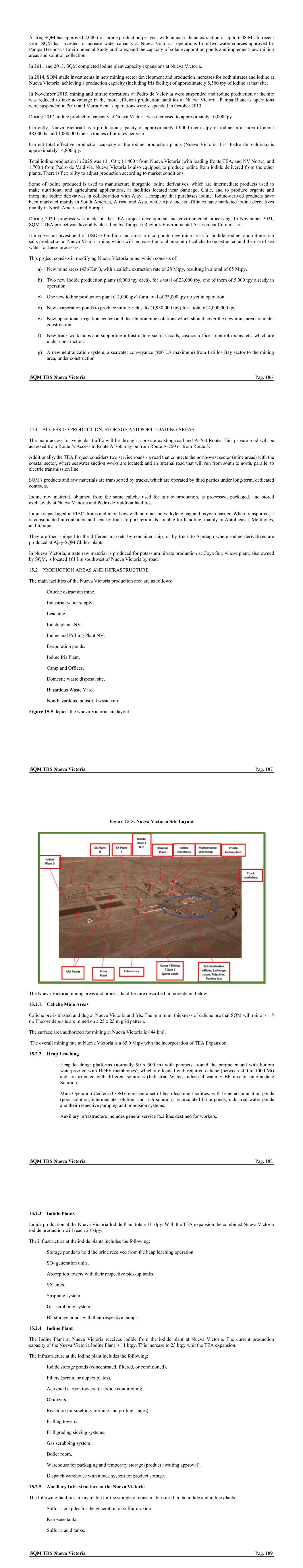 At Iris, SQM has approved 2,000 t of iodine production per year with annual caliche extraction of up to 6.48 Mt. In recent years SQM has invested to increase water capacity at Nueva Victoria's operations from two water sources approved by Pampa Hermosa's Environmental Study and to expand the capacity of solar evaporation ponds and implement new mining areas and solution collection. In 2011 and 2013, SQM completed iodine plant capacity expansions at Nueva Victoria. In 2014, SQM made investments in new mining sector development and production increases for both nitrates and iodine at Nueva Victoria, achieving a production capacity (including Iris facility) of approximately 8,500 tpy of iodine at that site. In November 2015, mining and nitrate operations at Pedro de Valdivia were suspended and iodine production at the site was reduced to take advantage in the more efficient production facilities at Nueva Victoria. Pampa Blanca's operations were suspended in 2010 and María Elena's operations were suspended in October 2013. During 2017, iodine production capacity at Nueva Victoria was increased to approximately 10,000 tpy. Currently, Nueva Victoria has a production capacity of approximately 13,000 metric tpy of iodine in an area of about 48,000 ha and 1,000,000 metric tonnes of nitrates per year. Current total effective production capacity at the iodine production plants (Nueva Victoria, Iris, Pedro de Valdivia) is approximately 14,800 tpy. Total iodine production in 2025 was 13,100 t; 11,400 t from Nueva Victoria (with loading fronts TEA, and NV Norte), and 1,700 t from Pedro de Valdivia. Nueva Victoria is also equipped to produce iodine from iodide delivered from the other plants. There is flexibility to adjust production according to market conditions. Some of iodine produced is used to manufacture inorganic iodine derivatives, which are intermediate products used to make nutritional and agricultural applications, at facilities located near Santiago, Chile, and to produce organic and inorganic iodine derivatives in collaboration with Ajay, a company that purchases iodine. Iodine-derived products have been marketed mainly in South America, Africa, and Asia, while Ajay and its affiliates have marketed iodine derivatives mainly in North America and Europe. During 2020, progress was made on the TEA project development and environmental processing. In November 2021, SQM's TEA project was favorably classified by Tarapacá Region's Environmental Assessment Commission. It involves an investment of USD350 million and aims to incorporate new mine areas for iodide, iodine, and nitrate-rich salts production at Nueva Victoria mine, which will increase the total amount of caliche to be extracted and the use of sea water for these processes. This project consists in modifying Nueva Victoria mine, which consists of: a) New mine areas (436 Km2), with a caliche extraction rate of 28 Mtpy, resulting in a total of 65 Mtpy. b) Two new Iodide production plants (6,000 tpy each), for a total of 23,000 tpy, one of them of 5,000 tpy already in operation. c) One new iodine production plant (12,000 tpy) for a total of 23,000 tpy no yet in operation. d) New evaporation ponds to produce nitrate-rich salts (1,950,000 tpy) for a total of 4,000,000 tpy. e) New operational irrigation centers and distribution pipe solutions which should cover the new mine area are under construction. f) New truck workshops and supporting infrastructure such as roads, casinos, offices, control rooms, etc. which are under construction. g) A new neutralization system, a seawater conveyance (900 L/s maximum) from Patillos Bay sector to the mining area, under construction. SQM TRS Nueva Victoria Pag. 186 15.1 ACCESS TO PRODUCTION, STORAGE AND PORT LOADING AREAS The main access for vehicular traffic will be through a private existing road and A-760 Route. This private road will be accessed from Route 5. Access to Route A-760 may be from Route A-750 or from Route 5. Additionally, the TEA Project considers two service roads - a road that connects the north-west sector (mine areas) with the coastal sector, where seawater suction works are located; and an internal road that will run from south to north, parallel to electric transmission line. SQM's products and raw materials are transported by trucks, which are operated by third parties under long-term, dedicated contracts. Iodine raw material, obtained from the same caliche used for nitrate production, is processed, packaged, and stored exclusively at Nueva Victoria and Pedro de Valdivia facilities. Iodine is packaged in FIBC drums and maxi-bags with an inner polyethylene bag and oxygen barrier. When transported, it is consolidated in containers and sent by truck to port terminals suitable for handling, mainly in Antofagasta, Mejillones, and Iquique. They are then shipped to the different markets by container ship, or by truck to Santiago where iodine derivatives are produced at Ajay-SQM Chile's plants. In Nueva Victoria, nitrate raw material is produced for potassium nitrate production at Coya Sur, whose plant, also owned by SQM, is located 161 km southwest of Nueva Victoria by road. 15.2 PRODUCTION AREAS AND INFRASTRUCTURE The main facilities of the Nueva Victoria production area are as follows: Caliche extraction mine. Industrial water supply. Leaching. Iodide plants NV. Iodine and Prilling Plant NV. Evaporation ponds. Iodine Iris Plant. Camp and Offices. Domestic waste disposal site. Hazardous Waste Yard. Non-hazardous industrial waste yard. Figure 15-5 depicts the Nueva Victoria site layout. SQM TRS Nueva Victoria Pag. 187 Figure 15-5. Nueva Victoria Site Layout The Nueva Victoria mining areas and process facilities are described in more detail below. 15.2.1. Caliche Mine Areas Caliche ore is blasted and dug at Nueva Victoria and Iris. The minimum thickness of caliche ore that SQM will mine is 1.5 m. The ore deposits are mined on a 25 x 25 m grid pattern. The surface area authorized for mining