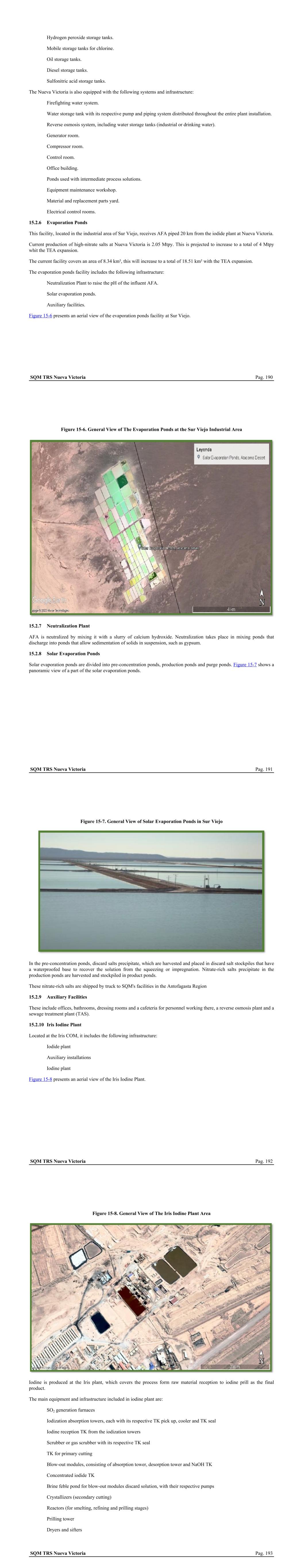 Hydrogen peroxide storage tanks. Mobile storage tanks for chlorine. Oil storage tanks. Diesel storage tanks. Sulfonitric acid storage tanks. The Nueva Victoria is also equipped with the following systems and infrastructure: Firefighting water system. Water storage tank with its respective pump and piping system distributed throughout the entire plant installation. Reverse osmosis system, including water storage tanks (industrial or drinking water). Generator room. Compressor room. Control room. Office building. Ponds used with intermediate process solutions. Equipment maintenance workshop. Material and replacement parts yard. Electrical control rooms. 15.2.6 Evaporation Ponds This facility, located in the industrial area of Sur Viejo, receives AFA piped 20 km from the iodide plant at Nueva Victoria. Current production of high-nitrate salts at Nueva Victoria is 2.05 Mtpy. This is projected to increase to a total of 4 Mtpy whit the TEA expansion. The current facility covers an area of 8.34 km², this will increase to a total of 18.51 km² with the TEA expansion. The evaporation ponds facility includes the following infrastructure: Neutralization Plant to raise the pH of the influent AFA. Solar evaporation ponds. Auxiliary facilities. Figure 15-6 presents an aerial view of the evaporation ponds facility at Sur Viejo. SQM TRS Nueva Victoria Pag. 190 Figure 15-6. General View of The Evaporation Ponds at the Sur Viejo Industrial Area 15.2.7 Neutralization Plant AFA is neutralized by mixing it with a slurry of calcium hydroxide. Neutralization takes place in mixing ponds that discharge into ponds that allow sedimentation of solids in suspension, such as gypsum. 15.2.8 Solar Evaporation Ponds Solar evaporation ponds are divided into pre-concentration ponds, production ponds and purge ponds. Figure 15-7 shows a panoramic view of a part of the solar evaporation ponds. SQM TRS Nueva Victoria Pag. 191 Figure 15-7. General View of Solar Evaporation Ponds in Sur Viejo In the pre-concentration ponds, discard salts precipitate, which are harvested and placed in discard salt stockpiles that have a waterproofed base to recover the solution from the squeezing or impregnation. Nitrate-rich salts precipitate in the production ponds are harvested and stockpiled in product ponds. These nitrate-rich salts are shipped by truck to SQM's facilities in the Antofagasta Region 15.2.9 Auxiliary Facilities These include offices, bathrooms, dressing rooms and a cafeteria for personnel working there, a reverse osmosis plant and a sewage treatment plant (TAS). 15.2.10 Iris Iodine Plant Located at the Iris COM, it includes the following infrastructure: Iodide plant Auxiliary installations Iodine plant Figure 15-8 presents an aerial view of the Iris Iodine Plant. SQM TRS Nueva Victoria Pag. 192 Figure 15-8. General View of The Iris Iodine Plant Area Iodine is produced at the Iris plant, which covers the process form raw material reception to iodine prill as the final product. The main equipment and infrastructure included in iodine plant are: SO2 generation furnaces Iodization absorption towers, each with its respective TK pick up, cooler and TK seal Iodine reception TK from the iodization towers Scrubber or gas scrubber with its respective TK seal TK for primary cutting Blow-out modules, consisting of absorption tower, desorption tower and NaOH TK Concentrated iodide TK Brine feble pond for blow-out modules discard solution, with their respective pumps Crystallizers (secondary cutting) Reactors (for smelting, refining and prilling stages) Prilling tower Dryers and sifters SQM TRS Nueva Victoria Pag. 193