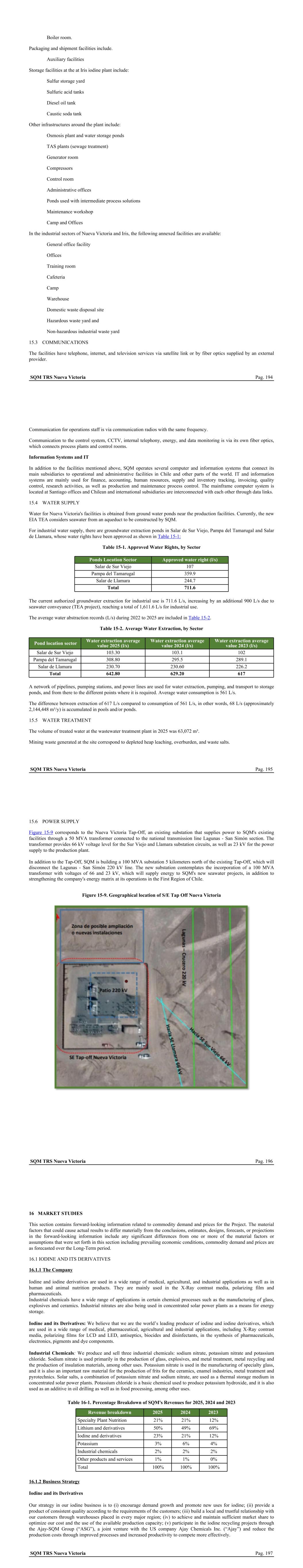 Boiler room. Packaging and shipment facilities include. Auxiliary facilities Storage facilities at the at Iris iodine plant include: Sulfur storage yard Sulfuric acid tanks Diesel oil tank Caustic soda tank Other infrastructures around the plant include: Osmosis plant and water storage ponds TAS plants (sewage treatment) Generator room Compressors Control room Administrative offices Ponds used with intermediate process solutions Maintenance workshop Camp and Offices In the industrial sectors of Nueva Victoria and Iris, the following annexed facilities are available: General office facility Offices Training room Cafeteria Camp Warehouse Domestic waste disposal site Hazardous waste yard and Non-hazardous industrial waste yard 15.3 COMMUNICATIONS The facilities have telephone, internet, and television services via satellite link or by fiber optics supplied by an external provider. SQM TRS Nueva Victoria Pag. 194 Communication for operations staff is via communication radios with the same frequency. Communication to the control system, CCTV, internal telephony, energy, and data monitoring is via its own fiber optics, which connects process plants and control rooms. Information Systems and IT In addition to the facilities mentioned above, SQM operates several computer and information systems that connect its main subsidiaries to operational and administrative facilities in Chile and other parts of the world. IT and information systems are mainly used for finance, accounting, human resources, supply and inventory tracking, invoicing, quality control, research activities, as well as production and maintenance process control. The mainframe computer system is located at Santiago offices and Chilean and international subsidiaries are interconnected with each other through data links. 15.4 WATER SUPPLY Water for Nueva Victoria's facilities is obtained from ground water ponds near the production facilities. Currently, the new EIA TEA considers seawater from an aqueduct to be constructed by SQM. For industrial water supply, there are groundwater extraction ponds in Salar de Sur Viejo, Pampa del Tamarugal and Salar de Llamara, whose water rights have been approved as shown in Table 15-1: Table 15-1. Approved Water Rights, by Sector Ponds Location Sector Approved water right (l/s) Salar de Sur Viejo 107 Pampa del Tamarugal 359.9 Salar de Llamara 244.7 Total 711.6 The current authorized groundwater extraction for industrial use is 711.6 L/s, increasing by an additional 900 L/s due to seawater conveyance (TEA project), reaching a total of 1,611.6 L/s for industrial use. The average water abstraction records (L/s) during 2022 to 2025 are included in Table 15-2. Table 15-2. Average Water Extraction, by Sector Pond location sector Water extraction average value 2025 (l/s) Water extraction average value 2024 (l/s) Water extraction average value 2023 (l/s) Salar de Sur Viejo 103.30 103.1 102 Pampa del Tamarugal 308.80 295.5 289.1 Salar de Llamara 230.70 230.60 226.2 Total 642.80 629.20 617 A network of pipelines, pumping stations, and power lines are used for water extraction, pumping, and transport to storage ponds, and from there to the different points where it is required. Average water consumption is 561 L/s. The difference between extraction of 617 L/s compared to consumption of 561 L/s, in other words, 68 L/s (approximately 2,144,448 m³/y) is accumulated in pools and/or ponds. 15.5 WATER TREATMENT The volume of treated water at the wastewater treatment plant in 2025 was 63,072 m³. Mining waste generated at the site correspond to depleted heap leaching, overburden, and waste salts. SQM TRS Nueva Victoria Pag. 195 15.6 POWER SUPPLY Figure 15-9 corresponds to the Nueva Victoria Tap-Off, an existing substation that supplies power to SQM's existing facilities through a 50 MVA transformer connected to the national transmission line Lagunas - San Simón section. The transformer provides 66 kV voltage level for the Sur Viejo and Llamara substation circuits, as well as 23 kV for the power supply to the production plant. In addition to the Tap-Off, SQM is building a 100 MVA substation 5 kilometers north of the existing Tap-Off, which will disconnect the Lagunas - San Simón 220 kV line. The new substation contemplates the incorporation of a 100 MVA transformer with voltages of 66 and 23 kV, which will supply energy to SQM's new seawater projects, in addition to strengthening the company's energy matrix at its operations in the First Region of Chile. Figure 15-9. Geographical location of S/E Tap Off Nueva Victoria SQM TRS Nueva Victoria Pag. 196 16 MARKET STUDIES This section contains forward-looking information related to commodity demand and prices for the Project. The material factors that could cause actual results to differ materially from the conclusions, estimates, designs, forecasts, or projections in the forward-looking information include any significant differences from one or more of the material factors or assumptions that were set forth in this section including prevailing economic conditions, commodity demand and prices are as forecasted over the Long-Term period. 16.1 IODINE AND ITS DERIVATIVES 16.1.1 The Company Iodine and iodine derivatives are used in a wide range of medical, agricultural, and industrial applications as well as in human and animal nutrition products. They are mainly used in the X-Ray contrast media, polarizing film and pharmaceuticals. Industrial chemicals have a wide range of applications in certain chemical processes such as the manufacturing of glass, explosives and ceramics. Industrial nitrates are also being used in concentrated solar power plants as a means for energy storage. Iodine and its Derivatives: We believe that we are the world’s leading producer of iodine and iodine derivatives, which are used in a wide range of medical, pharmaceutical, agricultural and industrial applications, including X-Ray contrast media, polarizing films for LCD and LED, antiseptics, b