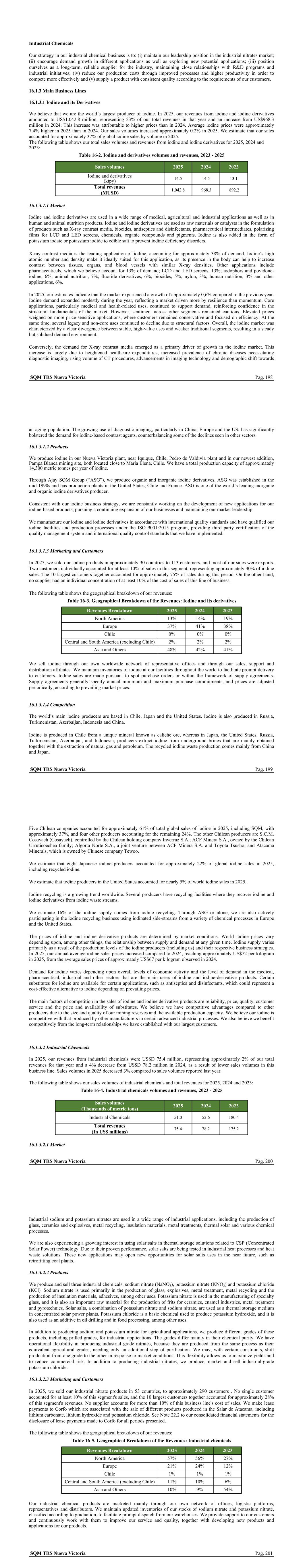 Industrial Chemicals Our strategy in our industrial chemical business is to: (i) maintain our leadership position in the industrial nitrates market; (ii) encourage demand growth in different applications as well as exploring new potential applications; (iii) position ourselves as a long-term, reliable supplier for the industry, maintaining close relationships with R&D programs and industrial initiatives; (iv) reduce our production costs through improved processes and higher productivity in order to compete more effectively and (v) supply a product with consistent quality according to the requirements of our customers. 16.1.3 Main Business Lines 16.1.3.1 Iodine and its Derivatives We believe that we are the world’s largest producer of iodine. In 2025, our revenues from iodine and iodine derivatives amounted to US$1.042.8 million, representing 23% of our total revenues in that year and an increase from US$968.3 million in 2024. This increase was attributable to higher prices than in 2024. Average iodine prices were approximately 7.4% higher in 2025 than in 2024. Our sales volumes increased approximately 0.2% in 2025. We estimate that our sales accounted for approximately 37% of global iodine sales by volume in 2025. The following table shows our total sales volumes and revenues from iodine and iodine derivatives for 2025, 2024 and 2023: Table 16-2. Iodine and derivatives volumes and revenues, 2023 - 2025 Sales volumes 2025 2024 2023 Iodine and derivatives (ktpy) 14.5 14.5 13.1 Total revenues (MUSD) 1,042.8 968.3 892.2 16.1.3.1.1 Market Iodine and iodine derivatives are used in a wide range of medical, agricultural and industrial applications as well as in human and animal nutrition products. Iodine and iodine derivatives are used as raw materials or catalysts in the formulation of products such as X-ray contrast media, biocides, antiseptics and disinfectants, pharmaceutical intermediates, polarizing films for LCD and LED screens, chemicals, organic compounds and pigments. Iodine is also added in the form of potassium iodate or potassium iodide to edible salt to prevent iodine deficiency disorders. X-ray contrast media is the leading application of iodine, accounting for approximately 38% of demand. Iodine’s high atomic number and density make it ideally suited for this application, as its presence in the body can help to increase contrast between tissues, organs, and blood vessels with similar X-ray densities. Other applications include pharmaceuticals, which we believe account for 13% of demand; LCD and LED screens, 13%; iodophors and povidone- iodine, 6%; animal nutrition, 7%; fluoride derivatives, 6%; biocides, 5%; nylon, 3%; human nutrition, 3% and other applications, 6%. In 2025, our estimates indicate that the market experienced a growth of approximately 0,6% compared to the previous year. Iodine demand expanded modestly during the year, reflecting a market driven more by resilience than momentum. Core applications, particularly medical and health-related uses, continued to support demand, reinforcing confidence in the structural fundamentals of the market. However, sentiment across other segments remained cautious. Elevated prices weighed on more price-sensitive applications, where customers remained conservative and focused on efficiency. At the same time, several legacy and non-core uses continued to decline due to structural factors. Overall, the iodine market was characterized by a clear divergence between stable, high-value uses and weaker traditional segments, resulting in a steady but subdued demand environment. Conversely, the demand for X-ray contrast media emerged as a primary driver of growth in the iodine market. This increase is largely due to heightened healthcare expenditures, increased prevalence of chronic diseases necessitating diagnostic imaging, rising volume of CT procedures, advancements in imaging technology and demographic shift towards SQM TRS Nueva Victoria Pag. 198 an aging population. The growing use of diagnostic imaging, particularly in China, Europe and the US, has significantly bolstered the demand for iodine-based contrast agents, counterbalancing some of the declines seen in other sectors. 16.1.3.1.2 Products We produce iodine in our Nueva Victoria plant, near Iquique, Chile, Pedro de Valdivia plant and in our newest addition, Pampa Blanca mining site, both located close to María Elena, Chile. We have a total production capacity of approximately 14,300 metric tonnes per year of iodine. Through Ajay SQM Group (“ASG”), we produce organic and inorganic iodine derivatives. ASG was established in the mid-1990s and has production plants in the United States, Chile and France. ASG is one of the world’s leading inorganic and organic iodine derivatives producer. Consistent with our iodine business strategy, we are constantly working on the development of new applications for our iodine-based products, pursuing a continuing expansion of our businesses and maintaining our market leadership. We manufacture our iodine and iodine derivatives in accordance with international quality standards and have qualified our iodine facilities and production processes under the ISO 9001:2015 program, providing third party certification of the quality management system and international quality control standards that we have implemented. 16.1.3.1.3 Marketing and Customers In 2025, we sold our iodine products in approximately 30 countries to 113 customers, and most of our sales were exports. Two customers individually accounted for at least 10% of sales in this segment, representing approximately 30% of iodine sales. The 10 largest customers together accounted for approximately 75% of sales during this period. On the other hand, no supplier had an individual concentration of at least 10% of the cost of sales of this line of business. The following table shows the geographical breakdown of our revenues: Table 16-3. Geographical Breakdown of the Revenues: Iodine and i