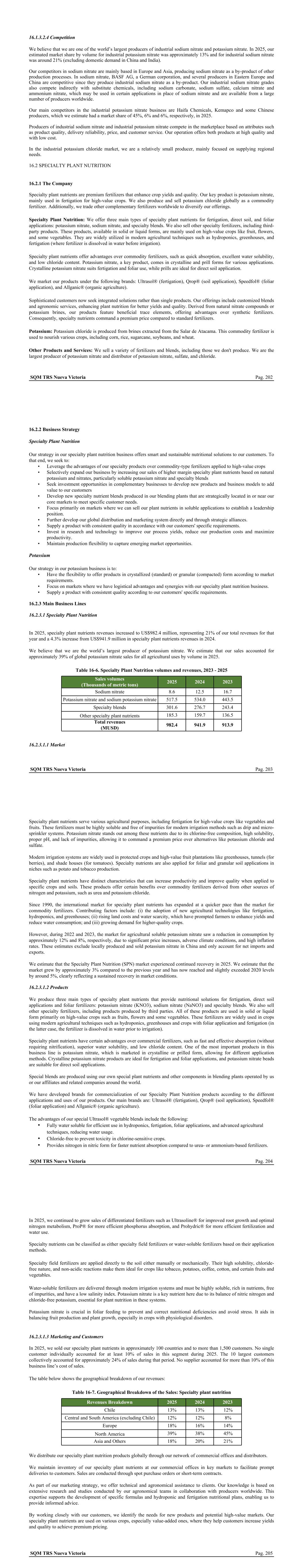 16.1.3.2.4 Competition We believe that we are one of the world’s largest producers of industrial sodium nitrate and potassium nitrate. In 2025, our estimated market share by volume for industrial potassium nitrate was approximately 13% and for industrial sodium nitrate was around 21% (excluding domestic demand in China and India). Our competitors in sodium nitrate are mainly based in Europe and Asia, producing sodium nitrate as a by-product of other production processes. In sodium nitrate, BASF AG, a German corporation, and several producers in Eastern Europe and China are competitive since they produce industrial sodium nitrate as a by-product. Our industrial sodium nitrate grades also compete indirectly with substitute chemicals, including sodium carbonate, sodium sulfate, calcium nitrate and ammonium nitrate, which may be used in certain applications in place of sodium nitrate and are available from a large number of producers worldwide. Our main competitors in the industrial potassium nitrate business are Haifa Chemicals, Kemapco and some Chinese producers, which we estimate had a market share of 45%, 6% and 6%, respectively, in 2025. Producers of industrial sodium nitrate and industrial potassium nitrate compete in the marketplace based on attributes such as product quality, delivery reliability, price, and customer service. Our operation offers both products at high quality and with low cost. In the industrial potassium chloride market, we are a relatively small producer, mainly focused on supplying regional needs. 16.2 SPECIALTY PLANT NUTRITION 16.2.1 The Company Specialty plant nutrients are premium fertilizers that enhance crop yields and quality. Our key product is potassium nitrate, mainly used in fertigation for high-value crops. We also produce and sell potassium chloride globally as a commodity fertilizer. Additionally, we trade other complementary fertilizers worldwide to diversify our offerings. Specialty Plant Nutrition: We offer three main types of specialty plant nutrients for fertigation, direct soil, and foliar applications: potassium nitrate, sodium nitrate, and specialty blends. We also sell other specialty fertilizers, including third- party products. These products, available in solid or liquid forms, are mainly used on high-value crops like fruit, flowers, and some vegetables. They are widely utilized in modern agricultural techniques such as hydroponics, greenhouses, and fertigation (where fertilizer is dissolved in water before irrigation). Specialty plant nutrients offer advantages over commodity fertilizers, such as quick absorption, excellent water solubility, and low chloride content. Potassium nitrate, a key product, comes in crystalline and prill forms for various applications. Crystalline potassium nitrate suits fertigation and foliar use, while prills are ideal for direct soil application. We market our products under the following brands: Ultrasol® (fertigation), Qrop® (soil application), Speedfol® (foliar application), and Allganic® (organic agriculture). Sophisticated customers now seek integrated solutions rather than single products. Our offerings include customized blends and agronomic services, enhancing plant nutrition for better yields and quality. Derived from natural nitrate compounds or potassium brines, our products feature beneficial trace elements, offering advantages over synthetic fertilizers. Consequently, specialty nutrients command a premium price compared to standard fertilizers. Potassium: Potassium chloride is produced from brines extracted from the Salar de Atacama. This commodity fertilizer is used to nourish various crops, including corn, rice, sugarcane, soybeans, and wheat. Other Products and Services: We sell a variety of fertilizers and blends, including those we don't produce. We are the largest producer of potassium nitrate and distributor of potassium nitrate, sulfate, and chloride. SQM TRS Nueva Victoria Pag. 202 16.2.2 Business Strategy Specialty Plant Nutrition Our strategy in our specialty plant nutrition business offers smart and sustainable nutritional solutions to our customers. To that end, we seek to: • Leverage the advantages of our specialty products over commodity-type fertilizers applied to high-value crops • Selectively expand our business by increasing our sales of higher margin specialty plant nutrients based on natural potassium and nitrates, particularly soluble potassium nitrate and specialty blends • Seek investment opportunities in complementary businesses to develop new products and business models to add value to our customers • Develop new specialty nutrient blends produced in our blending plants that are strategically located in or near our core markets to meet specific customer needs. • Focus primarily on markets where we can sell our plant nutrients in soluble applications to establish a leadership position. • Further develop our global distribution and marketing system directly and through strategic alliances. • Supply a product with consistent quality in accordance with our customers' specific requirements. • Invest in research and technology to improve our process yields, reduce our production costs and maximize productivity. • Maintain production flexibility to capture emerging market opportunities. Potassium Our strategy in our potassium business is to: • Have the flexibility to offer products in crystallized (standard) or granular (compacted) form according to market requirements. • Focus on markets where we have logistical advantages and synergies with our specialty plant nutrition business. • Supply a product with consistent quality according to our customers' specific requirements. 16.2.3 Main Business Lines 16.2.3.1 Specialty Plant Nutrition In 2025, specialty plant nutrients revenues increased to US$982.4 million, representing 21% of our total revenues for that year and a 4.3% increase from US$941.9 million in specialty plant nutrients revenues in 2024.