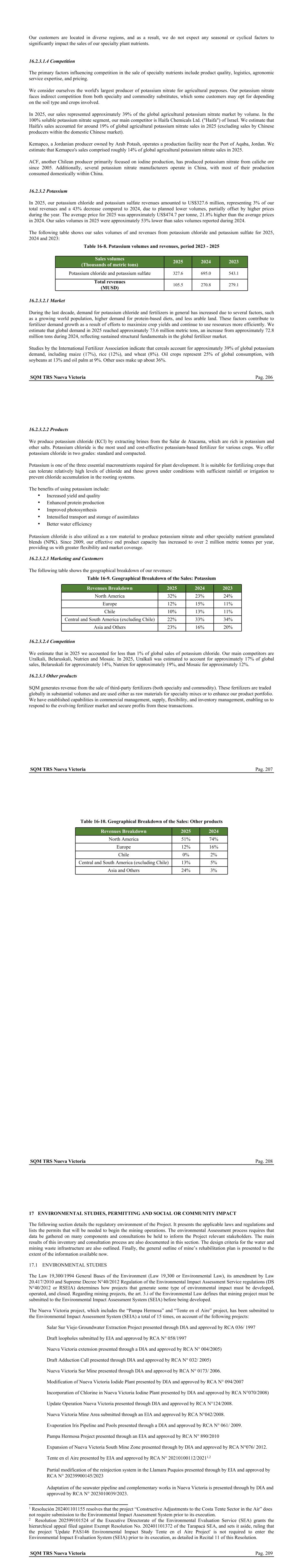 Our customers are located in diverse regions, and as a result, we do not expect any seasonal or cyclical factors to significantly impact the sales of our specialty plant nutrients. 16.2.3.1.4 Competition The primary factors influencing competition in the sale of specialty nutrients include product quality, logistics, agronomic service expertise, and pricing. We consider ourselves the world's largest producer of potassium nitrate for agricultural purposes. Our potassium nitrate faces indirect competition from both specialty and commodity substitutes, which some customers may opt for depending on the soil type and crops involved. In 2025, our sales represented approximately 39% of the global agricultural potassium nitrate market by volume. In the 100% soluble potassium nitrate segment, our main competitor is Haifa Chemicals Ltd. ("Haifa") of Israel. We estimate that Haifa's sales accounted for around 19% of global agricultural potassium nitrate sales in 2025 (excluding sales by Chinese producers within the domestic Chinese market). Kemapco, a Jordanian producer owned by Arab Potash, operates a production facility near the Port of Aqaba, Jordan. We estimate that Kemapco's sales comprised roughly 14% of global agricultural potassium nitrate sales in 2025. ACF, another Chilean producer primarily focused on iodine production, has produced potassium nitrate from caliche ore since 2005. Additionally, several potassium nitrate manufacturers operate in China, with most of their production consumed domestically within China. 16.2.3.2 Potassium In 2025, our potassium chloride and potassium sulfate revenues amounted to US$327.6 million, representing 3% of our total revenues and a 43% decrease compared to 2024, due to planned lower volumes, partially offset by higher prices during the year. The average price for 2025 was approximately US$474.7 per tonne, 21.8% higher than the average prices in 2024. Our sales volumes in 2025 were approximately 53% lower than sales volumes reported during 2024. The following table shows our sales volumes of and revenues from potassium chloride and potassium sulfate for 2025, 2024 and 2023: Table 16-8. Potassium volumes and revenues, period 2023 - 2025 Sales volumes (Thousands of metric tons) 2025 2024 2023 Potassium chloride and potassium sulfate 327.6 695.0 543.1 Total revenues (MUSD) 105.5 270.8 279.1 16.2.3.2.1 Market During the last decade, demand for potassium chloride and fertilizers in general has increased due to several factors, such as a growing world population, higher demand for protein-based diets, and less arable land. These factors contribute to fertilizer demand growth as a result of efforts to maximize crop yields and continue to use resources more efficiently. We estimate that global demand in 2025 reached approximately 73.6 million metric tons, an increase from approximately 72.8 million tons during 2024, reflecting sustained structural fundamentals in the global fertilizer market. Studies by the International Fertilizer Association indicate that cereals account for approximately 39% of global potassium demand, including maize (17%), rice (12%), and wheat (8%). Oil crops represent 25% of global consumption, with soybeans at 13% and oil palm at 9%. Other uses make up about 36%. SQM TRS Nueva Victoria Pag. 206 16.2.3.2.2 Products We produce potassium chloride (KCl) by extracting brines from the Salar de Atacama, which are rich in potassium and other salts. Potassium chloride is the most used and cost-effective potassium-based fertilizer for various crops. We offer potassium chloride in two grades: standard and compacted. Potassium is one of the three essential macronutrients required for plant development. It is suitable for fertilizing crops that can tolerate relatively high levels of chloride and those grown under conditions with sufficient rainfall or irrigation to prevent chloride accumulation in the rooting systems. The benefits of using potassium include: • Increased yield and quality • Enhanced protein production • Improved photosynthesis • Intensified transport and storage of assimilates • Better water efficiency Potassium chloride is also utilized as a raw material to produce potassium nitrate and other specialty nutrient granulated blends (NPK). Since 2009, our effective end product capacity has increased to over 2 million metric tonnes per year, providing us with greater flexibility and market coverage. 16.2.3.2.3 Marketing and Customers The following table shows the geographical breakdown of our revenues: Table 16-9. Geographical Breakdown of the Sales: Potassium Revenues Breakdown 2025 2024 2023 North America 32% 23% 24% Europe 12% 15% 11% Chile 10% 13% 11% Central and South America (excluding Chile) 22% 33% 34% Asia and Others 23% 16% 20% 16.2.3.2.4 Competition We estimate that in 2025 we accounted for less than 1% of global sales of potassium chloride. Our main competitors are Uralkali, Belaruskali, Nutrien and Mosaic. In 2025, Uralkali was estimated to account for approximately 17% of global sales, Belaruskali for approximately 14%, Nutrien for approximately 19%, and Mosaic for approximately 12%. 16.2.3.3 Other products SQM generates revenue from the sale of third-party fertilizers (both specialty and commodity). These fertilizers are traded globally in substantial volumes and are used either as raw materials for specialty mixes or to enhance our product portfolio. We have established capabilities in commercial management, supply, flexibility, and inventory management, enabling us to respond to the evolving fertilizer market and secure profits from these transactions. SQM TRS Nueva Victoria Pag. 207 Table 16-10. Geographical Breakdown of the Sales: Other products Revenues Breakdown 2025 2024 North America 51% 74% Europe 12% 16% Chile 0% 2% Central and South America (excluding Chile) 13% 5% Asia and Others 24% 3% SQM TRS Nueva Victoria Pag. 208 17 ENVIRONMENTAL STUDIES, PERMITTING AND SOCIAL OR COMMUNITY IMPACT The following se