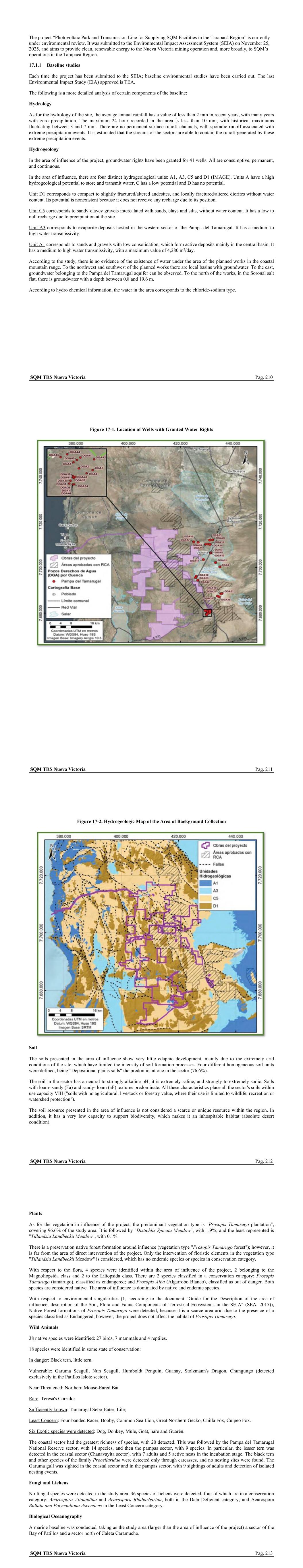 The project “Photovoltaic Park and Transmission Line for Supplying SQM Facilities in the Tarapacá Region” is currently under environmental review. It was submitted to the Environmental Impact Assessment System (SEIA) on November 25, 2025, and aims to provide clean, renewable energy to the Nueva Victoria mining operation and, more broadly, to SQM’s operations in the Tarapacá Region. 17.1.1 Baseline studies Each time the project has been submitted to the SEIA; baseline environmental studies have been carried out. The last Environmental Impact Study (EIA) approved is TEA. The following is a more detailed analysis of certain components of the baseline: Hydrology As for the hydrology of the site, the average annual rainfall has a value of less than 2 mm in recent years, with many years with zero precipitation. The maximum 24 hour recorded in the area is less than 10 mm, with historical maximums fluctuating between 3 and 7 mm. There are no permanent surface runoff channels, with sporadic runoff associated with extreme precipitation events. It is estimated that the streams of the sectors are able to contain the runoff generated by these extreme precipitation events. Hydrogeology In the area of influence of the project, groundwater rights have been granted for 41 wells. All are consumptive, permanent, and continuous. In the area of influence, there are four distinct hydrogeological units: A1, A3, C5 and D1 (IMAGE). Units A have a high hydrogeological potential to store and transmit water, C has a low potential and D has no potential. Unit D1 corresponds to compact to slightly fractured/altered andesites, and locally fractured/altered diorites without water content. Its potential is nonexistent because it does not receive any recharge due to its position. Unit C5 corresponds to sandy-clayey gravels intercalated with sands, clays and silts, without water content. It has a low to null recharge due to precipitation at the site. Unit A3 corresponds to evaporite deposits hosted in the western sector of the Pampa del Tamarugal. It has a medium to high water transmissivity. Unit A1 corresponds to sands and gravels with low consolidation, which form active deposits mainly in the central basin. It has a medium to high water transmissivity, with a maximum value of 4,280 m2/day. According to the study, there is no evidence of the existence of water under the area of the planned works in the coastal mountain range. To the northwest and southwest of the planned works there are local basins with groundwater. To the east, groundwater belonging to the Pampa del Tamarugal aquifer can be observed. To the north of the works, in the Soronal salt flat, there is groundwater with a depth between 0.8 and 19.6 m. According to hydro chemical information, the water in the area corresponds to the chloride-sodium type. SQM TRS Nueva Victoria Pag. 210 Figure 17-1. Location of Wells with Granted Water Rights SQM TRS Nueva Victoria Pag. 211 Figure 17-2. Hydrogeologic Map of the Area of Background Collection Soil The soils presented in the area of influence show very little edaphic development, mainly due to the extremely arid conditions of the site, which have limited the intensity of soil formation processes. Four different homogeneous soil units were defined, being "Depositional plains soils" the predominant one in the sector (76.6%). The soil in the sector has a neutral to strongly alkaline pH; it is extremely saline, and strongly to extremely sodic. Soils with loam- sandy (Fa) and sandy- loam (aF) textures predominate. All these characteristics place all the sector's soils within use capacity VIII ("soils with no agricultural, livestock or forestry value, where their use is limited to wildlife, recreation or watershed protection"). The soil resource presented in the area of influence is not considered a scarce or unique resource within the region. In addition, it has a very low capacity to support biodiversity, which makes it an inhospitable habitat (absolute desert condition). SQM TRS Nueva Victoria Pag. 212 Plants As for the vegetation in influence of the project, the predominant vegetation type is "Prosopis Tamarugo plantation", covering 96.6% of the study area. It is followed by "Distichlis Spicata Meadow", with 1.9%; and the least represented is "Tillandsia Landbeckii Meadow", with 0.1%. There is a preservation native forest formation around influence (vegetation type "Prosopis Tamarugo forest"); however, it is far from the area of direct intervention of the project. Only the intervention of floristic elements in the vegetation type "Tillandsia Landbeckii Meadow" is considered, which has no endemic species or species in conservation category. With respect to the flora, 4 species were identified within the area of influence of the project, 2 belonging to the Magnoliopsida class and 2 to the Liliopsida class. There are 2 species classified in a conservation category: Prosopis Tamarugo (tamarugo), classified as endangered; and Prosopis Alba (Algarrobo Blanco), classified as out of danger. Both species are considered native. The area of influence is dominated by native and endemic species. With respect to environmental singularities (1, according to the document "Guide for the Description of the area of influence, description of the Soil, Flora and Fauna Components of Terrestrial Ecosystems in the SEIA" (SEA, 2015)), Native Forest formations of Prosopis Tamarugo were detected, because it is a scarce area arid due to the presence of a species classified as Endangered; however, the project does not affect the habitat of Prosopis Tamarugo. Wild Animals 38 native species were identified: 27 birds, 7 mammals and 4 reptiles. 18 species were identified in some state of conservation: In danger: Black tern, little tern. Vulnerable: Garuma Seagull, Nun Seagull, Humboldt Penguin, Guanay, Stolzmann's Dragon, Chungungo (detected exclusively in the Patillos Islote sector). Near Threatened: Northern Mouse-Eared Bat. Rare: Teresa'