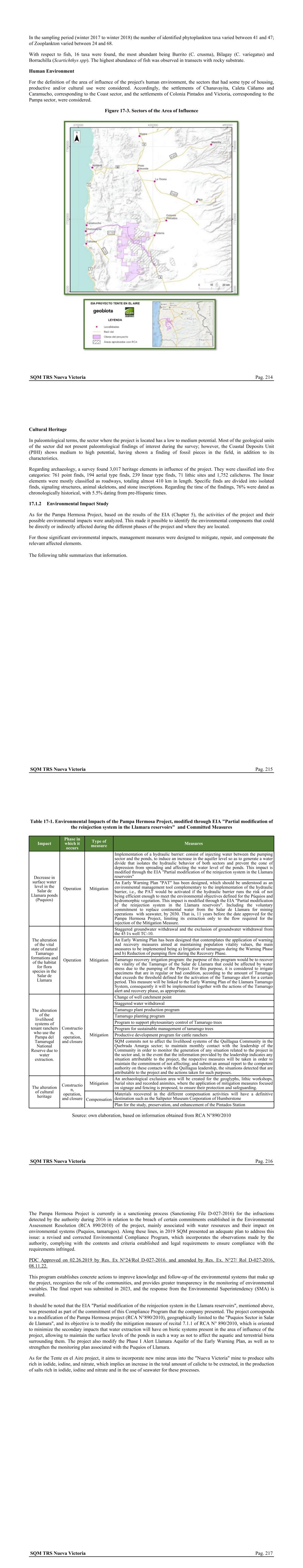 In the sampling period (winter 2017 to winter 2018) the number of identified phytoplankton taxa varied between 41 and 47; of Zooplankton varied between 24 and 68. With respect to fish, 16 taxa were found, the most abundant being Burrito (C. crusma), Bilagay (C. variegatus) and Borrachilla (Scartichthys spp). The highest abundance of fish was observed in transects with rocky substrate. Human Environment For the definition of the area of influence of the project's human environment, the sectors that had some type of housing, productive and/or cultural use were considered. Accordingly, the settlements of Chanavayita, Caleta Cáñamo and Caramucho, corresponding to the Coast sector, and the settlements of Colonia Pintados and Victoria, corresponding to the Pampa sector, were considered. Figure 17-3. Sectors of the Area of Influence SQM TRS Nueva Victoria Pag. 214 Cultural Heritage In paleontological terms, the sector where the project is located has a low to medium potential. Most of the geological units of the sector did not present paleontological findings of interest during the survey; however, the Coastal Deposits Unit (PIHI) shows medium to high potential, having shown a finding of fossil pieces in the field, in addition to its characteristics. Regarding archaeology, a survey found 3,017 heritage elements in influence of the project. They were classified into five categories: 761 point finds, 194 aerial type finds, 239 linear type finds, 71 lithic sites and 1,752 calicheros. The linear elements were mostly classified as roadways, totaling almost 410 km in length. Specific finds are divided into isolated finds, signaling structures, animal skeletons, and stone inscriptions. Regarding the time of the findings, 76% were dated as chronologically historical, with 5.5% dating from pre-Hispanic times. 17.1.2 Environmental Impact Study As for the Pampa Hermosa Project, based on the results of the EIA (Chapter 5), the activities of the project and their possible environmental impacts were analyzed. This made it possible to identify the environmental components that could be directly or indirectly affected during the different phases of the project and where they are located. For those significant environmental impacts, management measures were designed to mitigate, repair, and compensate the relevant affected elements. The following table summarizes that information. SQM TRS Nueva Victoria Pag. 215 Table 17-1. Environmental Impacts of the Pampa Hermosa Project, modified through EIA "Partial modification of the reinjection system in the Llamara reservoirs" and Committed Measures Impact Phase in which it occurs Type of measure Measures Decrease in surface water level in the Salar de Llamara ponds (Puquios) Operation Mitigation Implementation of a hydraulic barrier: consist of injecting water between the pumping sector and the ponds, to induce an increase in the aquifer level so as to generate a water divide that isolates the hydraulic behavior of both sectors and prevent the cone of depression from spreading and affecting the water level of the ponds. This impact is modified through the EIA "Partial modification of the reinjection system in the Llamara reservoirs" An Early Warning Plan "PAT" has been designed, which should be understood as an environmental management tool complementary to the implementation of the hydraulic barrier, i.e., the PAT would be activated if the hydraulic barrier runs the risk of not being efficient enough to meet the environmental objectives defined for the Púquios and hydromorphic vegetation. This impact is modified through the EIA "Partial modification of the reinjection system in the Llamara reservoirs". Including the voluntary commitment to replace continental water from the Salar de Llamara for mining operations with seawater, by 2030. That is, 11 years before the date approved for the Pampa Hermosa Project, limiting its extraction only to the flow required for the injection of the Mitigation Measure. The alteration of the vital state of natural Tamarugo formations and of the habitat for flora species in the Salar de Llamara Operation Mitigation Staggered groundwater withdrawal and the exclusion of groundwater withdrawal from the 45 l/s well TC-10. An Early Warning Plan has been designed that contemplates the application of warning and recovery measures aimed at maintaining population vitality values, the main measures to be implemented being a) Irrigation of tamarugos during the Warning Phase and b) Reduction of pumping flow during the Recovery Phase. Tamarugo recovery irrigation program: the purpose of this program would be to recover the vitality of the Tamarugo of the Salar de Llamara that could be affected by water stress due to the pumping of the Project. For this purpose, it is considered to irrigate specimens that are in regular or bad condition, according to the amount of Tamarugo that exceeds the threshold defined for the activation of the Tamarugo alert for a certain period. This measure will be linked to the Early Warning Plan of the Llamara Tamarugo System, consequently it will be implemented together with the actions of the Tamarugo alert and recovery phase, as appropriate. The alteration of the livelihood systems of tenant ranchers who use the Pampa del Tamarugal National Reserve due to water extraction. Constructio n, operation, and closure Mitigation Change of well catchment point Staggered water withdrawal Tamarugo plant production program Tamarugo planting program Program to support phytosanitary control of Tamarugo trees Program for sustainable management of tamarugo trees Productive development program for cattle ranchers SQM commits not to affect the livelihood systems of the Quillagua Community in the Quebrada Amarga sector; to maintain monthly contact with the leadership of the Community in order to monitor the generation of any situation related to the project in the sector and, in the event that the information provided by the leadership 