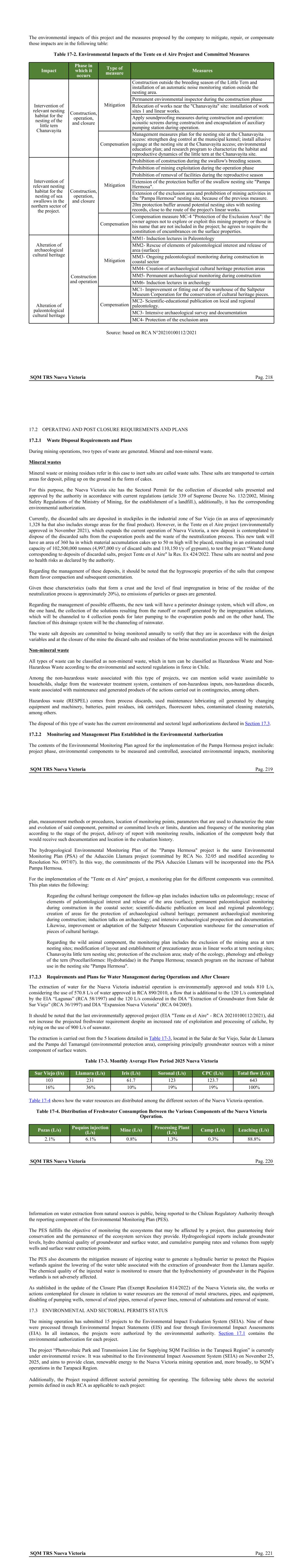 The environmental impacts of this project and the measures proposed by the company to mitigate, repair, or compensate those impacts are in the following table: Table 17-2. Environmental Impacts of the Tente en el Aire Project and Committed Measures Impact Phase in which it occurs Type of measure Measures Intervention of relevant nesting habitat for the nesting of the little tern Chanavayita Construction, operation, and closure Mitigation Construction outside the breeding season of the Little Tern and installation of an automatic noise monitoring station outside the nesting area. Permanent environmental inspector during the construction phase Relocation of works near the "Chanavayita" site: installation of work sites 1 and linear works. Apply soundproofing measures during construction and operation: acoustic screens during construction and encapsulation of auxiliary pumping station during operation. Compensation Management measures plan for the nesting site at the Chanavayita access: strengthen dog control at the municipal kennel; install allusive signage at the nesting site at the Chanavayita access; environmental education plan; and research program to characterize the habitat and reproductive dynamics of the little tern at the Chanavayita site. Intervention of relevant nesting habitat for the nesting of sea swallows in the northern sector of the project. Construction, operation, and closure Mitigation Prohibition of construction during the swallow's breeding season. Prohibition of mining exploitation during the operation phase Prohibition of removal of facilities during the reproductive season Extension of the protection buffer of the swallow nesting site "Pampa Hermosa". Extension of the exclusion area and prohibition of mining activities in the "Pampa Hermosa" nesting site, because of the previous measure. 20m protection buffer around potential nesting sites with nesting records, close to the route of the project's linear works. Compensation Compensation measure MC-4 "Protection of the Exclusion Area": the owner agrees not to explore or exploit this mining property or those in his name that are not included in the project; he agrees to require the constitution of encumbrances on the surface properties. Alteration of archaeological cultural heritage Construction and operation Mitigation MM1- Induction lectures in Paleontology MM2- Rescue of elements of paleontological interest and release of area (surface) MM3- Ongoing paleontological monitoring during construction in coastal sector MM4- Creation of archaeological cultural heritage protection areas MM5- Permanent archaeological monitoring during construction MM6- Induction lectures in archeology Compensation MC1- Improvement or fitting out of the warehouse of the Saltpeter Museum Corporation for the conservation of cultural heritage pieces. Alteration of paleontological cultural heritage MC2- Scientific-educational publication on local and regional paleontology. MC3- Intensive archaeological survey and documentation MC4- Protection of the exclusion area Source: based on RCA N°20210100112/2021 SQM TRS Nueva Victoria Pag. 218 17.2 OPERATING AND POST CLOSURE REQUIREMENTS AND PLANS 17.2.1 Waste Disposal Requirements and Plans During mining operations, two types of waste are generated. Mineral and non-mineral waste. Mineral wastes Mineral waste or mining residues refer in this case to inert salts are called waste salts. These salts are transported to certain areas for deposit, piling up on the ground in the form of cakes. For this purpose, the Nueva Victoria site has the Sectoral Permit for the collection of discarded salts presented and approved by the authority in accordance with current regulations (article 339 of Supreme Decree No. 132/2002, Mining Safety Regulations of the Ministry of Mining, for the establishment of a landfill.), additionally, it has the corresponding environmental authorization. Currently, the discarded salts are deposited in stockpiles in the industrial zone of Sur Viejo (in an area of approximately 1,328 ha that also includes storage areas for the final product). However, in the Tente en el Aire project (environmentally approved in November 2021), which expands the current operation of Nueva Victoria, a new deposit is contemplated to dispose of the discarded salts from the evaporation pools and the waste of the neutralization process. This new tank will have an area of 360 ha in which material accumulation cakes up to 50 m high will be placed, resulting in an estimated total capacity of 102,500,000 tonnes (4,997,000 t/y of discard salts and 110,150 t/y of gypsum), to test the project “Waste dump corresponding to deposits of discarded salts, project Tente en el Aire" la Res. Ex 424/2022. These salts are neutral and pose no health risks as declared by the authority. Regarding the management of these deposits, it should be noted that the hygroscopic properties of the salts that compose them favor compaction and subsequent cementation. Given these characteristics (salts that form a crust and the level of final impregnation in brine of the residue of the neutralization process is approximately 20%), no emissions of particles or gases are generated. Regarding the management of possible effluents, the new tank will have a perimeter drainage system, which will allow, on the one hand, the collection of the solutions resulting from the runoff or runoff generated by the impregnation solutions, which will be channeled to 4 collection ponds for later pumping to the evaporation ponds and on the other hand, The function of this drainage system will be the channeling of rainwater. The waste salt deposits are committed to being monitored annually to verify that they are in accordance with the design variables and at the closure of the mine the discard salts and residues of the brine neutralization process will be maintained. Non-mineral waste All types of waste can be classified as non-mineral waste, which in turn can be classi