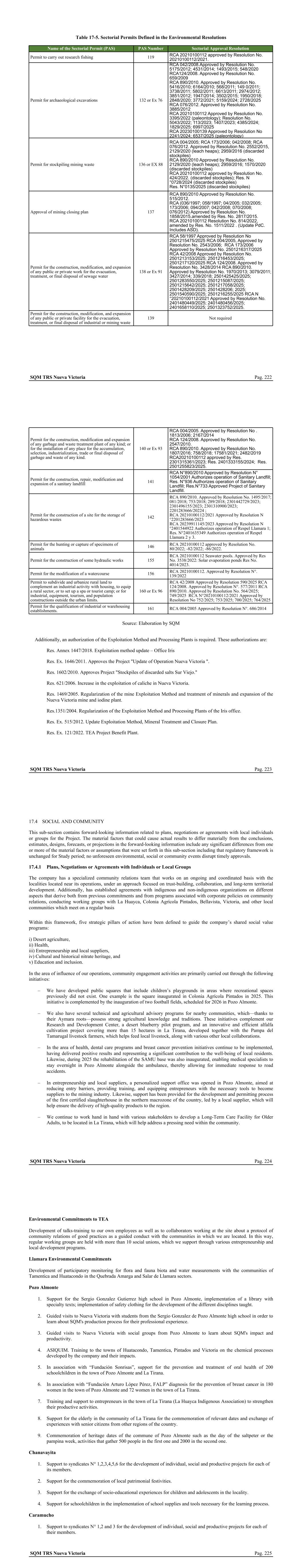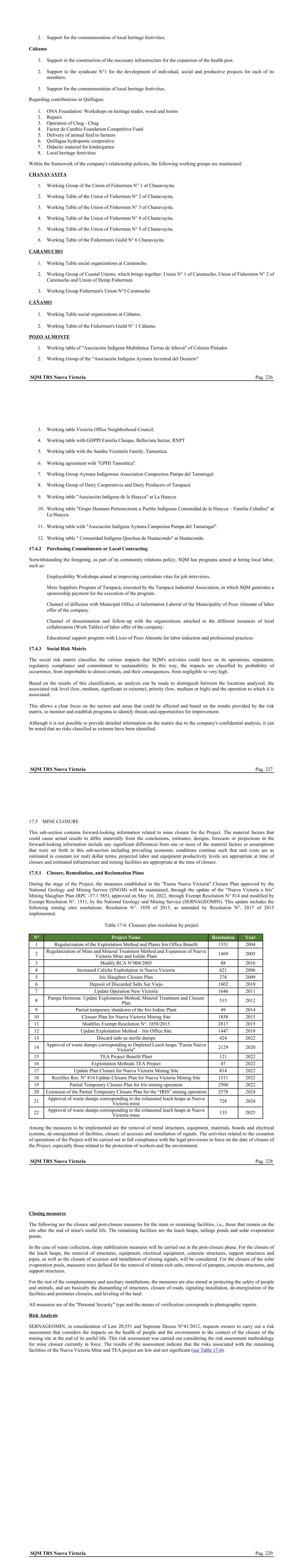 2. Support for the commemoration of local heritage festivities. Cáñamo 1. Support in the construction of the necessary infrastructure for the expansion of the health post. 2. Support to the syndicate N°1 for the development of individual, social and productive projects for each of its members. 3. Support for the commemoration of local heritage festivities. Regarding contributions in Quillagua: 1. ONA Foundation: Workshops on heritage trades, wood and looms 2. Repairs 3. Operation of Chug - Chug 4. Factor de Cambio Foundation Competitive Fund 5. Delivery of animal feed to farmers 6. Quillagua hydroponic cooperative 7. Didactic material for kindergarten 8. Local heritage festivities Within the framework of the company's relationship policies, the following working groups are maintained: CHANAVAYITA 1. Working Group of the Union of Fishermen N° 1 of Chanavayita. 2. Working Table of the Union of Fishermen N° 2 of Chanavayita. 3. Working Table of the Union of Fishermen N° 3 of Chanavayita. 4. Working Table of the Union of Fishermen N° 4 of Chanavayita. 5. Working Table of the Union of Fishermen N° 5 of Chanavayita. 6. Working Table of the Fishermen's Guild N° 6 Chanavayita. CARAMUCHO 1. Working Table social organizations at Caramucho. 2. Working Group of Coastal Unions, which brings together: Union N° 1 of Caramucho, Union of Fishermen N° 2 of Caramucho and Union of Hemp Fishermen. 3. Working Group Fishermen's Union N°3 Caramucho CÁÑAMO 1. Working Table social organizations at Cáñamo. 2. Working Table of the Fishermen's Guild N° 1 Cáñamo. POZO ALMONTE 1. Working table of "Asociación Indígena Multiétnica Tierras de Jehová" of Colonia Pintados 2. Working Group of the "Asociación Indígena Aymara Juventud del Desierto" SQM TRS Nueva Victoria Pag. 226 3. Working table Victoria Office Neighborhood Council. 4. Working table with GHPPI Familia Choque, Bellavista Sector, RNPT 5. Working table with the Sandra Vicentelo Family, Tamentíca. 6. Working agreement with "GPHI Tamentíca". 7. Working Group Aymara Indigenous Association Campesinos Pampa del Tamarugal. 8. Working Group of Dairy Cooperatives and Dairy Producers of Tarapacá. 9. Working table "Asociación Indígena de la Huayca" at La Huayca. 10. Working table "Grupo Humano Perteneciente a Pueblo Indígenas Comunidad de la Huayca – Familia Ceballos" at La Huayca. 11. Working table with "Asociación Indígena Aymara Campesina Pampa del Tamarugal". 12. Working table " Comunidad Indígena Quechua de Huatacondo" at Huatacondo. 17.4.2 Purchasing Commitments or Local Contracting Notwithstanding the foregoing, as part of its community relations policy, SQM has programs aimed at hiring local labor, such as: Employability Workshops aimed at improving curriculum vitae for job interviews. More Suppliers Program of Tarapacá, executed by the Tarapacá Industrial Association, in which SQM generates a sponsorship payment for the execution of the program. Channel of diffusion with Municipal Office of Information Laboral of the Municipality of Pozo Almonte of labor offer of the company. Channel of dissemination and follow-up with the organizations attached to the different instances of local collaboration (Work Tables) of labor offer of the company. Educational support program with Liceo of Pozo Almonte for labor induction and professional practices 17.4.3 Social Risk Matrix The social risk matrix classifies the various impacts that SQM's activities could have on its operations, reputation, regulatory compliance and commitment to sustainability. In this way, the impacts are classified by probability of occurrence, from improbable to almost certain, and their consequences, from negligible to very high. Based on the results of this classification, an analysis can be made to distinguish between the locations analyzed, the associated risk level (low, medium, significant or extreme), priority (low, medium or high) and the operation to which it is associated. This allows a clear focus on the sectors and areas that could be affected and based on the results provided by the risk matrix, to monitor and establish programs to identify threats and opportunities for improvement. Although it is not possible to provide detailed information on the matrix due to the company's confidential analysis, it can be noted that no risks classified as extreme have been identified. SQM TRS Nueva Victoria Pag. 227 17.5 MINE CLOSURE This sub-section contains forward-looking information related to mine closure for the Project. The material factors that could cause actual results to differ materially from the conclusions, estimates, designs, forecasts or projections in the forward-looking information include any significant differences from one or more of the material factors or assumptions that were set forth in this sub-section including prevailing economic conditions continue such that unit costs are as estimated in constant (or real) dollar terms, projected labor and equipment productivity levels are appropriate at time of closure and estimated infrastructure and mining facilities are appropriate at the time of closure. 17.5.1 Closure, Remediation, and Reclamation Plans During the stage of the Project, the measures established in the "Faena Nueva Victoria" Closure Plan approved by the National Geology and Mining Service (SNGM) will be maintained, through the update of the “Nueva Victoria e Iris” Mining Slaughter Plan (RPC -57.1 585), approved on May 16, 2022, through Exempt Resolution N° 814 and modified by Exempt Resolution N°. 1511, by the National Geology and Mining Service (SERNAGEOMIN). This update includes the following mining sites resolutions. Resolution N°. 1858 of 2015, as amended by Resolution N°. 2817 of 2015 implemented. Table 17-6: Clousure plan resolution by project N° Project Name Resolution Year 1 Regularization of the Exploitation Method and Plants Iris Office Benefit 1351 2004 2 Regularization of Mine and Mineral Treatment Method and E