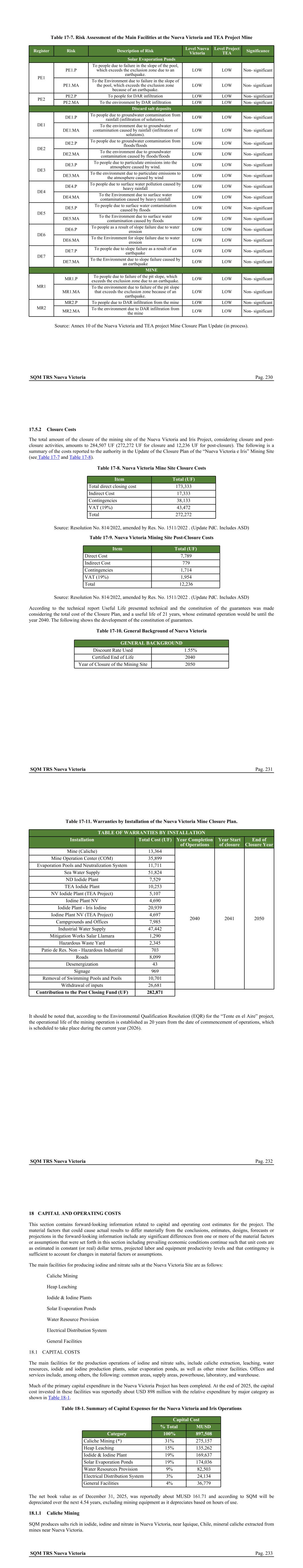Table 17-7. Risk Assessment of the Main Facilities at the Nueva Victoria and TEA Project Mine Register Risk Description of Risk Level Nueva Victoria Level Project TEA Significance Solar Evaporation Ponds PE1 PE1.P To people due to failure in the slope of the pool, which exceeds the exclusion zone due to an earthquake. LOW LOW Non- significant PE1.MA To the Environment due to failure in the slope of the pool, which exceeds the exclusion zone because of an earthquake. LOW LOW Non- significant PE2 PE2.P To people for DAR infiltration LOW LOW Non- significant PE2.MA To the environment by DAR infiltration LOW LOW Non- significant Discard salt deposits DE1 DE1.P To people due to groundwater contamination from rainfall (infiltration of solutions). LOW LOW Non- significant DE1.MA To the environment due to groundwater contamination caused by rainfall (infiltration of solutions). LOW LOW Non- significant DE2 DE2.P To people due to groundwater contamination from floods/floods LOW LOW Non- significant DE2.MA To the environment due to groundwater contamination caused by floods/floods LOW LOW Non- significant DE3 DE3.P To people due to particulate emissions into the atmosphere caused by wind. LOW LOW Non- significant DE3.MA To the environment due to particulate emissions to the atmosphere caused by wind LOW LOW Non- significant DE4 DE4.P To people due to surface water pollution caused by heavy rainfall LOW LOW Non- significant DE4.MA To the Environment due to surface water contamination caused by heavy rainfall LOW LOW Non- significant DE5 DE5.P To people due to surface water contamination caused by floods LOW LOW Non- significant DE5.MA To the Environment due to surface water contamination caused by floods LOW LOW Non- significant DE6 DE6.P To people as a result of slope failure due to water erosion LOW LOW Non- significant DE6.MA To the Environment for slope failure due to water erosion LOW LOW Non- significant DE7 DE7.P To people due to slope failure as a result of an earthquake LOW LOW Non- significant DE7.MA To the Environment due to slope failure caused by an earthquake LOW LOW Non- significant MINE MR1 MR1.P To people due to failure of the pit slope, which exceeds the exclusion zone due to an earthquake. LOW LOW Non- significant MR1.MA To the environment due to failure of the pit slope that exceeds the exclusion zone because of an earthquake. LOW LOW Non- significant MR2 MR2.P To people due to DAR infiltration from the mine LOW LOW Non- significant MR2.MA To the environment due to DAR infiltration from the mine LOW LOW Non- significant Source: Annex 10 of the Nueva Victoria and TEA project Mine Closure Plan Update (in process). SQM TRS Nueva Victoria Pag. 230 17.5.2 Closure Costs The total amount of the closure of the mining site of the Nueva Victoria and Iris Project, considering closure and post- closure activities, amounts to 284,507 UF (272,272 UF for closure and 12,236 UF for post-closure). The following is a summary of the costs reported to the authority in the Update of the Closure Plan of the “Nueva Victoria e Iris” Mining Site (see Table 17-7 and Table 17-8). Table 17-8. Nueva Victoria Mine Site Closure Costs Item Total (UF) Total direct closing cost 173,333 Indirect Cost 17,333 Contingencies 38,133 VAT (19%) 43,472 Total 272,272 Source: Resolution No. 814/2022, amended by Res. No. 1511/2022 . (Update PdC. Includes ASD) Table 17-9. Nueva Victoria Mining Site Post-Closure Costs Item Total (UF) Direct Cost 7,789 Indirect Cost 779 Contingencies 1,714 VAT (19%) 1,954 Total 12,236 Source: Resolution No. 814/2022, amended by Res. No. 1511/2022 . (Update PdC. Includes ASD) According to the technical report Useful Life presented technical and the constitution of the guarantees was made considering the total cost of the Closure Plan, and a useful life of 21 years, whose estimated operation would be until the year 2040. The following shows the development of the constitution of guarantees. Table 17-10. General Background of Nueva Victoria GENERAL BACKGROUND Discount Rate Used 1.55% Certified End of Life 2040 Year of Closure of the Mining Site 2050 SQM TRS Nueva Victoria Pag. 231 Table 17-11. Warranties by Installation of the Nueva Victoria Mine Closure Plan. TABLE OF WARRANTIES BY INSTALLATION Installation Total Cost (UF) Year Completion of Operations Year Start of closure End of Closure Year Mine (Caliche) 13,364 2040 2041 2050 Mine Operation Center (COM) 35,899 Evaporation Pools and Neutralization System 11,711 Sea Water Supply 51,824 ND Iodide Plant 7,529 TEA Iodide Plant 10,253 NV Iodide Plant (TEA Project) 5,107 Iodine Plant NV 4,690 Iodide Plant - Iris Iodine 20,939 Iodine Plant NV (TEA Project) 4,697 Campgrounds and Offices 7,985 Industrial Water Supply 47,442 Mitigation Works Salar Llamara 1,290 Hazardous Waste Yard 2,345 Patio de Res. Non - Hazardous Industrial 703 Roads 8,099 Desenergization 43 Signage 969 Removal of Swimming Pools and Pools 10,701 Withdrawal of inputs 26,681 Contribution to the Post Closing Fund (UF) 282,871 It should be noted that, according to the Environmental Qualification Resolution (EQR) for the “Tente en el Aire” project, the operational life of the mining operation is established as 20 years from the date of commencement of operations, which is scheduled to take place during the current year (2026). SQM TRS Nueva Victoria Pag. 232 18 CAPITAL AND OPERATING COSTS This section contains forward-looking information related to capital and operating cost estimates for the project. The material factors that could cause actual results to differ materially from the conclusions, estimates, designs, forecasts or projections in the forward-looking information include any significant differences from one or more of the material factors or assumptions that were set forth in this section including prevailing economic conditions continue such that unit costs are as estimated in constant (or real) dollar terms, projected labor and equipment productivity levels and that 