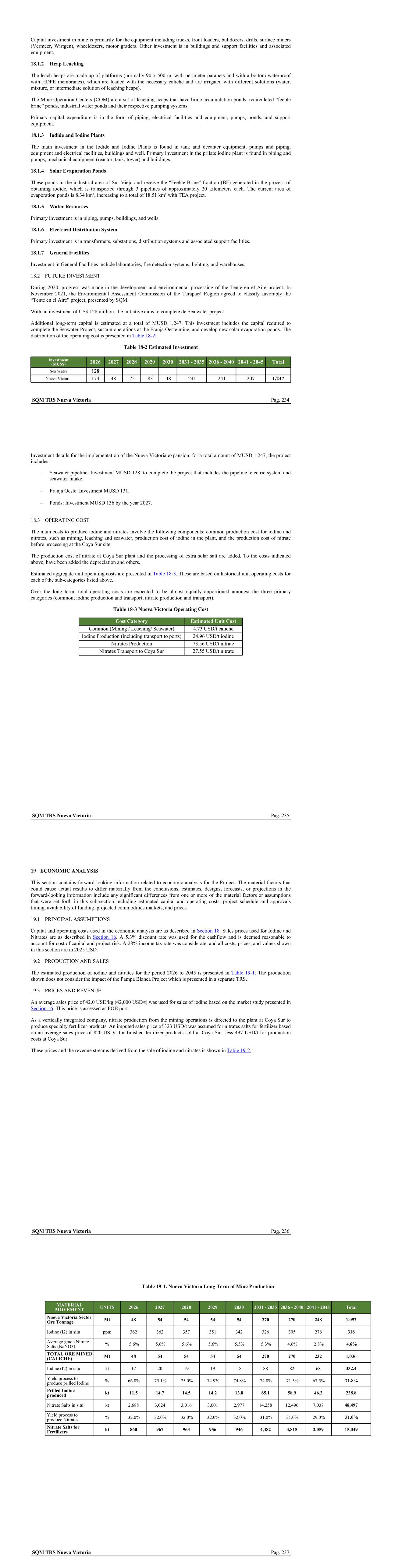 Capital investment in mine is primarily for the equipment including trucks, front loaders, bulldozers, drills, surface miners (Vermeer, Wirtgen), wheeldozers, motor graders. Other investment is in buildings and support facilities and associated equipment. 18.1.2 Heap Leaching The leach heaps are made up of platforms (normally 90 x 500 m, with perimeter parapets and with a bottom waterproof with HDPE membranes), which are loaded with the necessary caliche and are irrigated with different solutions (water, mixture, or intermediate solution of leaching heaps). The Mine Operation Centers (COM) are a set of leaching heaps that have brine accumulation ponds, recirculated “feeble brine” ponds, industrial water ponds and their respective pumping systems. Primary capital expenditure is in the form of piping, electrical facilities and equipment, pumps, ponds, and support equipment. 18.1.3 Iodide and Iodine Plants The main investment in the Iodide and Iodine Plants is found in tank and decanter equipment, pumps and piping, equipment and electrical facilities, buildings and well. Primary investment in the prilate iodine plant is found in piping and pumps, mechanical equipment (reactor, tank, tower) and buildings. 18.1.4 Solar Evaporation Ponds These ponds in the industrial area of Sur Viejo and receive the “Feeble Brine” fraction (BF) generated in the process of obtaining iodide, which is transported through 3 pipelines of approximately 20 kilometers each. The current area of evaporation ponds is 8.34 km², increasing to a total of 18.51 km² with TEA project. 18.1.5 Water Resources Primary investment is in piping, pumps, buildings, and wells. 18.1.6 Electrical Distribution System Primary investment is in transformers, substations, distribution systems and associated support facilities. 18.1.7 General Facilities Investment in General Facilities include laboratories, fire detection systems, lighting, and warehouses. 18.2 FUTURE INVESTMENT During 2020, progress was made in the development and environmental processing of the Tente en el Aire project. In November 2021, the Environmental Assessment Commission of the Tarapacá Region agreed to classify favorably the “Tente en el Aire” project, presented by SQM. With an investment of US$ 128 million, the initiative aims to complete de Sea water project. Additional long-term capital is estimated at a total of MUSD 1,247. This investment includes the capital required to complete the Seawater Project, sustain operations at the Franja Oeste mine, and develop new solar evaporation ponds. The distribution of the operating cost is presented in Table 18-2: Table 18-2 Estimated Investment Investment (MUS$) 2026 2027 2028 2029 2030 2031 - 2035 2036 - 2040 2041 - 2045 Total Sea Water 128 Nueva Victoria 174 48 75 83 48 241 241 207 1,247 SQM TRS Nueva Victoria Pag. 234 Investment details for the implementation of the Nueva Victoria expansion; for a total amount of MUSD 1,247, the project includes: – Seawater pipeline: Investment MUSD 128, to complete the project that includes the pipeline, electric system and seawater intake. – Franja Oeste: Investment MUSD 131. – Ponds: Investment MUSD 136 by the year 2027. 18.3 OPERATING COST The main costs to produce iodine and nitrates involve the following components: common production cost for iodine and nitrates, such as mining, leaching and seawater, production cost of iodine in the plant, and the production cost of nitrate before processing at the Coya Sur site. The production cost of nitrate at Coya Sur plant and the processing of extra solar salt are added. To the costs indicated above, have been added the depreciation and others. Estimated aggregate unit operating costs are presented in Table 18-3. These are based on historical unit operating costs for each of the sub-categories listed above. Over the long term, total operating costs are expected to be almost equally apportioned amongst the three primary categories (common; iodine production and transport; nitrate production and transport). Table 18-3 Nueva Victoria Operating Cost Cost Category Estimated Unit Cost Common (Mining / Leaching/ Seawater) 4.73 USD/t caliche Iodine Production (including transport to ports) 24.96 USD/t iodine Nitrates Production 73.56 USD/t nitrate Nitrates Transport to Coya Sur 27.55 USD/t nitrate SQM TRS Nueva Victoria Pag. 235 19 ECONOMIC ANALYSIS This section contains forward-looking information related to economic analysis for the Project. The material factors that could cause actual results to differ materially from the conclusions, estimates, designs, forecasts, or projections in the forward-looking information include any significant differences from one or more of the material factors or assumptions that were set forth in this sub-section including estimated capital and operating costs, project schedule and approvals timing, availability of funding, projected commodities markets, and prices. 19.1 PRINCIPAL ASSUMPTIONS Capital and operating costs used in the economic analysis are as described in Section 18. Sales prices used for Iodine and Nitrates are as described in Section 16. A 5.3% discount rate was used for the cashflow and is deemed reasonable to account for cost of capital and project risk. A 28% income tax rate was considerate, and all costs, prices, and values shown in this section are in 2025 USD. 19.2 PRODUCTION AND SALES The estimated production of iodine and nitrates for the period 2026 to 2045 is presented in Table 19-1. The production shown does not consider the impact of the Pampa Blanca Project which is presented in a separate TRS. 19.3 PRICES AND REVENUE An average sales price of 42.0 USD/kg (42,000 USD/t) was used for sales of iodine based on the market study presented in Section 16. This price is assessed as FOB port. As a vertically integrated company, nitrate production from the mining operations is directed to the plant at Coya Sur to produce specialty fertilizer products. An imputed sales price of