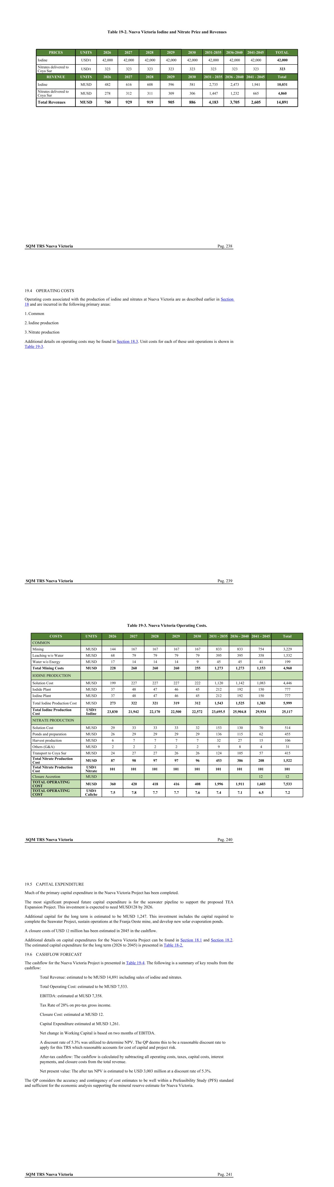 Table 19-2. Nueva Victoria Iodine and Nitrate Price and Revenues PRICES UNITS 2026 2027 2028 2029 2030 2031-2035 2036-2040 2041-2045 TOTAL Iodine USD/t 42,000 42,000 42,000 42,000 42,000 42,000 42,000 42,000 42,000 Nitrates delivered to Coya Sur USD/t 323 323 323 323 323 323 323 323 323 REVENUE UNITS 2026 2027 2028 2029 2030 2031 - 2035 2036 - 2040 2041 - 2045 Total Iodine MUSD 482 616 608 596 581 2,735 2,473 1,941 10,031 Nitrates delivered to Coya Sur MUSD 278 312 311 309 306 1,447 1,232 665 4,860 Total Revenues MUSD 760 929 919 905 886 4,183 3,705 2,605 14,891 SQM TRS Nueva Victoria Pag. 238 19.4 OPERATING COSTS Operating costs associated with the production of iodine and nitrates at Nueva Victoria are as described earlier in Section 18 and are incurred in the following primary areas: 1. Common 2. Iodine production 3. Nitrate production Additional details on operating costs may be found in Section 18.3. Unit costs for each of these unit operations is shown in Table 19-3. SQM TRS Nueva Victoria Pag. 239 Table 19-3. Nueva Victoria Operating Costs. COSTS UNITS 2026 2027 2028 2029 2030 2031 - 2035 2036 - 2040 2041 - 2045 Total COMMON Mining MUSD 144 167 167 167 167 833 833 754 3,229 Leaching w/o Water MUSD 68 79 79 79 79 395 395 358 1,532 Water w/o Energy MUSD 17 14 14 14 9 45 45 41 199 Total Mining Costs MUSD 228 260 260 260 255 1,273 1,273 1,153 4,960 IODINE PRODUCTION Solution Cost MUSD 199 227 227 227 222 1,120 1,142 1,083 4,446 Iodide Plant MUSD 37 48 47 46 45 212 192 150 777 Iodine Plant MUSD 37 48 47 46 45 212 192 150 777 Total Iodine Production Cost MUSD 273 322 321 319 312 1,543 1,525 1,383 5,999 Total Iodine Production Cost USD/t Iodine 23,830 21,942 22,170 22,500 22,572 23,695.5 25,904.8 29,934 25,117 NITRATE PRODUCTION Solution Cost MUSD 29 33 33 33 32 153 130 70 514 Ponds and preparation MUSD 26 29 29 29 29 136 115 62 455 Harvest production MUSD 6 7 7 7 7 32 27 15 106 Others (G&A) MUSD 2 2 2 2 2 9 8 4 31 Transport to Coya Sur MUSD 24 27 27 26 26 124 105 57 415 Total Nitrate Production Cost MUSD 87 98 97 97 96 453 386 208 1,522 Total Nitrate Production Cost USD/t Nitrate 101 101 101 101 101 101 101 101 101 Closure Accretion MUSD 12 12 TOTAL OPERATING COST MUSD 360 420 418 416 408 1,996 1,911 1,603 7,533 TOTAL OPERATING COST USD/t Caliche 7.5 7.8 7.7 7.7 7.6 7.4 7.1 6.5 7.2 SQM TRS Nueva Victoria Pag. 240 19.5 CAPITAL EXPENDITURE Much of the primary capital expenditure in the Nueva Victoria Project has been completed. The most significant proposed future capital expenditure is for the seawater pipeline to support the proposed TEA Expansion Project. This investment is expected to need MUSD128 by 2026. Additional capital for the long term is estimated to be MUSD 1,247. This investment includes the capital required to complete the Seawater Project, sustain operations at the Franja Oeste mine, and develop new solar evaporation ponds. A closure costs of USD 12 million has been estimated in 2045 in the cashflow. Additional details on capital expenditures for the Nueva Victoria Project can be found in Section 18.1 and Section 18.2. The estimated capital expenditure for the long term (2026 to 2045) is presented in Table 18-2. 19.6 CASHFLOW FORECAST The cashflow for the Nueva Victoria Project is presented in Table 19-4. The following is a summary of key results from the cashflow: Total Revenue: estimated to be MUSD 14,891 including sales of iodine and nitrates. Total Operating Cost: estimated to be MUSD 7,533. EBITDA: estimated at MUSD 7,358. Tax Rate of 28% on pre-tax gross income. Closure Cost: estimated at MUSD 12. Capital Expenditure estimated at MUSD 1,261. Net change in Working Capital is based on two months of EBITDA. A discount rate of 5.3% was utilized to determine NPV. The QP deems this to be a reasonable discount rate to apply for this TRS which reasonable accounts for cost of capital and project risk. After-tax cashflow: The cashflow is calculated by subtracting all operating costs, taxes, capital costs, interest payments, and closure costs from the total revenue. Net present value: The after tax NPV is estimated to be USD 3,003 million at a discount rate of 5.3%. The QP considers the accuracy and contingency of cost estimates to be well within a Prefeasibility Study (PFS) standard and sufficient for the economic analysis supporting the mineral reserve estimate for Nueva Victoria. SQM TRS Nueva Victoria Pag. 241