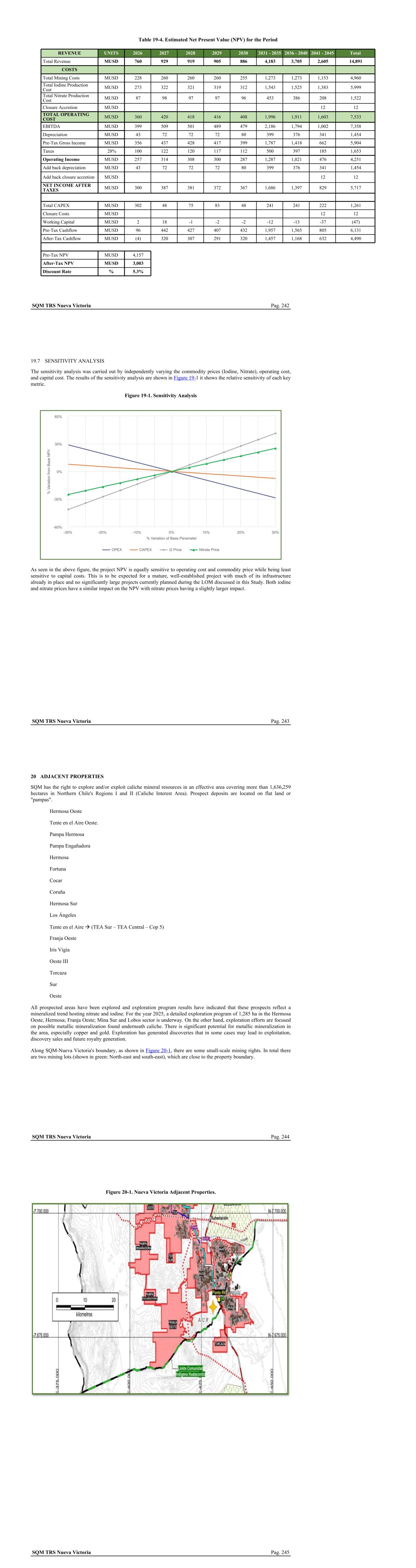 Table 19-4. Estimated Net Present Value (NPV) for the Period REVENUE UNITS 2026 2027 2028 2029 2030 2031 - 2035 2036 - 2040 2041 - 2045 Total Total Revenue MUSD 760 929 919 905 886 4,183 3,705 2,605 14,891 COSTS Total Mining Costs MUSD 228 260 260 260 255 1,273 1,273 1,153 4,960 Total Iodine Production Cost MUSD 273 322 321 319 312 1,543 1,525 1,383 5,999 Total Nitrate Production Cost MUSD 87 98 97 97 96 453 386 208 1,522 Closure Accretion MUSD 12 12 TOTAL OPERATING COST MUSD 360 420 418 416 408 1,996 1,911 1,603 7,533 EBITDA MUSD 399 509 501 489 479 2,186 1,794 1,002 7,358 Depreciation MUSD 43 72 72 72 80 399 376 341 1,454 Pre-Tax Gross Income MUSD 356 437 428 417 399 1,787 1,418 662 5,904 Taxes 28% 100 122 120 117 112 500 397 185 1,653 Operating Income MUSD 257 314 308 300 287 1,287 1,021 476 4,251 Add back depreciation MUSD 43 72 72 72 80 399 376 341 1,454 Add back closure accretion MUSD 12 12 NET INCOME AFTER TAXES MUSD 300 387 381 372 367 1,686 1,397 829 5,717 Total CAPEX MUSD 302 48 75 83 48 241 241 222 1,261 Closure Costs MUSD 12 12 Working Capital MUSD 2 18 -1 -2 -2 -12 -13 -37 (47) Pre-Tax Cashflow MUSD 96 442 427 407 432 1,957 1,565 805 6,131 After-Tax Cashflow MUSD (4) 320 307 291 320 1,457 1,168 632 4,490 Pre-Tax NPV MUSD 4,157 After-Tax NPV MUSD 3,003 Discount Rate % 5.3% SQM TRS Nueva Victoria Pag. 242 19.7 SENSITIVITY ANALYSIS The sensitivity analysis was carried out by independently varying the commodity prices (Iodine, Nitrate), operating cost, and capital cost. The results of the sensitivity analysis are shown in Figure 19-1 it shows the relative sensitivity of each key metric. Figure 19-1. Sensitivity Analysis % Variation of Base Parameter % V ar ia tio n fro m B as e N P V OPEX CAPEX I2 Price Nitrate Price -30% -20% -10% 0% 10% 20% 30% -60% -30% 0% 30% 60% As seen in the above figure, the project NPV is equally sensitive to operating cost and commodity price while being least sensitive to capital costs. This is to be expected for a mature, well-established project with much of its infrastructure already in place and no significantly large projects currently planned during the LOM discussed in this Study. Both iodine and nitrate prices have a similar impact on the NPV with nitrate prices having a slightly larger impact. SQM TRS Nueva Victoria Pag. 243 20 ADJACENT PROPERTIES SQM has the right to explore and/or exploit caliche mineral resources in an effective area covering more than 1,636,259 hectares in Northern Chile's Regions I and II (Caliche Interest Area). Prospect deposits are located on flat land or "pampas". Hermosa Oeste Tente en el Aire Oeste. Pampa Hermosa Pampa Engañadora Hermosa Fortuna Cocar Coruña Hermosa Sur Los Ángeles Tente en el Aire à (TEA Sur – TEA Central – Cop 5) Franja Oeste Iris Vigía Oeste III Torcaza Sur Oeste All prospected areas have been explored and exploration program results have indicated that these prospects reflect a mineralized trend hosting nitrate and iodine. For the year 2025, a detailed exploration program of 1,285 ha in the Hermosa Oeste, Hermosa; Franja Oeste; Mina Sur and Lobos sector is underway. On the other hand, exploration efforts are focused on possible metallic mineralization found underneath caliche. There is significant potential for metallic mineralization in the area, especially copper and gold. Exploration has generated discoveries that in some cases may lead to exploitation, discovery sales and future royalty generation. Along SQM-Nueva Victoria's boundary, as shown in Figure 20-1, there are some small-scale mining rights. In total there are two mining lots (shown in green: North-east and south-east), which are close to the property boundary. SQM TRS Nueva Victoria Pag. 244 Figure 20-1. Nueva Victoria Adjacent Properties. SQM TRS Nueva Victoria Pag. 245