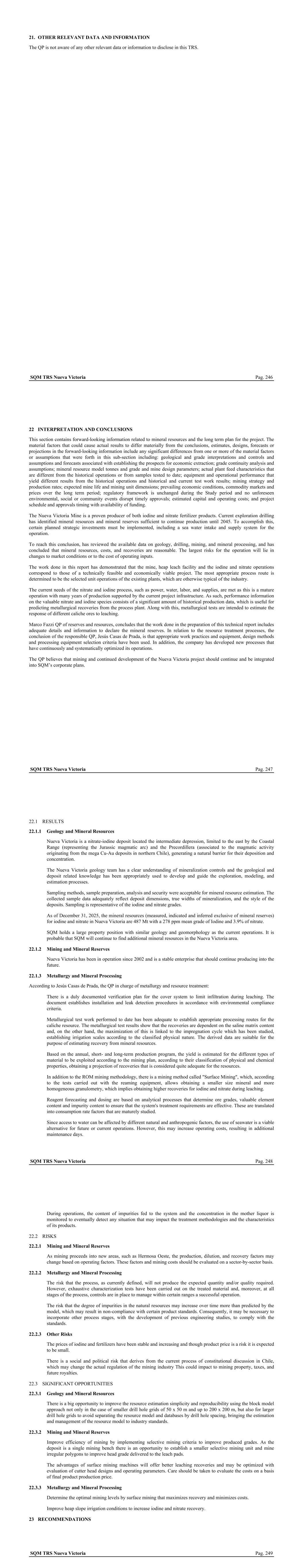 21. OTHER RELEVANT DATA AND INFORMATION The QP is not aware of any other relevant data or information to disclose in this TRS. SQM TRS Nueva Victoria Pag. 246 22 INTERPRETATION AND CONCLUSIONS This section contains forward-looking information related to mineral resources and the long term plan for the project. The material factors that could cause actual results to differ materially from the conclusions, estimates, designs, forecasts or projections in the forward-looking information include any significant differences from one or more of the material factors or assumptions that were forth in this sub-section including: geological and grade interpretations and controls and assumptions and forecasts associated with establishing the prospects for economic extraction; grade continuity analysis and assumptions; mineral resource model tonnes and grade and mine design parameters; actual plant feed characteristics that are different from the historical operations or from samples tested to date; equipment and operational performance that yield different results from the historical operations and historical and current test work results; mining strategy and production rates; expected mine life and mining unit dimensions; prevailing economic conditions, commodity markets and prices over the long term period; regulatory framework is unchanged during the Study period and no unforeseen environmental, social or community events disrupt timely approvals; estimated capital and operating costs; and project schedule and approvals timing with availability of funding. The Nueva Victoria Mine is a proven producer of both iodine and nitrate fertilizer products. Current exploration drilling has identified mineral resources and mineral reserves sufficient to continue production until 2045. To accomplish this, certain planned strategic investments must be implemented, including a sea water intake and supply system for the operation. To reach this conclusion, has reviewed the available data on geology, drilling, mining, and mineral processing, and has concluded that mineral resources, costs, and recoveries are reasonable. The largest risks for the operation will lie in changes to market conditions or to the cost of operating inputs. The work done in this report has demonstrated that the mine, heap leach facility and the iodine and nitrate operations correspond to those of a technically feasible and economically viable project. The most appropriate process route is determined to be the selected unit operations of the existing plants, which are otherwise typical of the industry. The current needs of the nitrate and iodine process, such as power, water, labor, and supplies, are met as this is a mature operation with many years of production supported by the current project infrastructure. As such, performance information on the valuable nitrate and iodine species consists of a significant amount of historical production data, which is useful for predicting metallurgical recoveries from the process plant. Along with this, metallurgical tests are intended to estimate the response of different caliche ores to leaching. Marco Fazzi QP of reserves and resources, concludes that the work done in the preparation of this technical report includes adequate details and information to declare the mineral reserves. In relation to the resource treatment processes, the conclusion of the responsible QP, Jesús Casas de Prada, is that appropriate work practices and equipment, design methods and processing equipment selection criteria have been used. In addition, the company has developed new processes that have continuously and systematically optimized its operations. The QP believes that mining and continued development of the Nueva Victoria project should continue and be integrated into SQM’s corporate plans. SQM TRS Nueva Victoria Pag. 247 22.1 RESULTS 22.1.1 Geology and Mineral Resources Nueva Victoria is a nitrate-iodine deposit located the intermediate depression, limited to the east by the Coastal Range (representing the Jurassic magmatic arc) and the Precordillera (associated to the magmatic activity originating from the mega Cu-Au deposits in northern Chile), generating a natural barrier for their deposition and concentration. The Nueva Victoria geology team has a clear understanding of mineralization controls and the geological and deposit related knowledge has been appropriately used to develop and guide the exploration, modeling, and estimation processes. Sampling methods, sample preparation, analysis and security were acceptable for mineral resource estimation. The collected sample data adequately reflect deposit dimensions, true widths of mineralization, and the style of the deposits. Sampling is representative of the iodine and nitrate grades. As of December 31, 2025, the mineral resources (measured, indicated and inferred exclusive of mineral reserves) for iodine and nitrate in Nueva Victoria are 487 Mt with a 278 ppm mean grade of Iodine and 3.9% of nitrate. SQM holds a large property position with similar geology and geomorphology as the current operations. It is probable that SQM will continue to find additional mineral resources in the Nueva Victoria area. 22.1.2 Mining and Mineral Reserves Nueva Victoria has been in operation since 2002 and is a stable enterprise that should continue producing into the future. 22.1.3 Metallurgy and Mineral Processing According to Jesús Casas de Prada, the QP in charge of metallurgy and resource treatment: There is a duly documented verification plan for the cover system to limit infiltration during leaching. The document establishes installation and leak detection procedures in accordance with environmental compliance criteria. Metallurgical test work performed to date has been adequate to establish appropriate processing routes for the caliche resource. The metallurgical test results show that the recoveries are dependent on the saline matrix content and, on the other hand, t