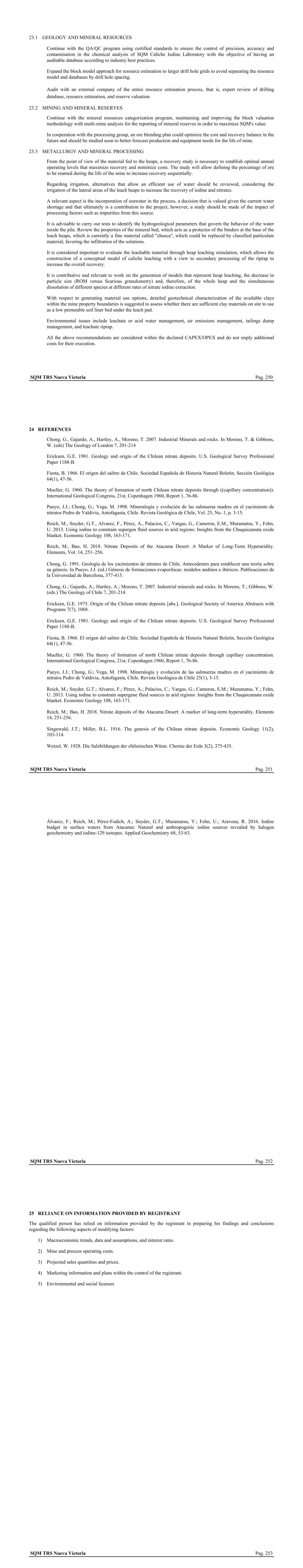 23.1 GEOLOGY AND MINERAL RESOURCES Continue with the QA/QC program using certified standards to ensure the control of precision, accuracy and contamination in the chemical analysis of SQM Caliche Iodine Laboratory with the objective of having an auditable database according to industry best practices. Expand the block model approach for resource estimation to larger drill hole grids to avoid separating the resource model and databases by drill hole spacing. Audit with an external company of the entire resource estimation process, that is, expert review of drilling database, resource estimation, and reserve valuation 23.2 MINING AND MINERAL RESERVES Continue with the mineral resources categorization program, maintaining and improving the block valuation methodology with multi-mine analysis for the reporting of mineral reserves in order to maximize SQM's value. In cooperation with the processing group, an ore blending plan could optimize the cost and recovery balance in the future and should be studied soon to better forecast production and equipment needs for the life of mine. 23.3 METALLURGY AND MINERAL PROCESSING From the point of view of the material fed to the heaps, a recovery study is necessary to establish optimal annual operating levels that maximize recovery and minimize costs. The study will allow defining the percentage of ore to be reamed during the life of the mine to increase recovery sequentially. Regarding irrigation, alternatives that allow an efficient use of water should be reviewed, considering the irrigation of the lateral areas of the leach heaps to increase the recovery of iodine and nitrates. A relevant aspect is the incorporation of seawater in the process, a decision that is valued given the current water shortage and that ultimately is a contribution to the project, however, a study should be made of the impact of processing factors such as impurities from this source. It is advisable to carry out tests to identify the hydrogeological parameters that govern the behavior of the water inside the pile. Review the properties of the mineral bed, which acts as a protector of the binders at the base of the leach heaps, which is currently a fine material called "chusca", which could be replaced by classified particulate material, favoring the infiltration of the solutions. It is considered important to evaluate the leachable material through heap leaching simulation, which allows the construction of a conceptual model of caliche leaching with a view to secondary processing of the riprap to increase the overall recovery. It is contributive and relevant to work on the generation of models that represent heap leaching, the decrease in particle size (ROM versus Scarious granulometry) and, therefore, of the whole heap and the simultaneous dissolution of different species at different rates of nitrate iodine extraction. With respect to generating material use options, detailed geotechnical characterization of the available clays within the mine property boundaries is suggested to assess whether there are sufficient clay materials on site to use as a low permeable soil liner bed under the leach pad. Environmental issues include leachate or acid water management, air emissions management, tailings dump management, and leachate riprap. All the above recommendations are considered within the declared CAPEX/OPEX and do not imply additional costs for their execution. SQM TRS Nueva Victoria Pag. 250 24 REFERENCES Chong, G., Gajardo, A., Hartley, A., Moreno, T. 2007. Industrial Minerals and rocks. In Moreno, T. & Gibbons, W. (eds) The Geology of London 7, 201-214 Ericksen, G.E. 1981. Geology and origin of the Chilean nitrate deposits. U.S. Geological Survey Professional Paper 1188-B. Fiesta, B. 1966. El origen del salitre de Chile. Sociedad Española de Historia Natural Boletín, Sección Geológica 64(1), 47-56. Mueller, G. 1960. The theory of formation of north Chilean nitrate deposits through ((capillary concentration)). International Geological Congress, 21st, Copenhagen 1960, Report 1, 76-86. Pueyo, J.J.; Chong, G.; Vega, M. 1998. Mineralogía y evolución de las salmueras madres en el yacimiento de nitratos Pedro de Valdivia, Antofagasta, Chile. Revista Geológica de Chile, Vol. 25, No. 1, p. 3-15. Reich, M., Snyder, G.T., Alvarez, F., Pérez, A., Palacios, C., Vargas, G., Cameron, E.M., Muramatsu, Y., Fehn, U. 2013. Using iodine to constrain supergen fluid sources in arid regions: Insights from the Chuquicamata oxide blanket. Economic Geology 108, 163-171. Reich, M., Bao, H. 2018. Nitrate Deposits of the Atacama Desert: A Marker of Long-Term Hyperaridity. Elements, Vol. 14, 251–256. Chong, G. 1991. Geología de los yacimientos de nitratos de Chile. Antecedentes para establecer una teoría sobre su génesis. In Pueyo, J.J. (ed.) Génesis de formaciones evaporíticas: modelos andinos e ibéricos. Publicaciones de la Universidad de Barcelona, 377-415. Chong, G.; Gajardo, A.; Hartley, A.; Moreno, T. 2007. Industrial minerals and rocks. In Moreno, T.; Gibbons, W. (eds.) The Geology of Chile 7, 201-214. Ericksen, G.E. 1975. Origin of the Chilean nitrate deposits [abs.]. Geological Society of America Abstracts with Programs 7(7), 1068. Ericksen, G.E. 1981. Geology and origin of the Chilean nitrate deposits. U.S. Geological Survey Professional Paper 1188-B. Fiesta, B. 1966. El origen del salitre de Chile. Sociedad Española de Historia Natural Boletín, Sección Geológica 64(1), 47-56. Mueller, G. 1960. The theory of formation of north Chilean nitrate deposits through capillary concentration. International Geological Congress, 21st, Copenhagen 1960, Report 1, 76-86. Pueyo, J.J.; Chong, G.; Vega, M. 1998. Mineralogía y evolución de las salmueras madres en el yacimiento de nitratos Pedro de Valdivia, Antofagasta, Chile. Revista Geológica de Chile 25(1), 3-15. Reich, M.; Snyder, G.T.; Alvarez, F.; Pérez, A.; Palacios, C.; Vargas, G.; Cameron, E.M.; Muramatsu, Y.; Fehn, U. 2013. Us