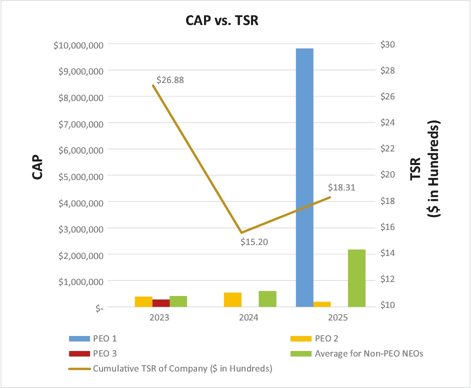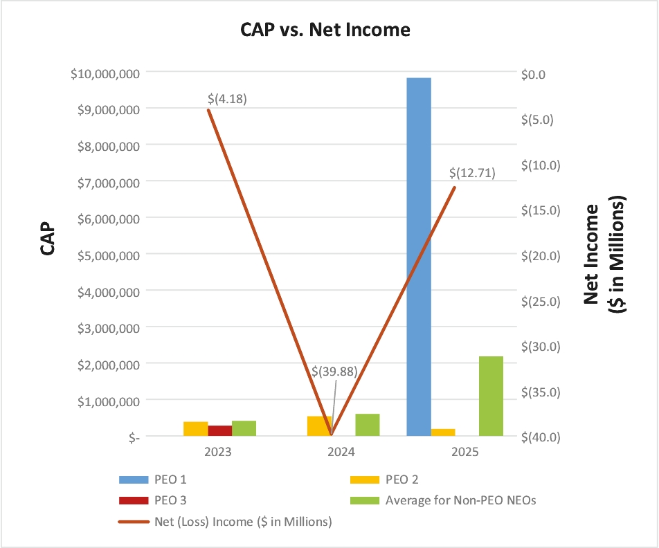 PAY VERSUS PERFORMANCE As required by Section 953(a) of the Dodd-Frank Wall Street Reform and Consumer Protection Act and Item 402(v) of Regulation S-K, we are providing the following tables and related disclosure to illustrate the relationship between executive compensation “actually paid” (as calculated herein) and certain measures of our financial performance. Pay Versus Performance | | | | | | | | | | | | | | | | | | | | | | | | | | | | | | | 2025 | | | $7,303,382 | | | $187,959 | | | $— | | | $9,821,089 | | | $187,959 | | | $— | | | $1,357,557 | | | $2,177,557 | | | $18.31 | | | $(12,710) | 2024 | | | $— | | | $659,887 | | | $— | | | $— | | | $537,816 | | | $— | | | $598,579 | | | $598,579 | | | $15.20 | | | $(39,882) | 2023 | | | $— | | | $434,296 | | | $274,285 | | | $— | | | $384,860 | | | $274,285 | | | $409,615 | | | $409,615 | | | $26.88 | | | $(4,179) | | | | | | | | | | | | | | | | | | | | | | | | | | | | | | | |
