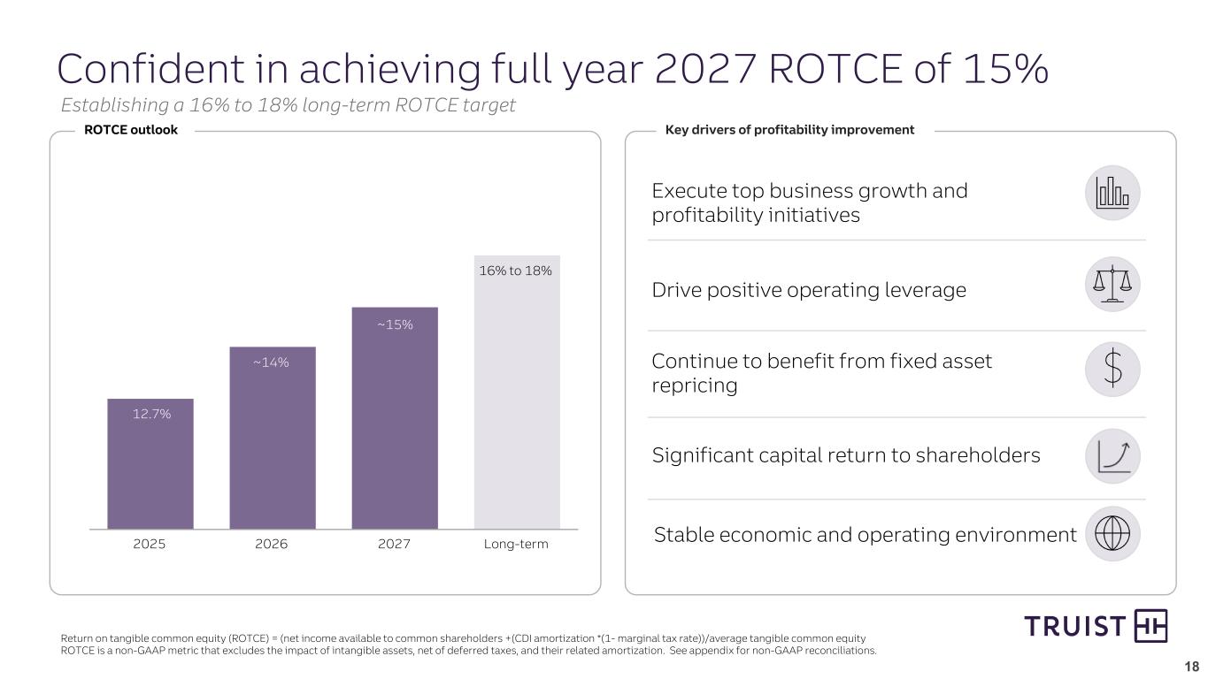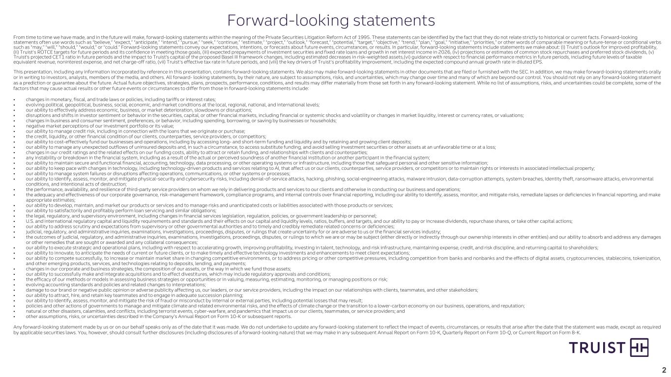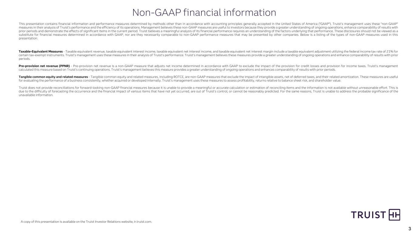 2 From time to time we have made, and in the future will make, forward-looking statements within the meaning of the Private Securities Litigation Reform Act of 1995. These statements can be identified by the fact that they do not relate strictly to historical or current facts. Forward-looking statements often use words such as “believe,” “expect,” “anticipate,” “intend,” “pursue,” “seek,” “continue,” “estimate,” “project,” “outlook,” “forecast,” “potential,” “target,” “objective,” “trend,” “plan,” “goal,” “initiative,” “priorities,” or other words of comparable meaning or future-tense or conditional verbs such as “may,” “will,” “should,” “would,” or “could.” Forward-looking statements convey our expectations, intentions, or forecasts about future events, circumstances, or results. In particular, forward-looking statements include statements we make about: (i) Truist’s outlook for improved profitability, (ii) Truist’s ROTCE targets for future periods and its confidence in meeting those goals, (iii) expected prepayments of investment securities and fixed rate loans and growth in net interest income in 2026, (iv) projections or estimates of common stock repurchases and preferred stock dividends, (v) Truist's projected CET1 ratio in future periods and the impact to Truist's capital of the proposed Basel III framework changes, including estimated decreases in risk-weighted assets,(vi) guidance with respect to financial performance metrics in future periods, including future levels of taxable equivalent revenue, noninterest expense, and net charge-off ratio, (vii) Truist’s effective tax rate in future periods, and (viii) the key drivers of Truist’s profitability improvement, including the expected compound annual growth rate in diluted EPS. This presentation, including any information incorporated by reference in this presentation, contains forward-looking statements. We also may make forward-looking statements in other documents that are filed or furnished with the SEC. In addition, we may make forward-looking statements orally or in writing to investors, analysts, members of the media, and others. All forward- looking statements, by their nature, are subject to assumptions, risks, and uncertainties, which may change over time and many of which are beyond our control. You should not rely on any forward-looking statement as a prediction or guarantee about the future. Actual future objectives, strategies, plans, prospects, performance, conditions, and results may differ materially from those set forth in any forward-looking statement. While no list of assumptions, risks, and uncertainties could be complete, some of the factors that may cause actual results or other future events or circumstances to differ from those in forward-looking statements include: • changes in monetary, fiscal, and trade laws or policies, including tariffs or interest rates; • evolving political, geopolitical, business, social, economic, and market conditions at the local, regional, national, and international levels; • our ability to effectively address economic, business, or market deterioration, slowdowns or disruptions; • disruptions and shifts in investor sentiment or behavior in the securities, capital, or other financial markets, including financial or systemic shocks and volatility or changes in market liquidity, interest or currency rates, or valuations; • changes in business and consumer sentiment, preferences, or behavior, including spending, borrowing, or saving by businesses or households; • negative market perceptions of our investment portfolio or its value; • our ability to manage credit risk, including in connection with the loans that we originate or purchase; • the credit, liquidity, or other financial condition of our clients, counterparties, service providers, or competitors; • our ability to cost-effectively fund our businesses and operations, including by accessing long- and short-term funding and liquidity and by retaining and growing client deposits; • our ability to manage any unexpected outflows of uninsured deposits and, in such a circumstance, to access substitute funding, and avoid selling investment securities or other assets at an unfavorable time or at a loss; • changes in our credit ratings and the related effects on our funding costs, ability to attract or retain funding, and relationships with clients and counterparties; • any instability or breakdown in the financial system, including as a result of the actual or perceived soundness of another financial institution or another participant in the financial system; • our ability to maintain secure and functional financial, accounting, technology, data processing, or other operating systems or infrastructure, including those that safeguard personal and other sensitive information; • our ability to keep pace with changes in technology, including technology-driven products and services relating to AI, that affect us or our clients, counterparties, service providers, or competitors or to maintain rights or interests in associated intellectual property; • our ability to manage system failures or disruptions affecting operations, communications, or other systems or processes; • our ability to identify, assess, monitor, and mitigate physical-security and cybersecurity risks, including denial-of-service attacks, hacking, phishing, social-engineering attacks, malware intrusion, data-corruption attempts, system breaches, identity theft, ransomware attacks, environmental conditions, and intentional acts of destruction; • the performance, availability, and resilience of third-party service providers on whom we rely in delivering products and services to our clients and otherwise in conducting our business and operations; • the adequacy and effectiveness of our corporate governance, risk-management framework, com