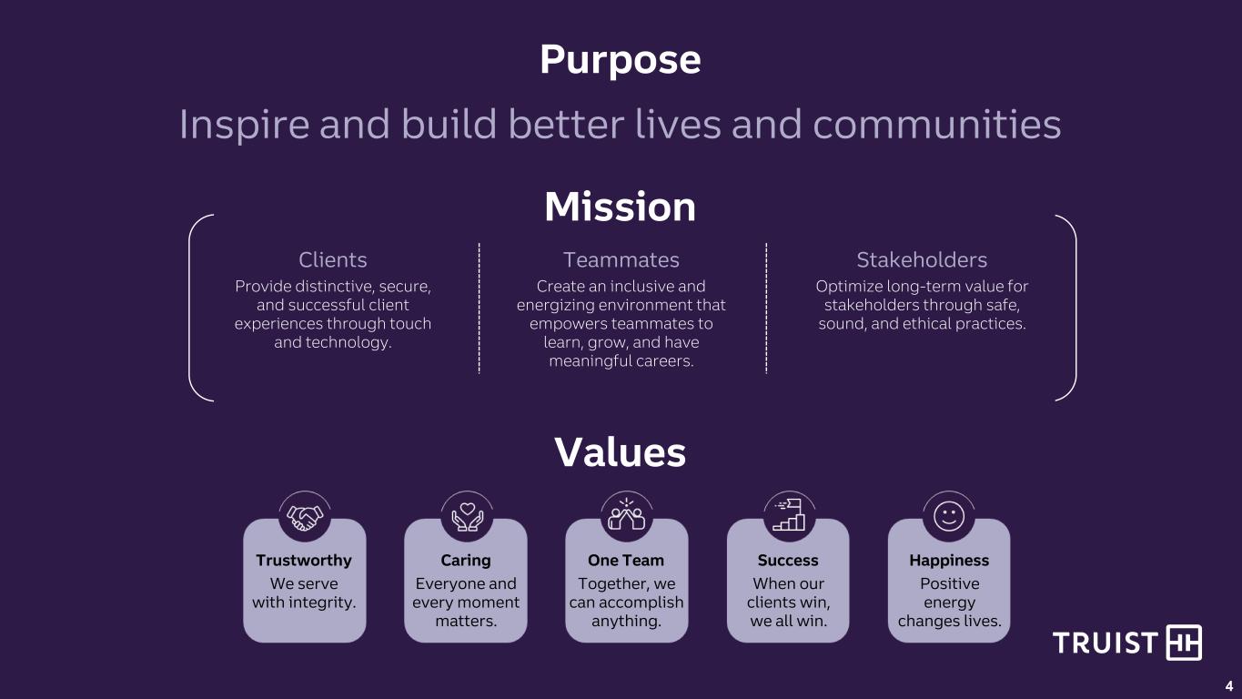 3 Non-GAAP financial information This presentation contains financial information and performance measures determined by methods other than in accordance with accounting principles generally accepted in the United States of America ("GAAP"). Truist’s management uses these “non-GAAP” measures in their analysis of Truist’s performance and the efficiency of its operations. Management believes these non-GAAP measures are useful to investors because they provide a greater understanding of ongoing operations, enhance comparability of results with prior periods and demonstrate the effects of significant items in the current period. Truist believes a meaningful analysis of its financial performance requires an understanding of the factors underlying that performance. These disclosures should not be viewed as a substitute for financial measures determined in accordance with GAAP, nor are they necessarily comparable to non-GAAP performance measures that may be presented by other companies. Below is a listing of the types of non-GAAP measures used in this presentation: Taxable-Equivalent Measures - Taxable equivalent revenue, taxable equivalent interest income, taxable equivalent net interest income, and taxable equivalent net interest margin include a taxable equivalent adjustment utilizing the federal income tax rate of 21% for certain tax-exempt instruments. Truist’s management uses these measures in their analysis of Truist’s performance. Truist’s management believes these measures provide a greater understanding of ongoing operations and enhance comparability of results with prior periods. Pre-provision net revenue (PPNR) - Pre-provision net revenue is a non-GAAP measure that adjusts net income determined in accordance with GAAP to exclude the impact of the provision for credit losses and provision for income taxes. Truist’s management calculated this measure based on Truist’s continuing operations. Truist’s management believes this measure provides a greater understanding of ongoing operations and enhances comparability of results with prior periods. Tangible common equity and related measures - Tangible common equity and related measures, including ROTCE, are non-GAAP measures that exclude the impact of intangible assets, net of deferred taxes, and their related amortization. These measures are useful for evaluating the performance of a business consistently, whether acquired or developed internally. Truist’s management uses these measures to assess profitability, returns relative to balance sheet risk, and shareholder value. Truist does not provide reconciliations for forward-looking non-GAAP financial measures because it is unable to provide a meaningful or accurate calculation or estimation of reconciling items and the information is not available without unreasonable effort. This is due to the difficulty of forecasting the occurrence and the financial impact of various items that have not yet occurred, are out of Truist’s control, or cannot be reasonably predicted. For the same reasons, Truist is unable to address the probable significance of the unavailable information. A copy of this presentation is available on the Truist Investor Relations website, ir.truist.com.