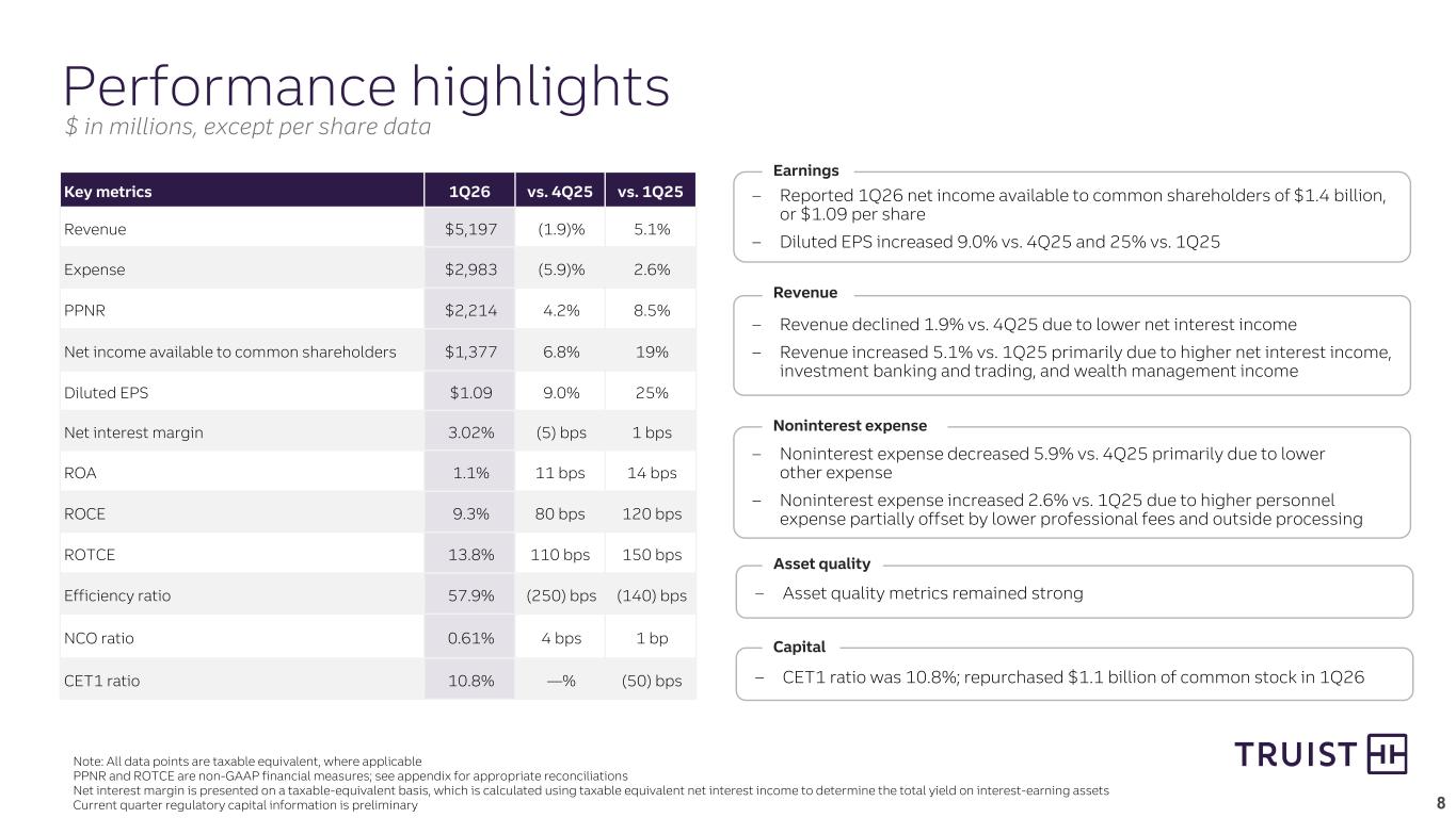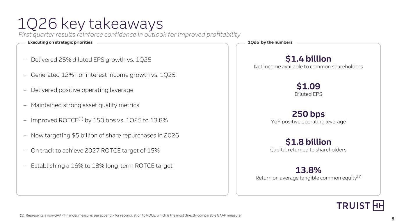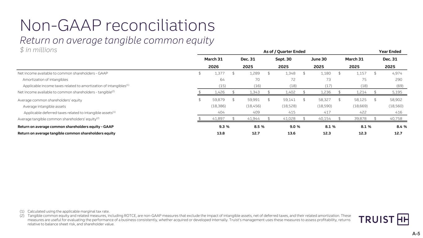A-5 Non-GAAP reconciliations Return on average tangible common equity $ in millions As of / Quarter Ended Year Ended March 31 Dec. 31 Sept. 30 June 30 March 31 Dec. 31 2026 2025 2025 2025 2025 2025 Net income available to common shareholders - GAAP $ 1,377 $ 1,289 $ 1,348 $ 1,180 $ 1,157 $ 4,974 Amortization of intangibles 64 70 72 73 75 290 Applicable income taxes related to amortization of intangibles(1) (15) (16) (18) (17) (18) (69) Net income available to common shareholders - tangible(2) $ 1,426 $ 1,343 $ 1,402 $ 1,236 $ 1,214 $ 5,195 Average common shareholders’ equity $ 59,879 $ 59,991 $ 59,141 $ 58,327 $ 58,125 $ 58,902 Average intangible assets (18,386) (18,456) (18,528) (18,590) (18,669) (18,560) Applicable deferred taxes related to intangible assets(1) 404 409 415 417 422 416 Average tangible common shareholders' equity(2) $ 41,897 $ 41,944 $ 41,028 $ 40,154 $ 39,878 $ 40,758 Return on average common shareholders equity - GAAP 9.3 % 8.5 % 9.0 % 8.1 % 8.1 % 8.4 % Return on average tangible common shareholders equity 13.8 12.7 13.6 12.3 12.3 12.7 (1) Calculated using the applicable marginal tax rate. (2) Tangible common equity and related measures, including ROTCE, are non-GAAP measures that exclude the impact of intangible assets, net of deferred taxes, and their related amortization. These measures are useful for evaluating the performance of a business consistently, whether acquired or developed internally. Truist’s management uses these measures to assess profitability, returns relative to balance sheet risk, and shareholder value.