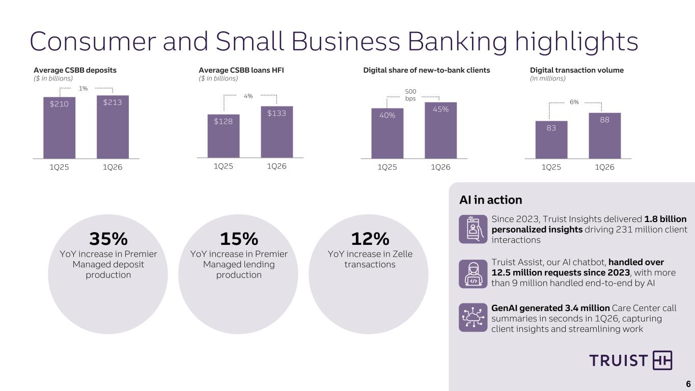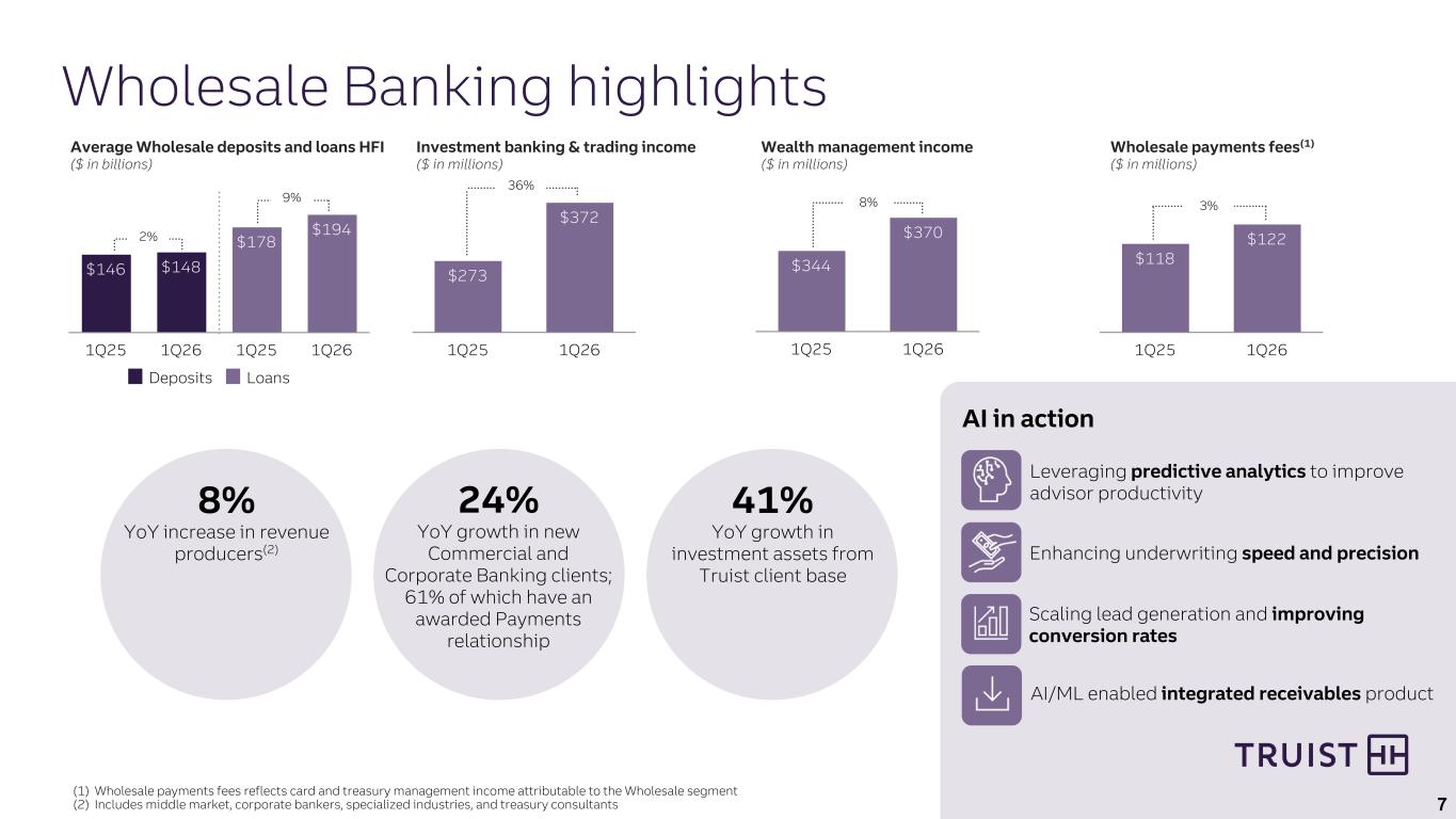 6 40% 45% 1Q25 1Q26 $210 $213 1Q25 1Q26 Consumer and Small Business Banking highlights AI in action Digital share of new-to-bank clients Digital transaction volume (in millions) 35% YoY increase in Premier Managed deposit production $128 $133 1Q25 1Q26 83 88 1Q25 1Q26 500 bps 6% 1% 4% 12% YoY increase in Zelle transactions GenAI generated 3.4 million Care Center call summaries in seconds in 1Q26, capturing client insights and streamlining work Truist Assist, our AI chatbot, handled over 12.5 million requests since 2023, with more than 9 million handled end-to-end by AI Since 2023, Truist Insights delivered 1.8 billion personalized insights driving 231 million client interactions Average CSBB loans HFI ($ in billions) 15% YoY increase in Premier Managed lending production Average CSBB deposits ($ in billions)