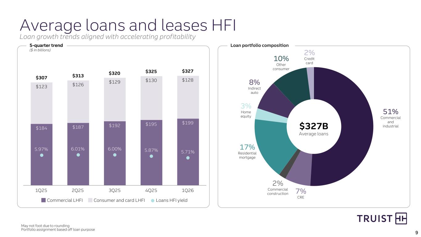 8 Note: All data points are taxable equivalent, where applicable PPNR and ROTCE are non-GAAP financial measures; see appendix for appropriate reconciliations Net interest margin is presented on a taxable-equivalent basis, which is calculated using taxable equivalent net interest income to determine the total yield on interest-earning assets Current quarter regulatory capital information is preliminary $ in millions, except per share data Key metrics 1Q26 vs. 4Q25 vs. 1Q25 Revenue $5,197 (1.9)% 5.1% Expense $2,983 (5.9)% 2.6% PPNR $2,214 4.2% 8.5% Net income available to common shareholders $1,377 6.8% 19% Diluted EPS $1.09 9.0% 25% Net interest margin 3.02% (5) bps 1 bps ROA 1.1% 11 bps 14 bps ROCE 9.3% 80 bps 120 bps ROTCE 13.8% 110 bps 150 bps Efficiency ratio 57.9% (250) bps (140) bps NCO ratio 0.61% 4 bps 1 bp CET1 ratio 10.8% —% (50) bps Performance highlights – CET1 ratio was 10.8%; repurchased $1.1 billion of common stock in 1Q26 – Noninterest expense decreased 5.9% vs. 4Q25 primarily due to lower other expense – Noninterest expense increased 2.6% vs. 1Q25 due to higher personnel expense partially offset by lower professional fees and outside processing – Revenue declined 1.9% vs. 4Q25 due to lower net interest income – Revenue increased 5.1% vs. 1Q25 primarily due to higher net interest income, investment banking and trading, and wealth management income Capital Noninterest expense – Reported 1Q26 net income available to common shareholders of $1.4 billion, or $1.09 per share – Diluted EPS increased 9.0% vs. 4Q25 and 25% vs. 1Q25 Earnings Revenue – Asset quality metrics remained strong Asset quality