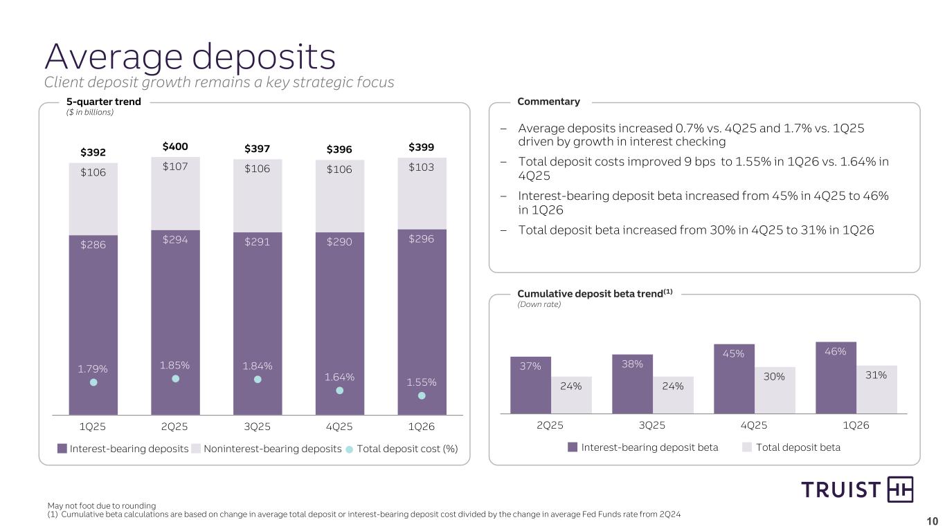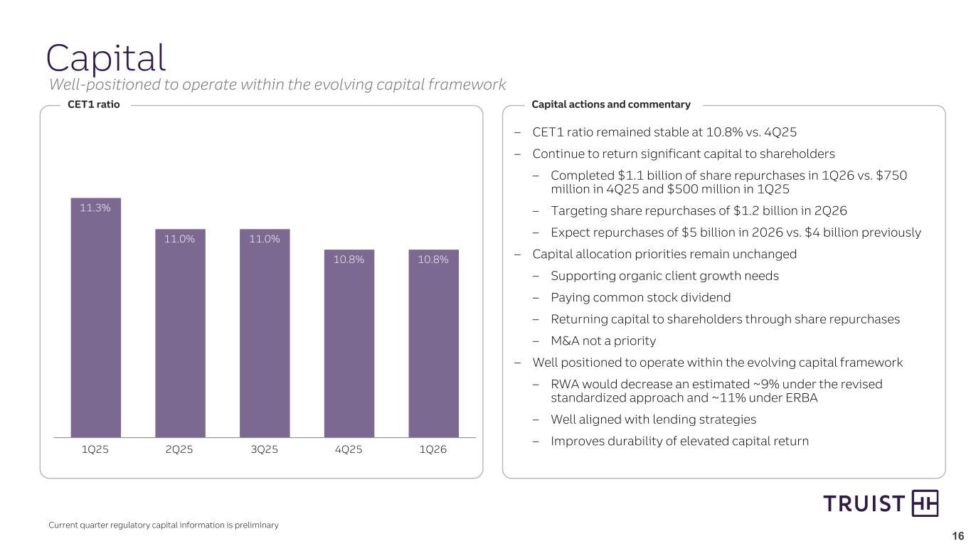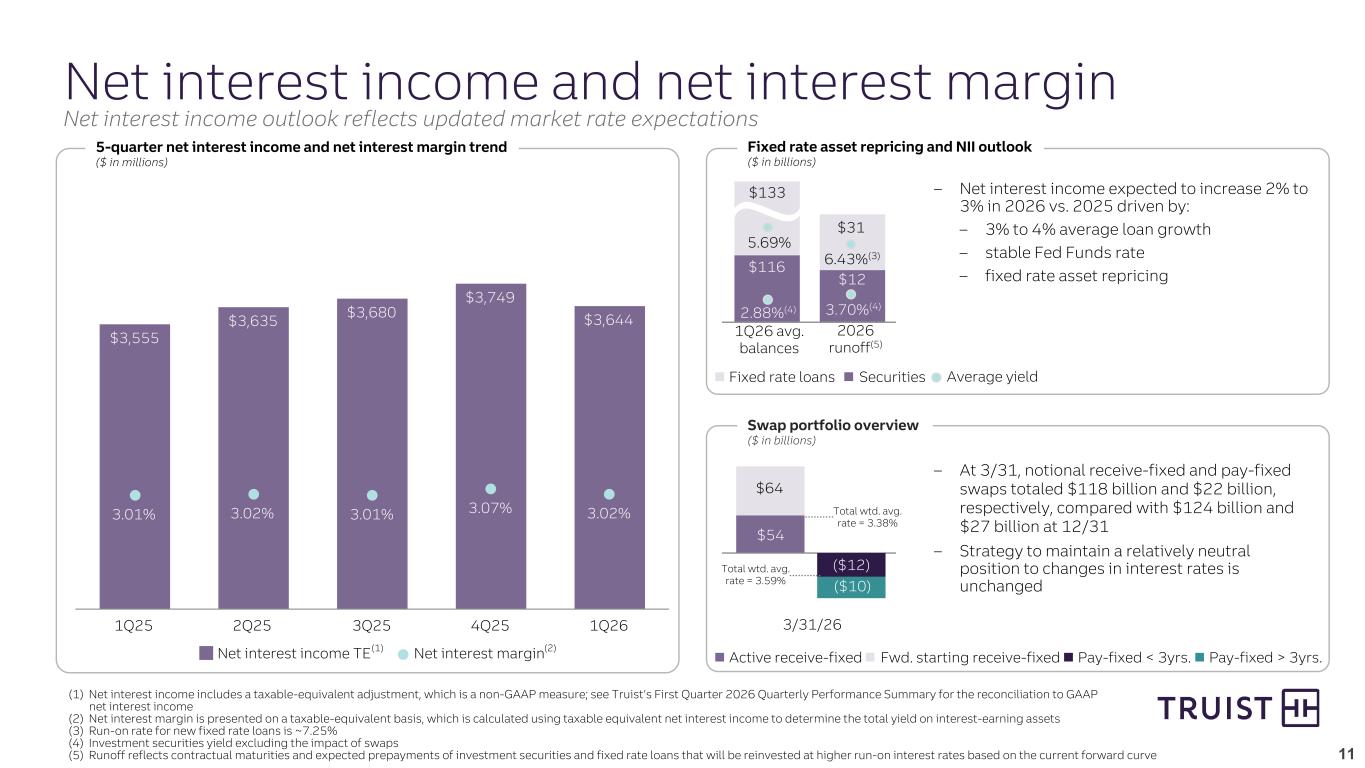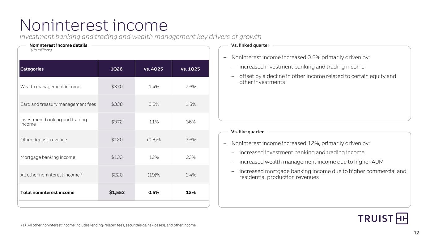 11 Active receive-fixed $3,555 $3,635 $3,680 $3,749 $3,644 3.01% 3.02% 3.01% 3.07% 3.02% Net interest income TE Net interest margin 1Q25 2Q25 3Q25 4Q25 1Q26 Fwd. starting receive-fixed Pay-fixed < 3yrs. Net interest income and net interest margin Fixed rate asset repricing and NII outlook ($ in billions) Swap portfolio overview ($ in billions) (1) Net interest income includes a taxable-equivalent adjustment, which is a non-GAAP measure; see Truist’s First Quarter 2026 Quarterly Performance Summary for the reconciliation to GAAP net interest income (2) Net interest margin is presented on a taxable-equivalent basis, which is calculated using taxable equivalent net interest income to determine the total yield on interest-earning assets (3) Run-on rate for new fixed rate loans is ~7.25% (4) Investment securities yield excluding the impact of swaps (5) Runoff reflects contractual maturities and expected prepayments of investment securities and fixed rate loans that will be reinvested at higher run-on interest rates based on the current forward curve 3/31/26 Pay-fixed > 3yrs. 5-quarter net interest income and net interest margin trend ($ in millions) (1) $54 $64 Total wtd. avg. rate = 3.38% ($12)Total wtd. avg. rate = 3.59% ($10) $137 Fixed rate loans Securities Average yield $12 $31 2.88%(4) 3.70%(4) 6.43%(3) 2026 runoff(5) ~ 1Q26 avg. balances $133 5.69% $116 – Net interest income expected to increase 2% to 3% in 2026 vs. 2025 driven by: – 3% to 4% average loan growth – stable Fed Funds rate – fixed rate asset repricing – At 3/31, notional receive-fixed and pay-fixed swaps totaled $118 billion and $22 billion, respectively, compared with $124 billion and $27 billion at 12/31 – Strategy to maintain a relatively neutral position to changes in interest rates is unchanged Net interest income outlook reflects updated market rate expectations (2)