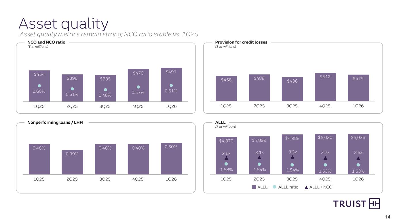 13 – Noninterest expense increased 2.6%, primarily driven by: – higher personnel expense due to increased salaries, incentives, and employee benefits related to hiring – partially offset by lower professional fees and outside processing Noninterest expense Noninterest expense details ($ in millions) (1) All other noninterest expense includes amortization of intangibles, marketing and customer development, regulatory costs, and other expense Vs. linked quarter Vs. like quarter ($5,212) – Noninterest expense decreased 5.9%, primarily driven by: – lower other expense driven by an incremental legal accrual in 4Q25 – lower personnel expense primarily due to lower incentives – partially offset by higher regulatory charges due to an FDIC special assessment credit in 4Q25 Categories 1Q26 vs. 4Q25 vs. 1Q25 Personnel expense $1,727 (5.0)% 7.7% Professional fees and outside processing $313 (7.1)% (14)% Software expense $230 (5.0)% —% Net occupancy expense $179 1.7% 6.5% Equipment expense $85 (5.6)% 3.7% All other noninterest expense(1) $449 (11)% (2.0)% Total noninterest expense $2,983 (5.9)% 2.6% Noninterest expense growth remains well controlled