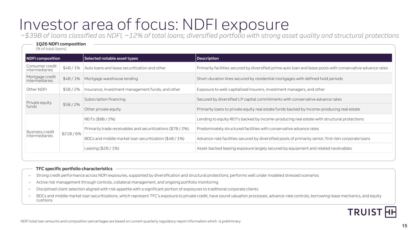 15 – Strong credit performance across NDFI exposures, supported by diversification and structural protections; performs well under modeled stressed scenarios – Active risk management through controls, collateral management, and ongoing portfolio monitoring – Disciplined client selection aligned with risk appetite with a significant portion of exposures to traditional corporate clients – BDCs and middle market loan securitizations, which represent TFC’s exposure to private credit, have sound valuation processes, advance-rate controls, borrowing-base mechanics, and equity cushions Investor area of focus: NDFI exposure 1Q26 NDFI composition (% of total loans) TFC specific portfolio characteristics ~$39B of loans classified as NDFI, ~12% of total loans; diversified portfolio with strong asset quality and structural protections NDFI total loan amounts and composition percentages are based on current quarterly regulatory report information which is preliminary NDFI composition Selected notable asset types Description Consumer credit intermediaries $4B / 1% Auto loans and lease securitization and other Primarily facilities secured by diversified prime auto loan and lease pools with conservative advance rates Mortgage credit intermediaries $4B / 1% Mortgage warehouse lending Short‑duration lines secured by residential mortgages with defined hold periods Other NDFI $5B / 2% Insurance, investment management funds, and other Exposure to well-capitalized insurers, investment managers, and other Private equity funds $5B / 2% Subscription financing Secured by diversified LP capital commitments with conservative advance rates Other private equity Primarily loans to private equity real estate funds backed by income‑producing real estate Business credit intermediaries $21B / 6% REITs ($8B / 2%) Lending to equity REITs backed by income‑producing real estate with structural protections Primarily trade receivables and securitizations ($7B / 2%) Predominately structured facilities with conservative advance rates BDCs and middle market loan securitization ($4B / 1%) Advance‑rate facilities secured by diversified pools of primarily senior, first‑lien corporate loans Leasing ($2B / 1%) Asset‑backed leasing exposure largely secured by equipment and related receivables
