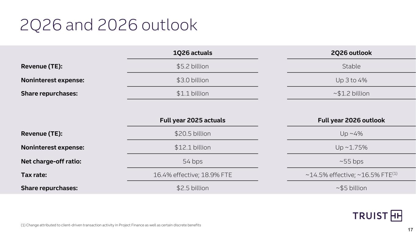 16 11.3% 11.0% 11.0% 10.8% 10.8% 1Q25 2Q25 3Q25 4Q25 1Q26 Capital Capital actions and commentary $0.6 $0.6 CET1 ratio Current quarter regulatory capital information is preliminary 7.0% min. req. effective 10/1/25 – CET1 ratio remained stable at 10.8% vs. 4Q25 – Continue to return significant capital to shareholders – Completed $1.1 billion of share repurchases in 1Q26 vs. $750 million in 4Q25 and $500 million in 1Q25 – Targeting share repurchases of $1.2 billion in 2Q26 – Expect repurchases of $5 billion in 2026 vs. $4 billion previously – Capital allocation priorities remain unchanged – Supporting organic client growth needs – Paying common stock dividend – Returning capital to shareholders through share repurchases – M&A not a priority – Well positioned to operate within the evolving capital framework – RWA would decrease an estimated ~9% under the revised standardized approach and ~11% under ERBA – Well aligned with lending strategies – Improves durability of elevated capital return Well-positioned to operate within the evolving capital framework