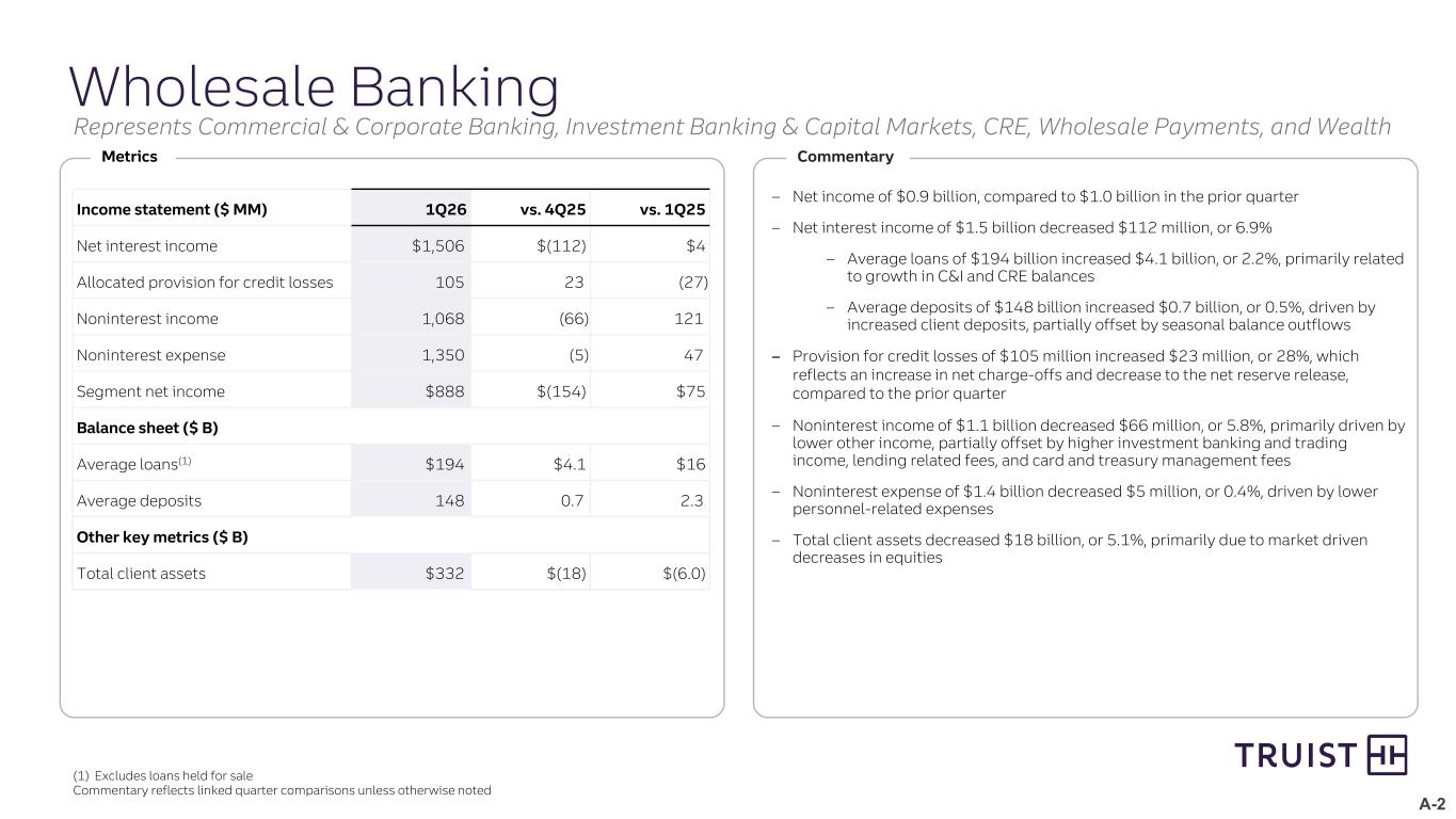 A-2 Wholesale Banking (1) Excludes loans held for sale Commentary reflects linked quarter comparisons unless otherwise noted – Net income of $0.9 billion, compared to $1.0 billion in the prior quarter – Net interest income of $1.5 billion decreased $112 million, or 6.9% – Average loans of $194 billion increased $4.1 billion, or 2.2%, primarily related to growth in C&I and CRE balances – Average deposits of $148 billion increased $0.7 billion, or 0.5%, driven by increased client deposits, partially offset by seasonal balance outflows – Provision for credit losses of $105 million increased $23 million, or 28%, which reflects an increase in net charge-offs and decrease to the net reserve release, compared to the prior quarter – Noninterest income of $1.1 billion decreased $66 million, or 5.8%, primarily driven by lower other income, partially offset by higher investment banking and trading income, lending related fees, and card and treasury management fees – Noninterest expense of $1.4 billion decreased $5 million, or 0.4%, driven by lower personnel-related expenses – Total client assets decreased $18 billion, or 5.1%, primarily due to market driven decreases in equities Metrics Commentary Income statement ($ MM) 1Q26 vs. 4Q25 vs. 1Q25 Net interest income $1,506 $(112) $4 Allocated provision for credit losses 105 23 (27) Noninterest income 1,068 (66) 121 Noninterest expense 1,350 (5) 47 Segment net income $888 $(154) $75 Balance sheet ($ B) Average loans(1) $194 $4.1 $16 Average deposits 148 0.7 2.3 Other key metrics ($ B) Total client assets $332 $(18) $(6.0) Represents Commercial & Corporate Banking, Investment Banking & Capital Markets, CRE, Wholesale Payments, and Wealth