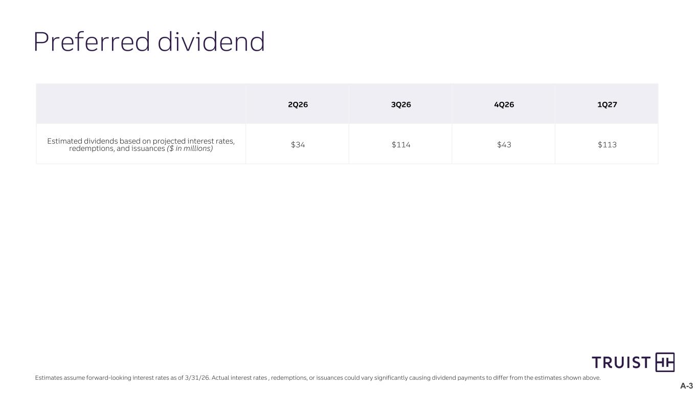 A-3 Preferred dividend 2Q26 3Q26 4Q26 1Q27 Estimated dividends based on projected interest rates, redemptions, and issuances ($ in millions) $34 $114 $43 $113 Estimates assume forward-looking interest rates as of 3/31/26. Actual interest rates , redemptions, or issuances could vary significantly causing dividend payments to differ from the estimates shown above.
