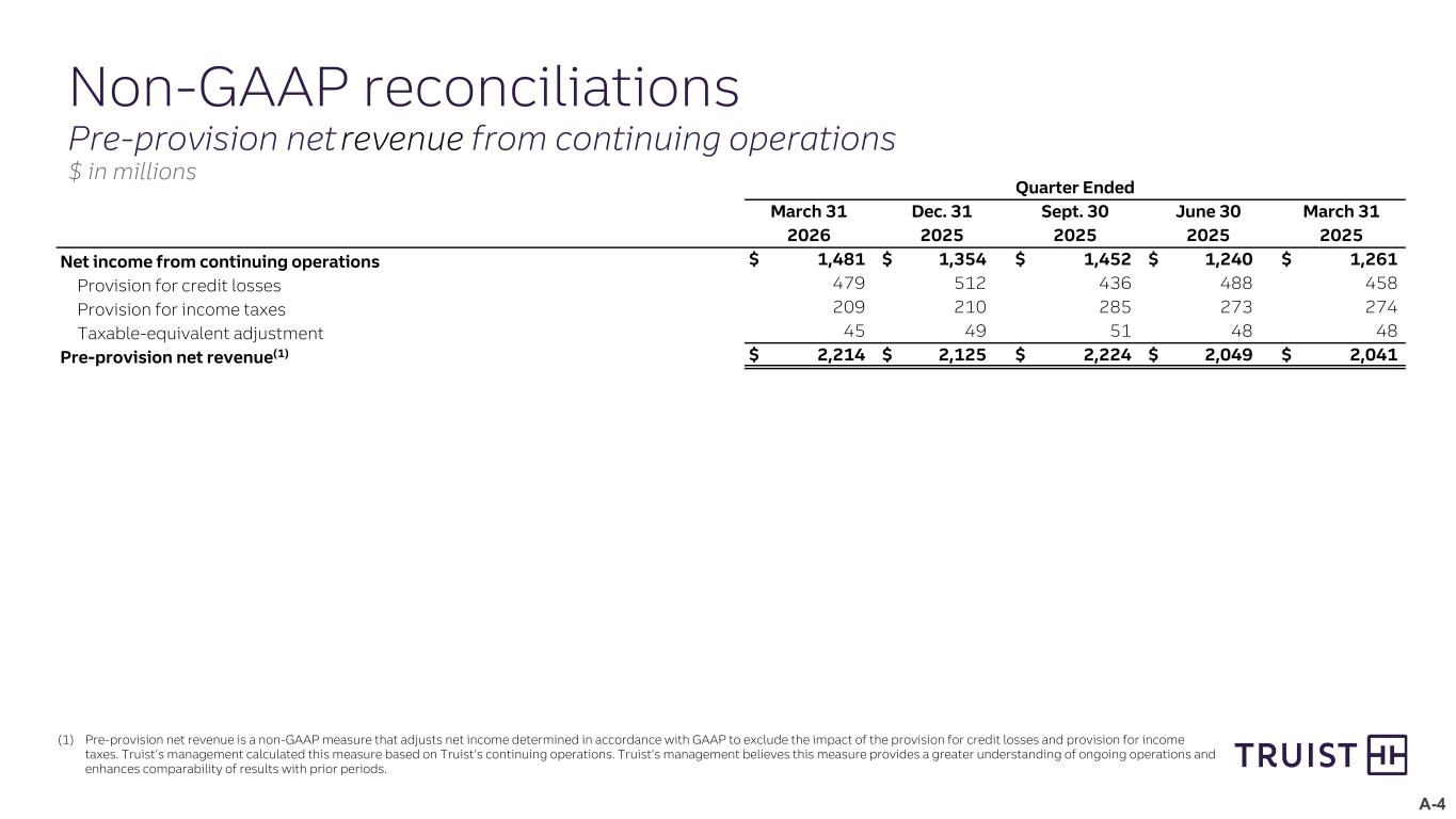 A-4 Non-GAAP reconciliations Pre-provision net revenue from continuing operations $ in millions (1) Pre-provision net revenue is a non-GAAP measure that adjusts net income determined in accordance with GAAP to exclude the impact of the provision for credit losses and provision for income taxes. Truist’s management calculated this measure based on Truist’s continuing operations. Truist’s management believes this measure provides a greater understanding of ongoing operations and enhances comparability of results with prior periods. Quarter Ended March 31 Dec. 31 Sept. 30 June 30 March 31 2026 2025 2025 2025 2025 Net income from continuing operations $ 1,481 $ 1,354 $ 1,452 $ 1,240 $ 1,261 Provision for credit losses 479 512 436 488 458 Provision for income taxes 209 210 285 273 274 Taxable-equivalent adjustment 45 49 51 48 48 Pre-provision net revenue(1) $ 2,214 $ 2,125 $ 2,224 $ 2,049 $ 2,041