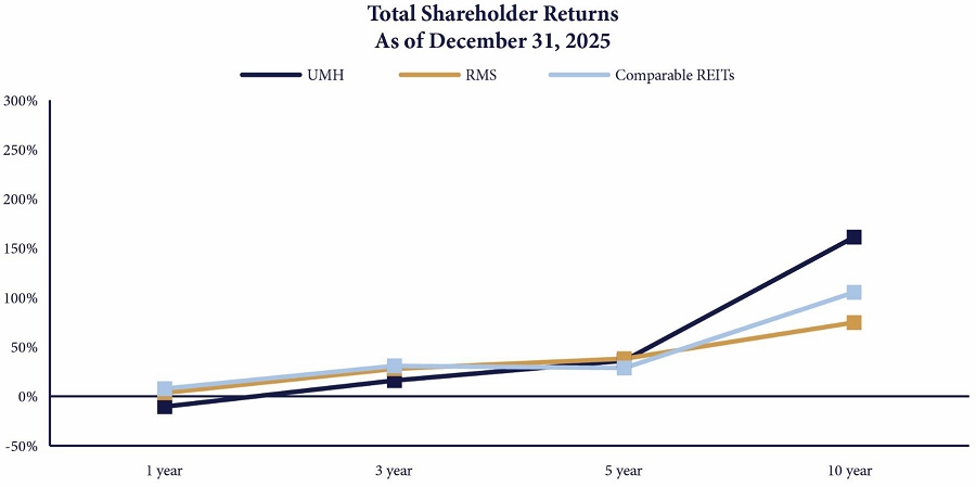 This Proxy Statement and the accompanying Proxy Card are being distributed on or about April 17, 2026, to shareholders of record as of the close of business on Friday, March 6, 2026. Unless the context requires otherwise, references in this Proxy Statement to “UMH”, “we”, “our”, “us” and the “Company” refer to UMH Properties, Inc. and its consolidated subsidiaries. A copy of the Company’s 2025 Annual Report, including financial statements, is being mailed herewith, and is available on the Company’s website at www.umh.reit.