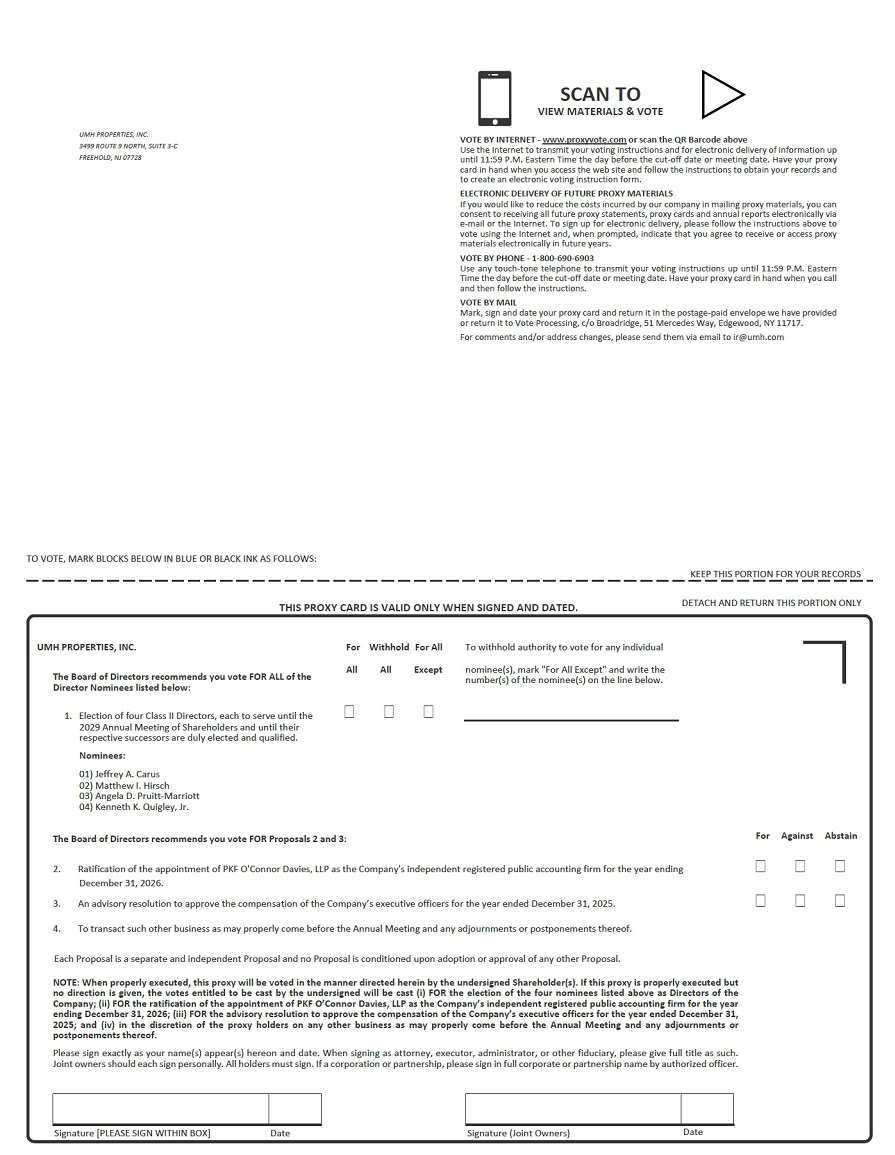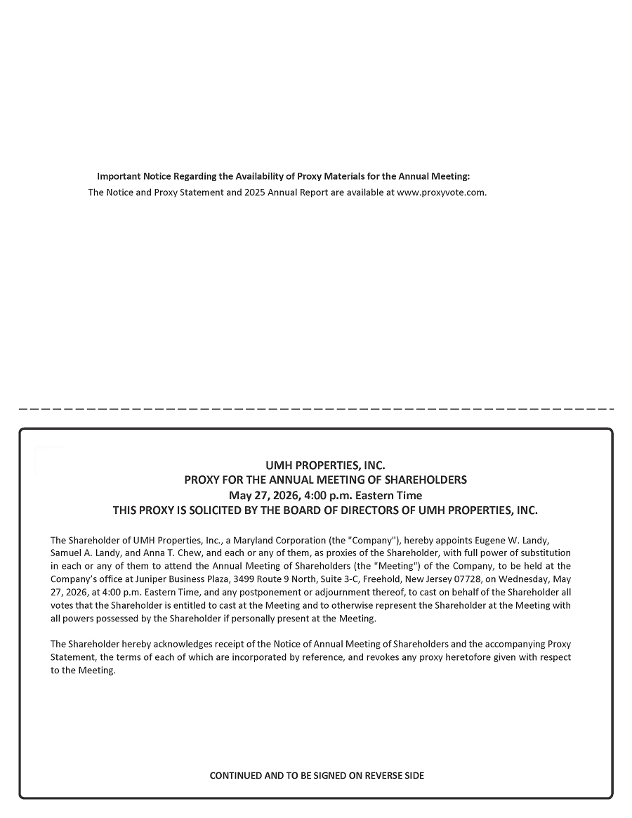 Notice is hereby given that the Annual Meeting of Shareholders (the “Annual Meeting”) of UMH Properties, Inc., a Maryland corporation (the “Company”), will be held on Wednesday, May 27, 2026, at 4:00 p.m., Eastern Time, at the offices of the Company at Juniper Business Plaza, 3499 Route 9 North, Suite 3-C, Freehold, New Jersey 07728, to consider and vote on the following matters, each as more fully described in the accompanying proxy statement: