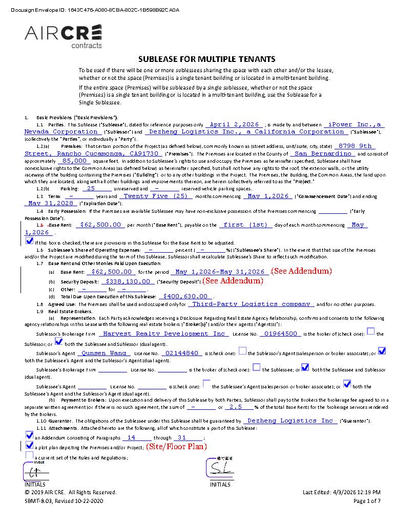 Sublessor's Brokerage Firm Harvest Realty Development Inc License No. 01964500 is the broker of (check one): the Sublessor; or both the Sublessee and Sublessor (dual agent). the Sublessor's Agent (salesperson or broker associate); or Sublessor's Agent Qunsen Wang License No. 02144840 is (check one): both the Sublessee's Agent and the Sublessor's Agent (dual agent). Sublessee's Brokerage Firm License No. is the broker of (check one): (dual agent). SUBLEASE FOR MULTIPLE TENANTS To be used if there will be one or more sublessees sharing the space with each other and/or the lessee, whether or not the space (Premises) is a single tenant building or is located in a multi - tenant building. If the entire space (Premises) will be subleased by a single sublessee, whether or not the space (Premises) is a single tenant building or is located in a multi - tenant building, use the Sublease for a Single Sublessee. 1. Basic Provisions ("Basic Provisions"). 1. Parties. This Sublease (" Sublease "), dated for reference purposes only April 2,2026 , is made by and between iPower Inc.,a Nevada Corporation (" Sublessor ") and Dezheng Logistics Inc., a California Corporation (" Sublessee "), (collectively the " Parties ", or individually a " Party "). 1.2(a) Premises : That certain portion of the Project (as defined below), commonly known as (street address, unit/suite, city, state) 8798 9th Street, Rancho Cucamonga, CA91730 (" Premises "). The Premises are located in the County of San Bernardino and consist of approximately 85,000 square feet. In addition to Sublessee's rights to use and occupy the Premises as hereinafter specified, Sublessee shall have nonexclusive rights to the Common Areas (as defined below) as hereinafter specified, but shall not have any rights to the roof, the exterior walls, or the utility raceways of the building containing the Premises (" Building ") or to any other buildings in the Project. The Premises, the Building, the Common Areas, the land upon which they are located, along with all other buildings and improvements thereon, are herein collectively referred to as the " Project ." 1.2(b) Parking : 25 unreserved and - reserved vehicle parking spaces. 3. Term : - years and Twenty Five (25) months commencing May 1,2026 (" Commencement Date ") and ending May 31,2028 (" Expiration Date "). 4. Early Possession : If the Premises are available Sublessee may have non - exclusive possession of the Premises commencing (" Early Possession Date "). 5. Base Rent : $62,500.00 per month (" Base Rent "), payable on the first (1st) day of each month commencing May 1,2026 . If this box is checked, there are provisions in this Sublease for the Base Rent to be adjusted. 6. Sublessee's Share of Operating Expenses : - percent ( - %) (" Sublessee's Share "). In the event that that size of the Premises and/or the Project are modified during the term of this Sublease, Sublessor shall recalculate Sublessee's Share to reflect such modification. 7. Base Rent and Other Monies Paid Upon Execution : (a) Base Rent: $62,500.00 for the period May 1,2026 - May 31,2026 . (See Addendum) (b) Security Deposit: $338,130.00 (" Security Deposit "). (See Addendum) (c) Other: - for - . (d) Total Due Upon Execution of this Sublease: $400,630.00 . 8. Agreed Use : The Premises shall be used and occupied only for Third - Party Logistics company and for no other purposes. 9. Real Estate Brokers. (a) Representation. Each Party acknowledges receiving a Disclosure Regarding Real Estate Agency Relationship, confirms and consents to the following agency relationships in this Lease with the following real estate brokers (" Broker(s) ") and/or their agents ("Agent(s)"): the Sublessee; or both the Sublessee and Sublessor Sublessee's Agent License No . is (check one) : the Sublessee's Agent (salesperson or broker associate) ; or both the Sublessee's Agent and the Sublessor's Agent (dual agent) . (b) Payment to Brokers : Upon execution and delivery of this Sublease by both Parties, Sublessor shall pay to the Brokers the brokerage fee agreed to in a separate written agreement (or if there is no such agreement, the sum of - or 2 . 5 % of the total Base Rent) for the brokerage services rendered by the Brokers . 10. Guarantor . The obligations of the Sublessee under this Sublease shall be guaranteed by Dezheng Logistics Inc (" Guarantor "). 11. Attachments . Attached hereto are the following, all of which constitute a part of this Sublease: an Addendum consisting of Paragraphs 14 through 31 ; a plot plan depicting the Premises and/or Project; (Site/Floor Plan) a current set of the Rules and Regulations; Docusign Envelope ID: 1643C476 - A080 - 8CBA - 802C - 1B598B92CA0A INITIALS © 2019 AIR CRE. All Rights Reserved. SBMT - 8.03, Revised 10 - 22 - 2020 INITIALS Last Edited: 4/3/2026 12:19 PM Page 1 of 7